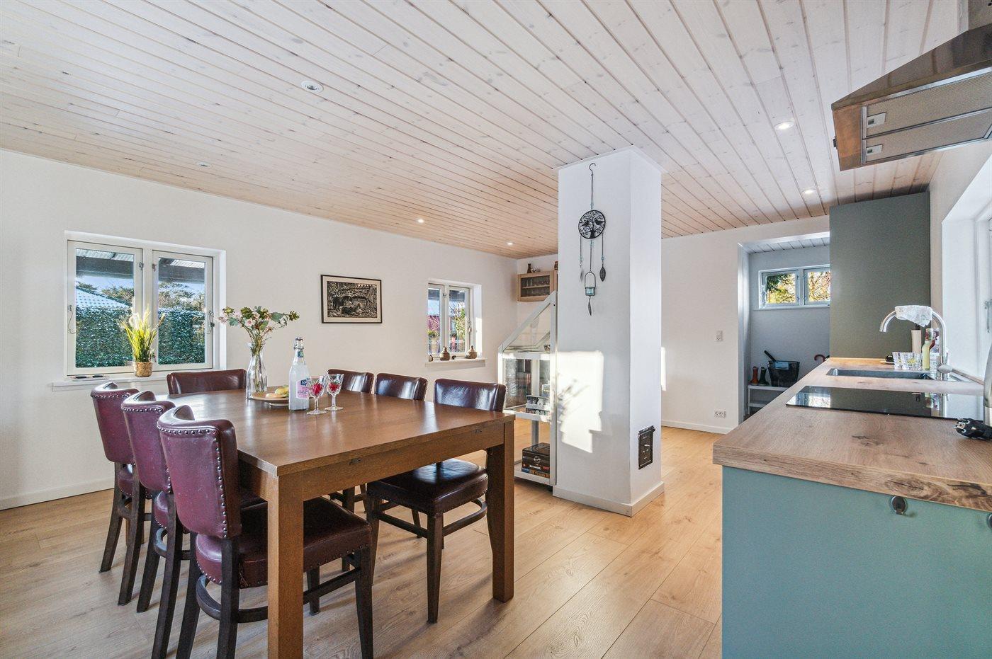 Køkkenet er udstyret med 1 køleskab. Der er 4 induktionskogeplader, varmluftovn samt opvaskemaskine Der er gulvvarme i køkkenet.