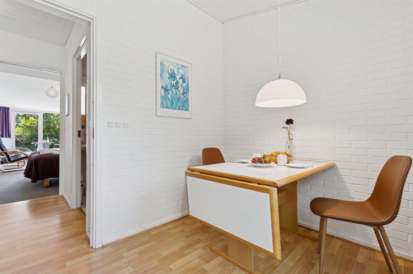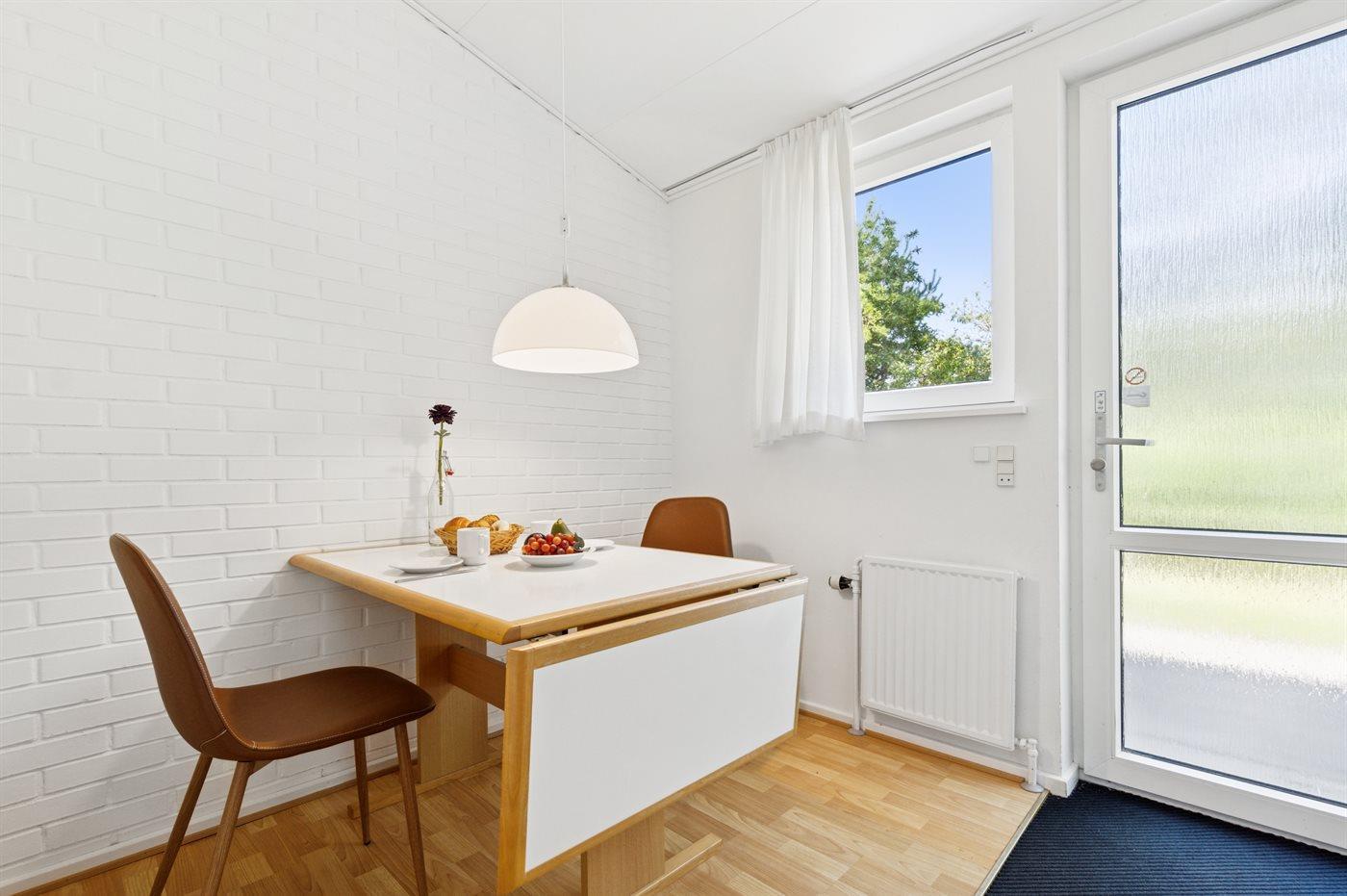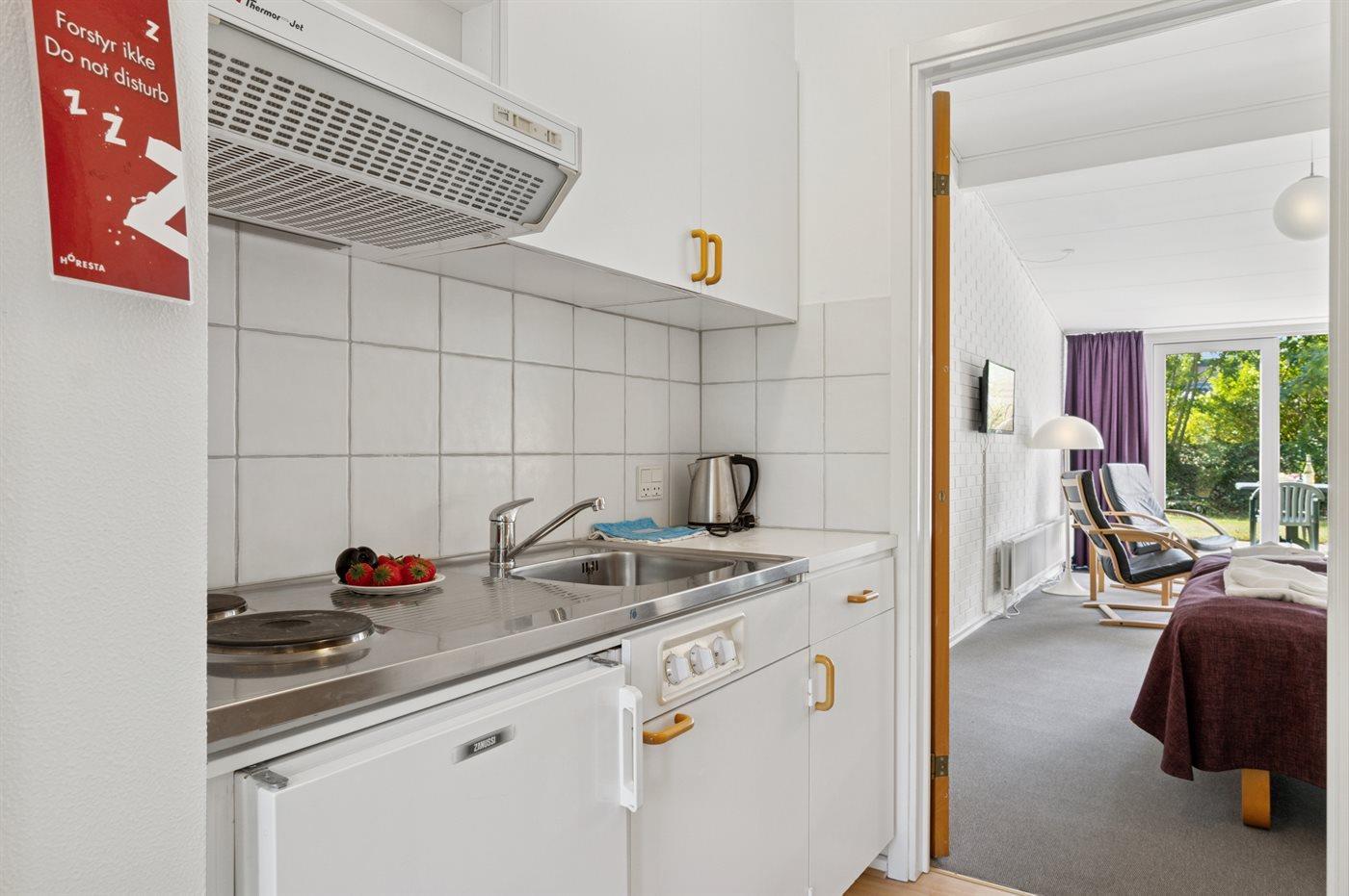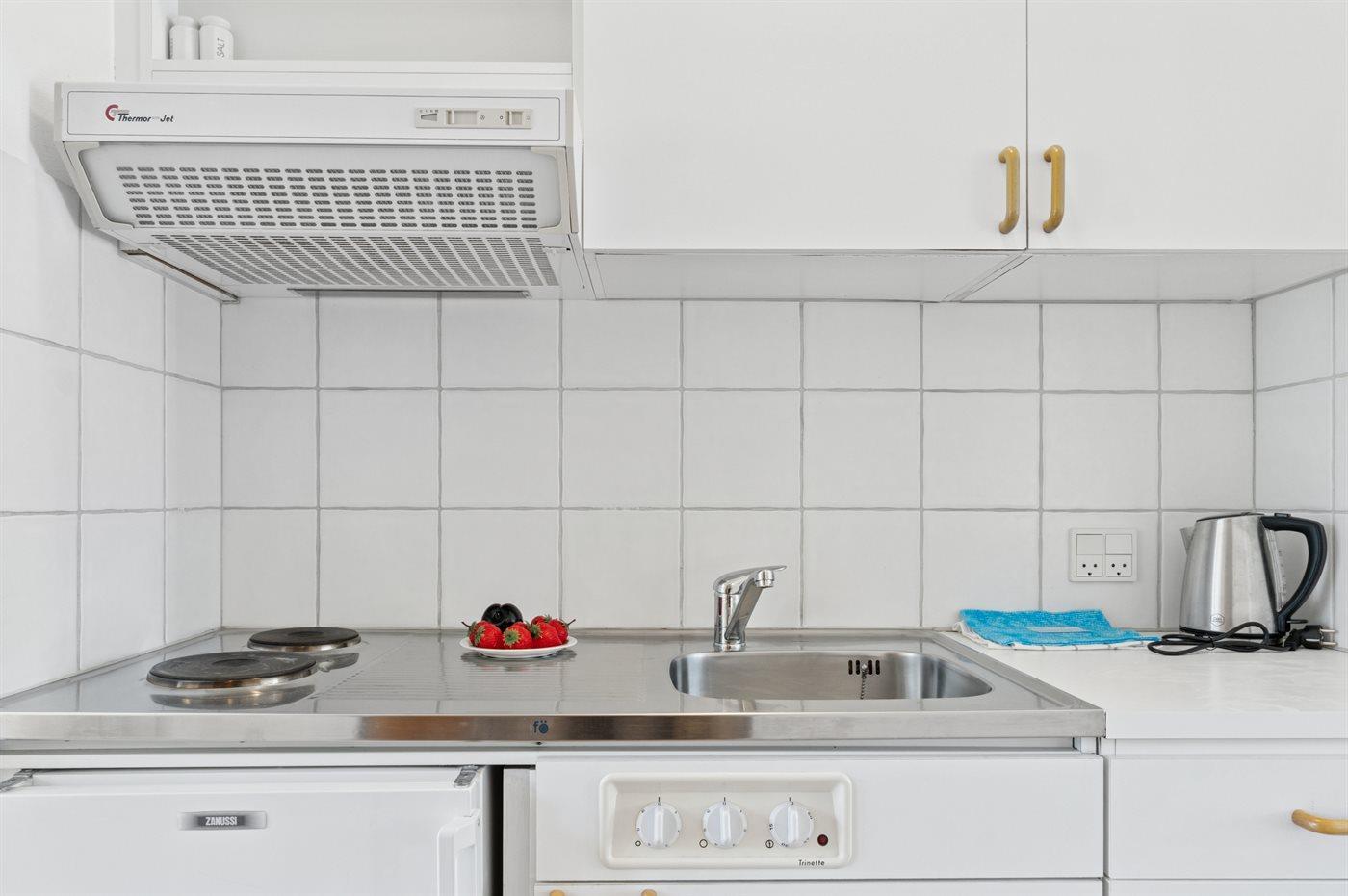 Køkkenet er udstyret med 1 køleskab. Der er 2 elkogeplader.