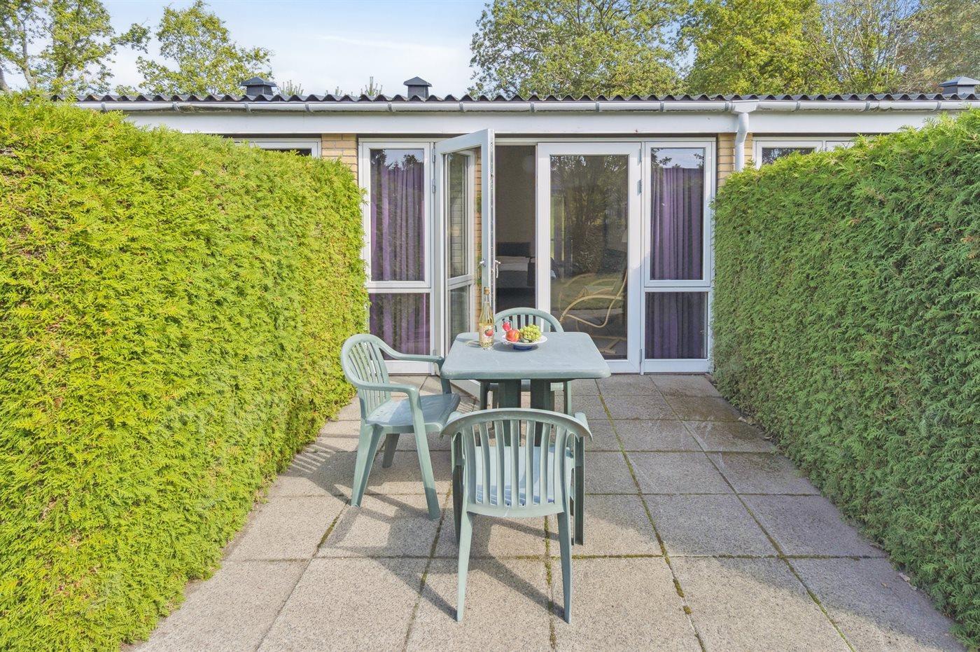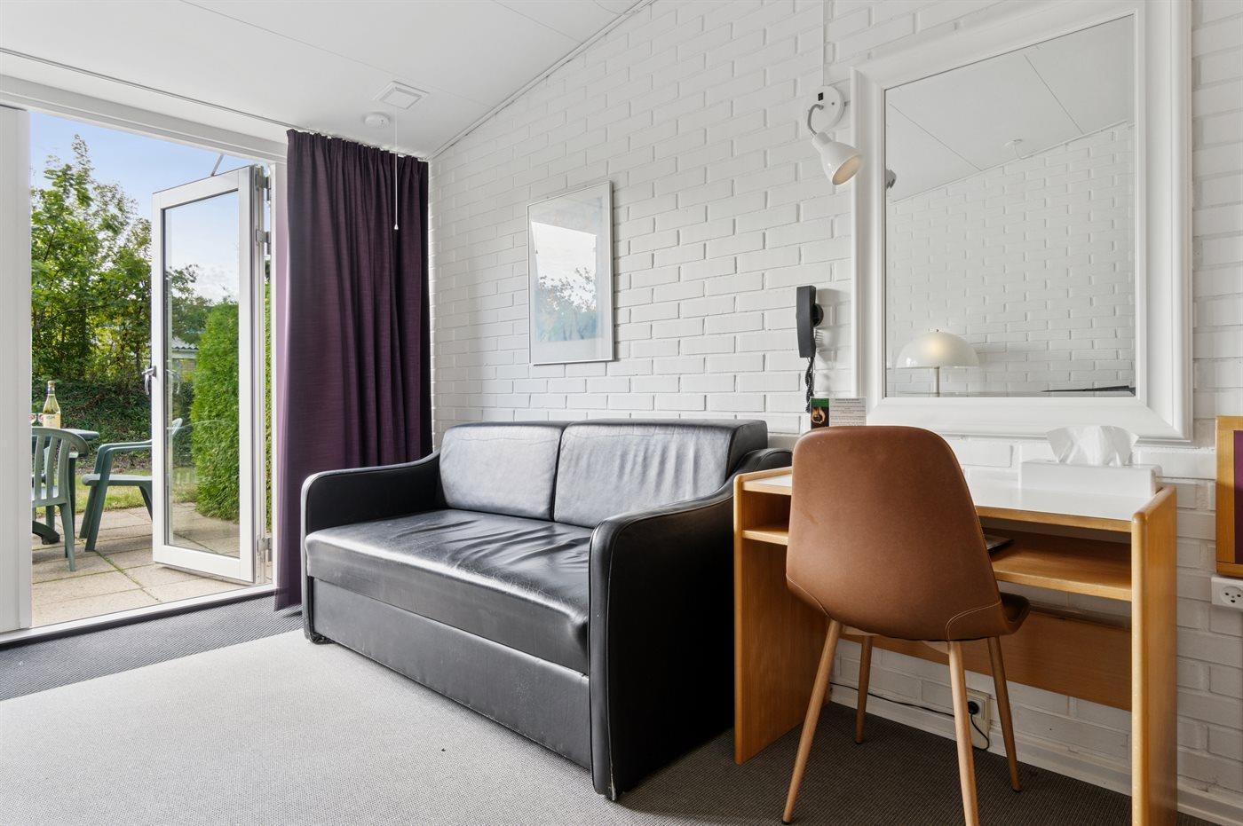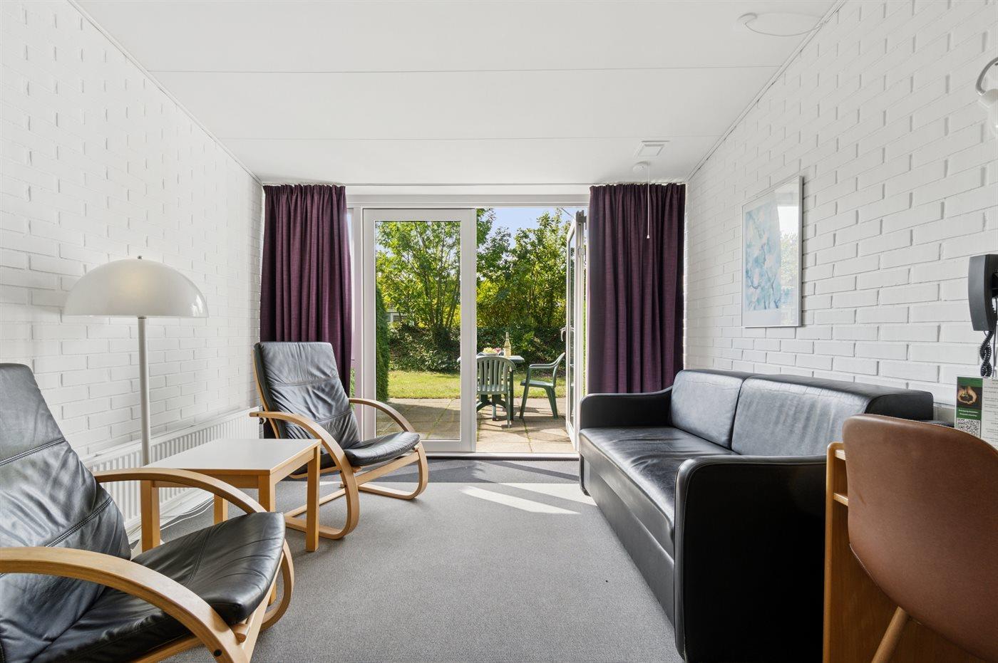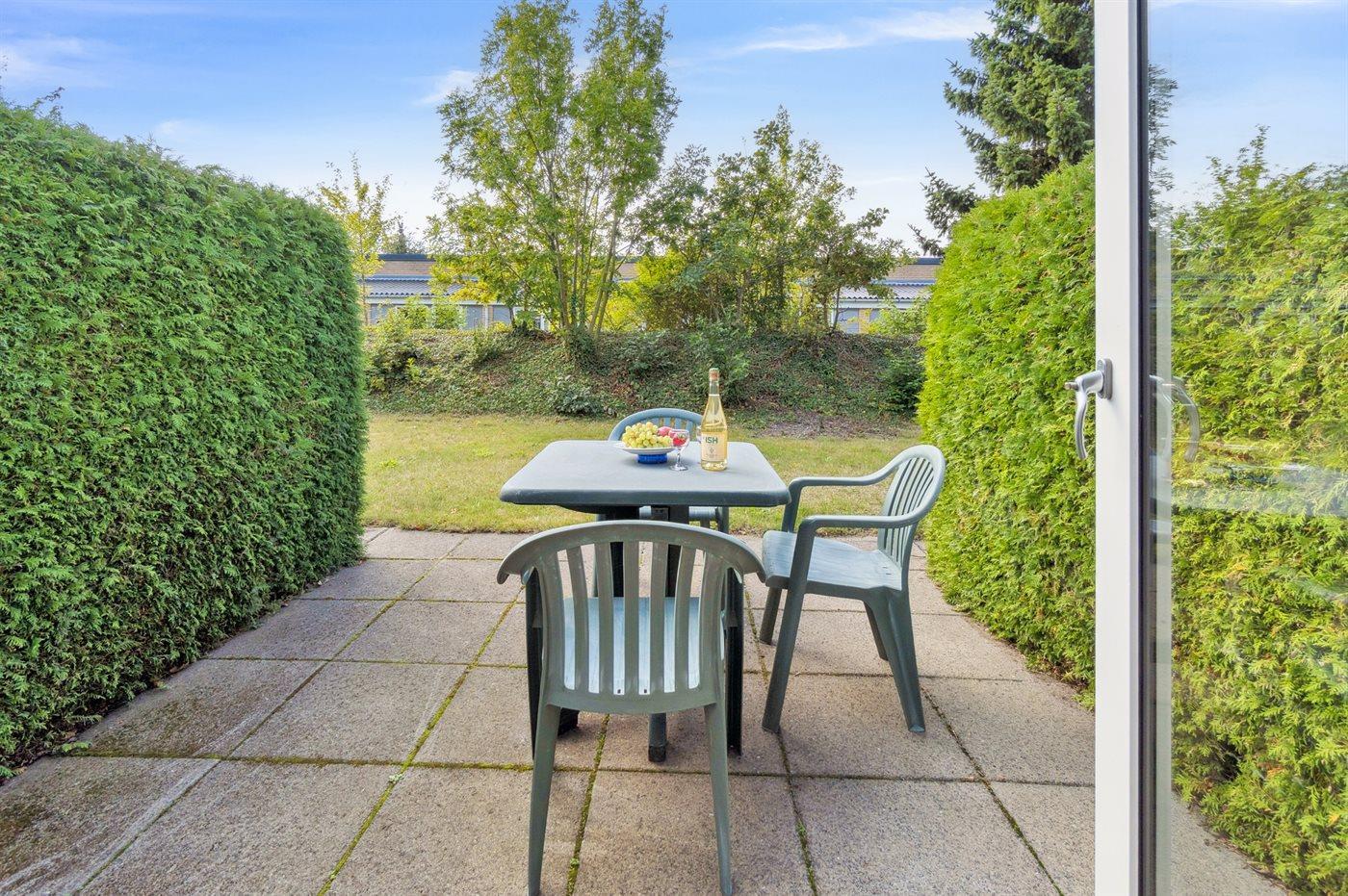 Lejligheden er indrettet med et lille køkken med køleskab og to kogeplader. Stuen har udgang til egen terrasse, hvor du kan nyde frokosten eller måske endda morgenkaffen. I stuen finder du desuden en dobbeltseng og en sovesofa – lejligheden er dermed velegnet til ét par eller en lille familie med ét barn. Entréen, køkkenet og den lille spiseafdeling ligger separat, så man kan fordele sig i lejligheden, hvis man ønsker at være sig selv, læse en god bog eller blot slappe af og nyde sin ferie.