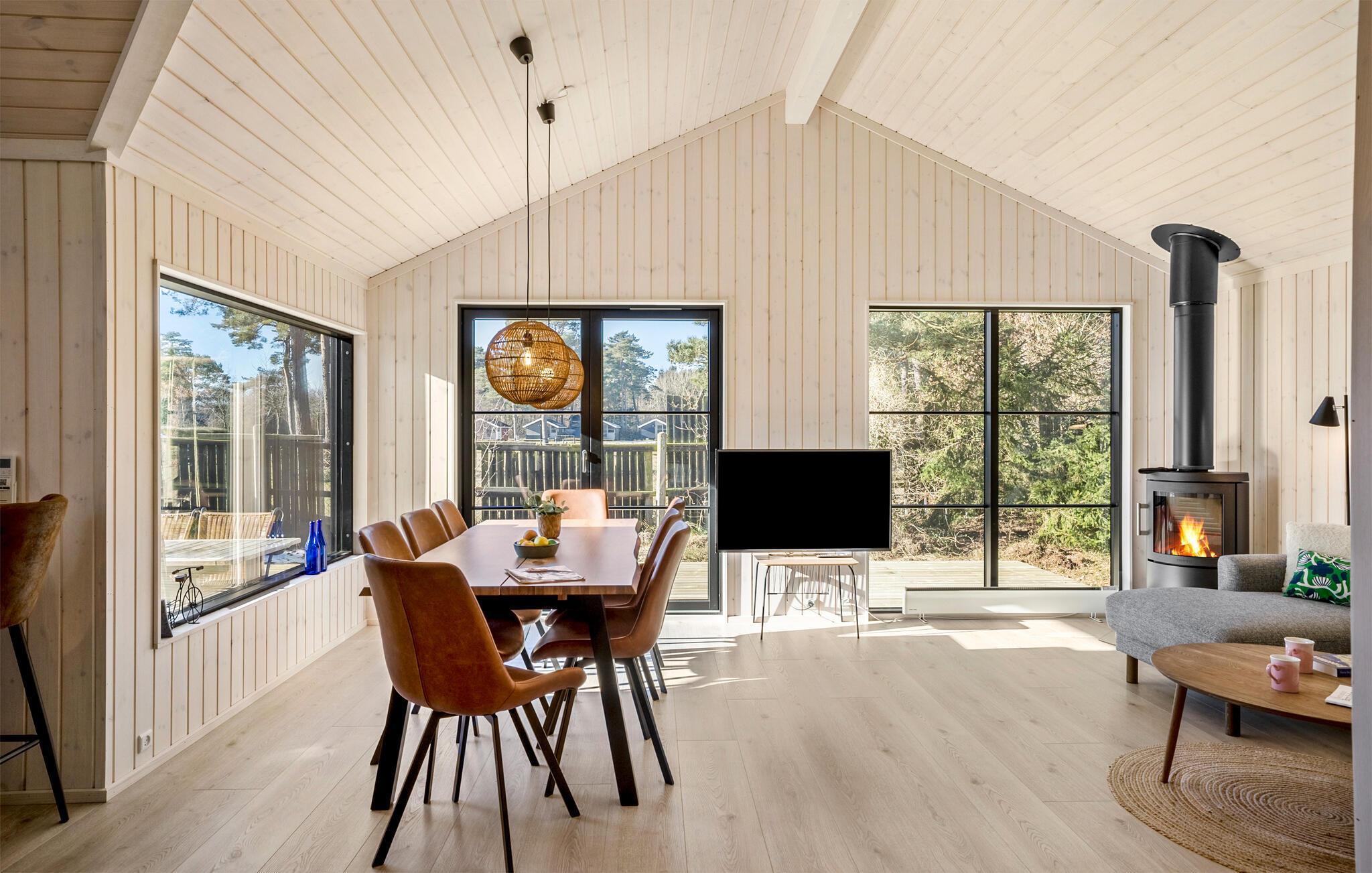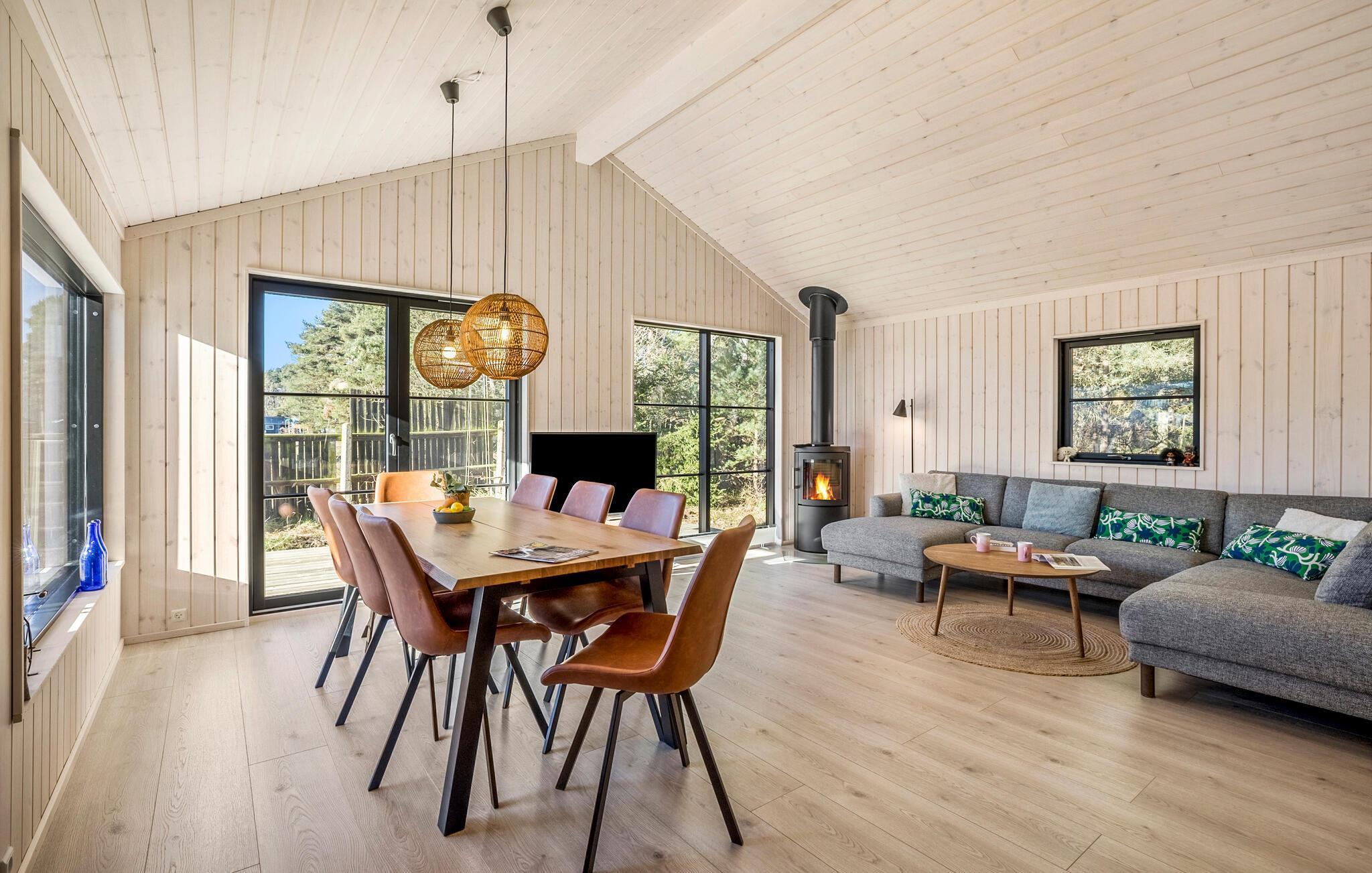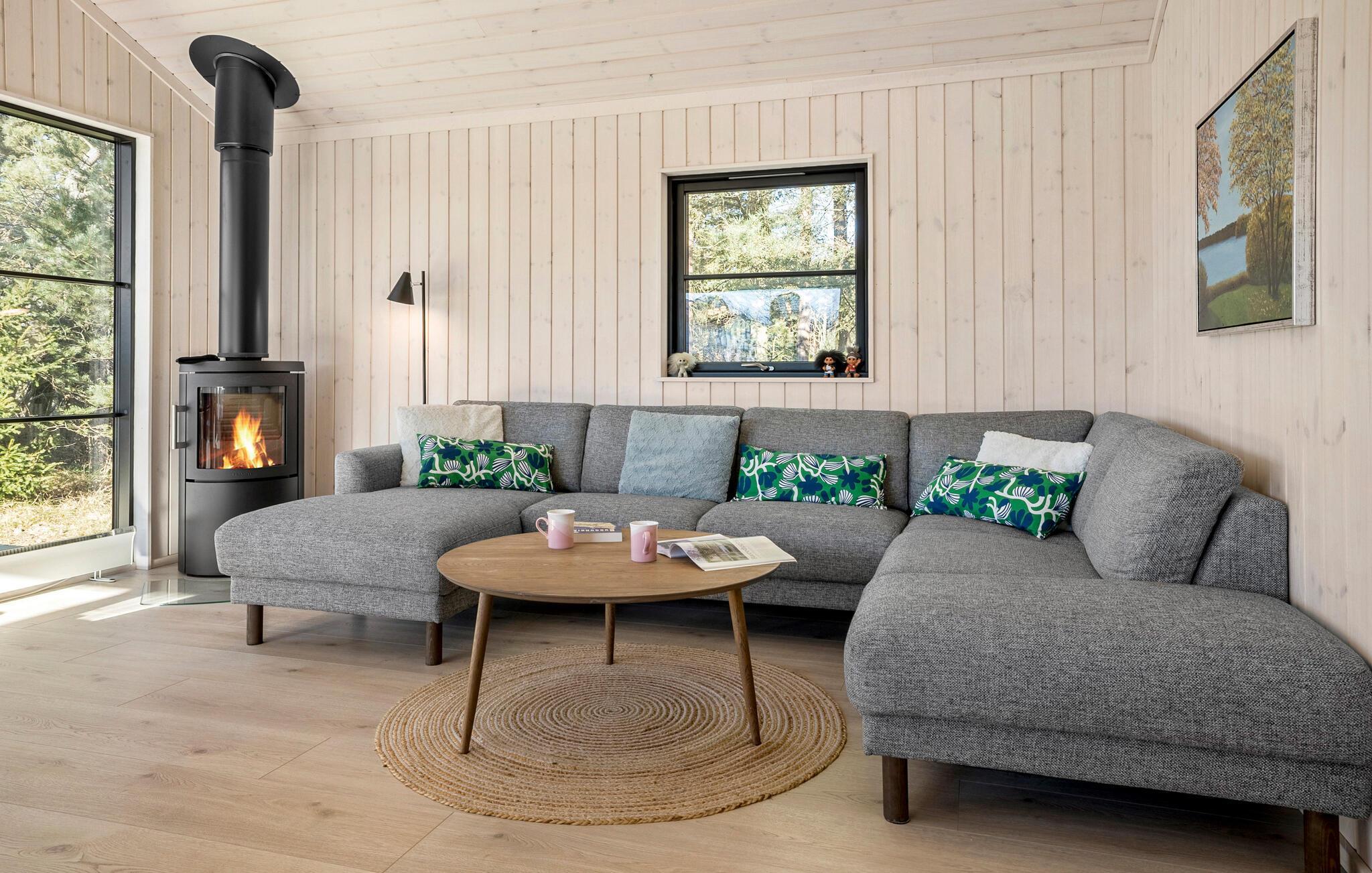 Sænk skuldrene og mærk den fredfyldte stemning i dette smagfulde hus. Her giver de store vinduesfronter masser af naturligt lys og en vidunderlig udsigt til naturen. Tilbered lækre måltider i det indbydende køkken og gør jer godt tilpas i det hyggelige sofaområde. Nyd den hyggelige varme fra brændeovnen med en god bog eller fyld aftenerne med sjove brætspil og gode snakke om dagens oplevelser.