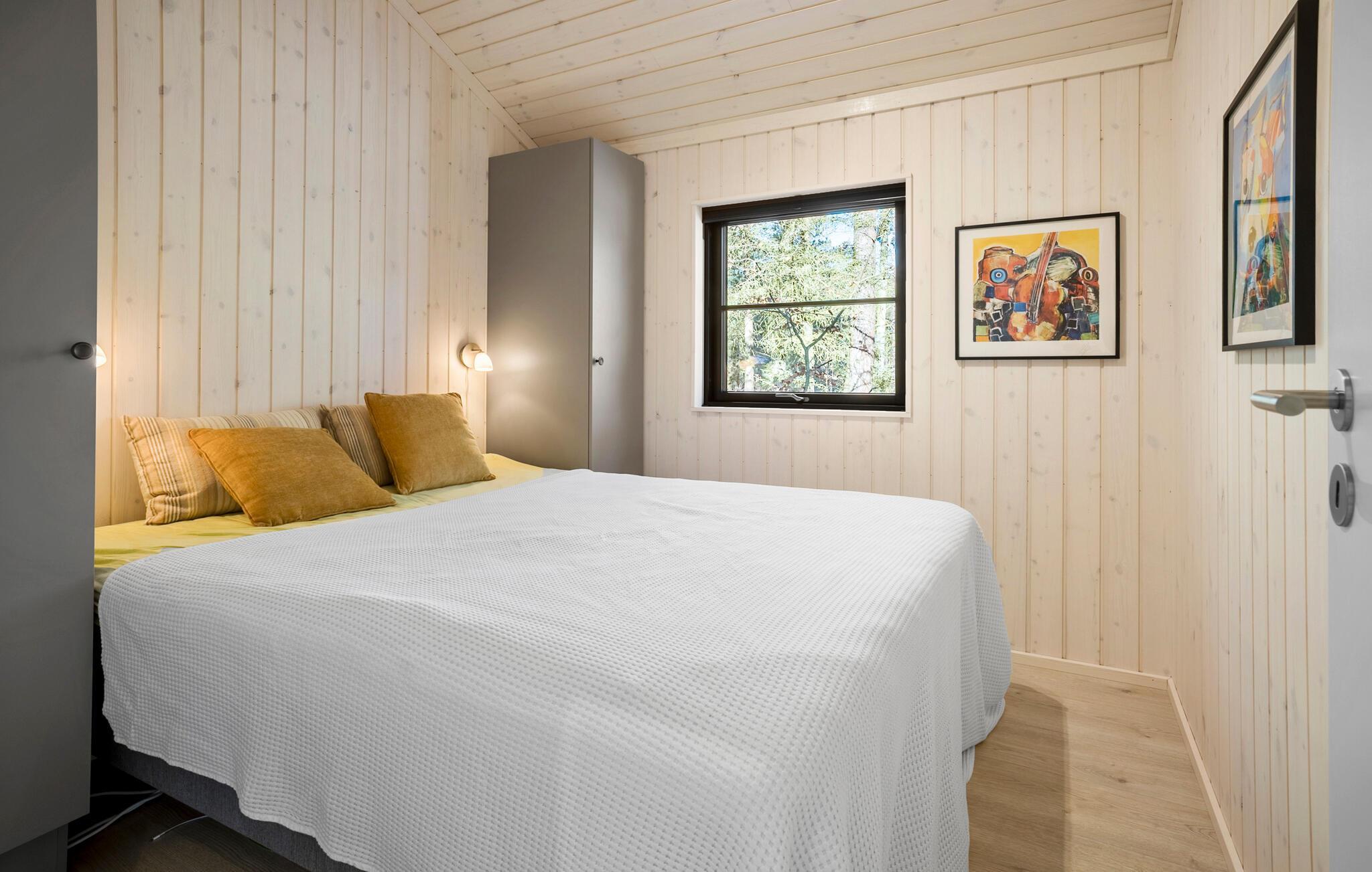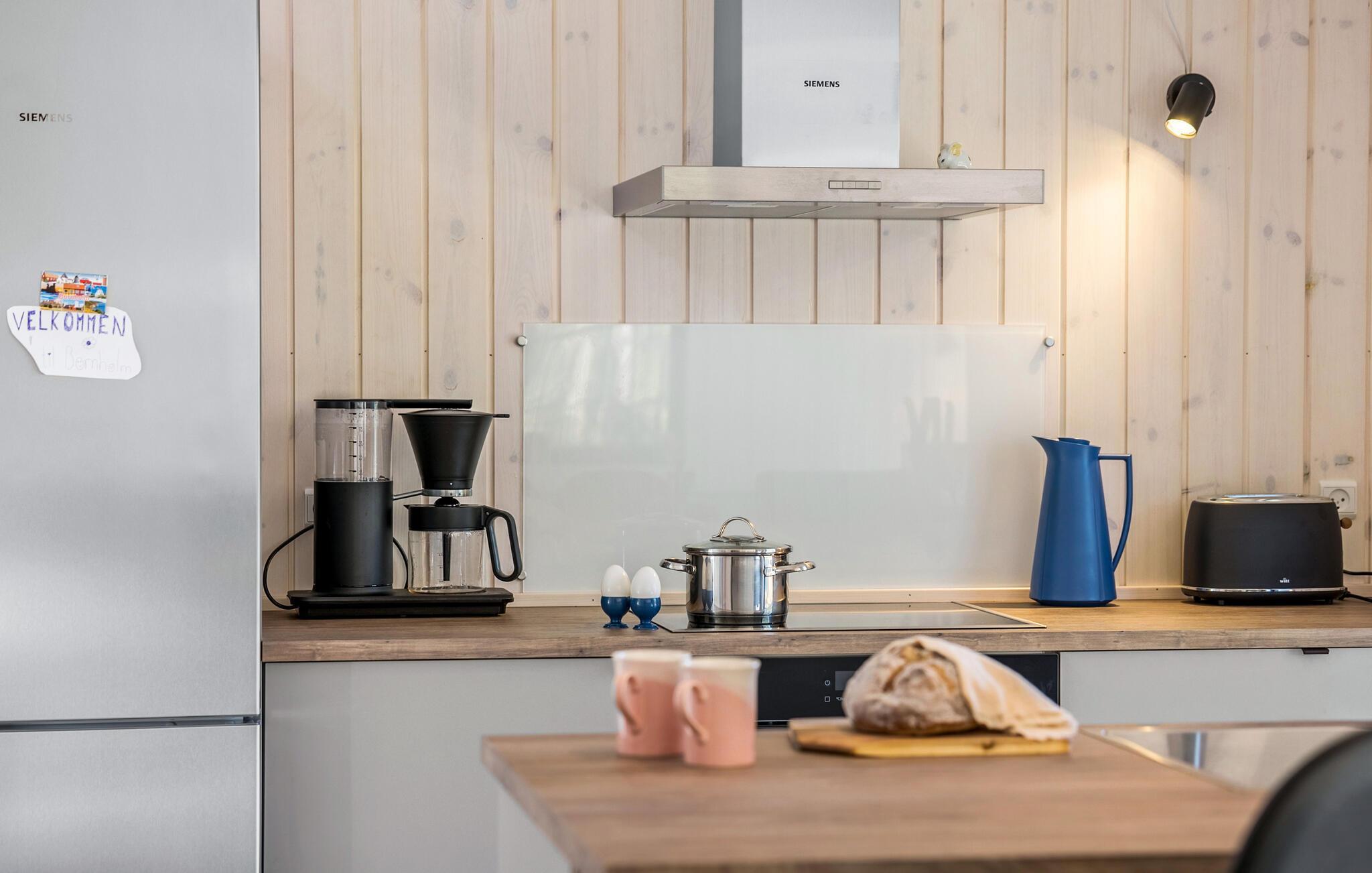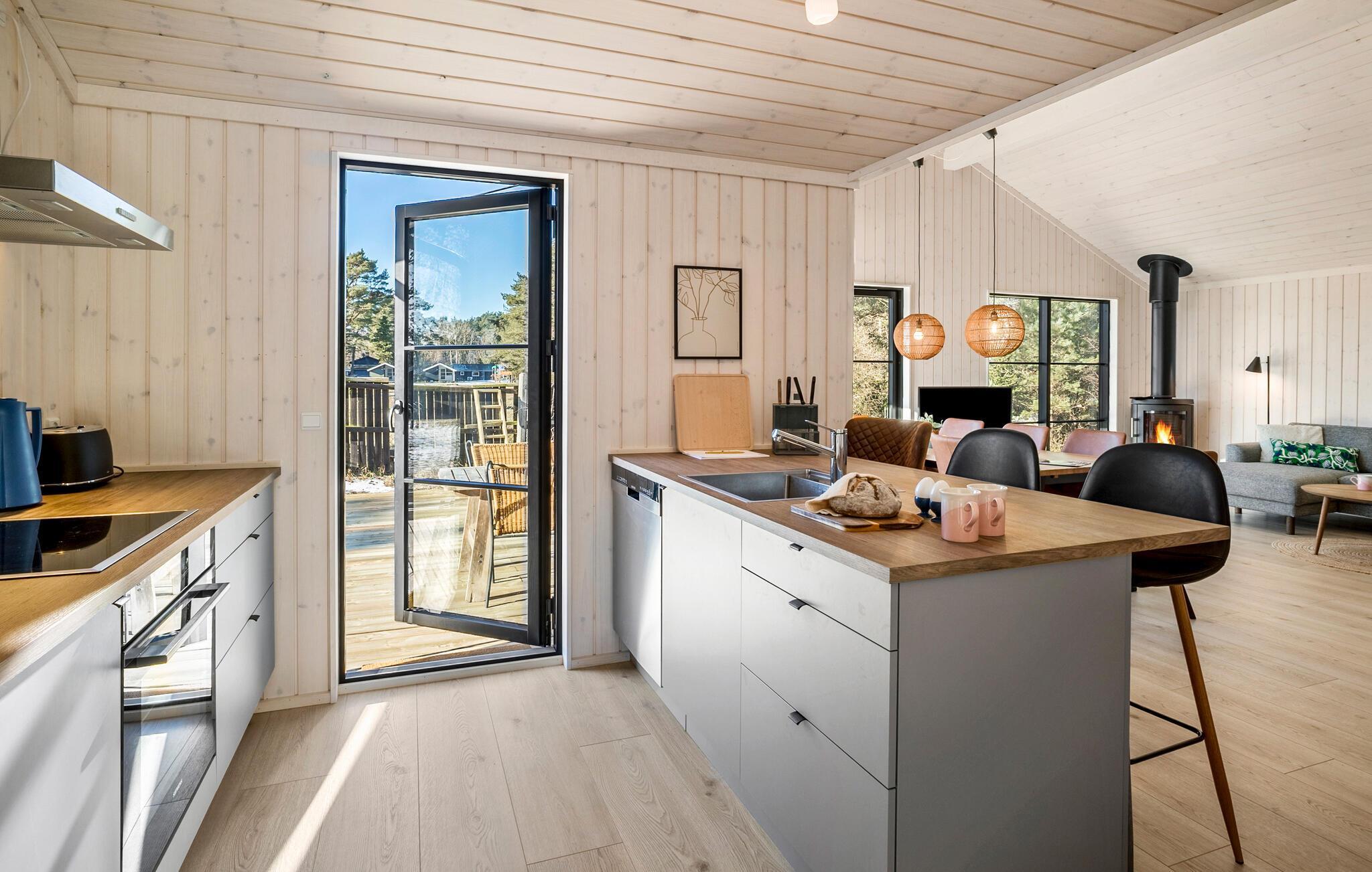 Sænk skuldrene og mærk den fredfyldte stemning i dette smagfulde hus. Her giver de store vinduesfronter masser af naturligt lys og en vidunderlig udsigt til naturen. Tilbered lækre måltider i det indbydende køkken og gør jer godt tilpas i det hyggelige sofaområde. Nyd den hyggelige varme fra brændeovnen med en god bog eller fyld aftenerne med sjove brætspil og gode snakke om dagens oplevelser.