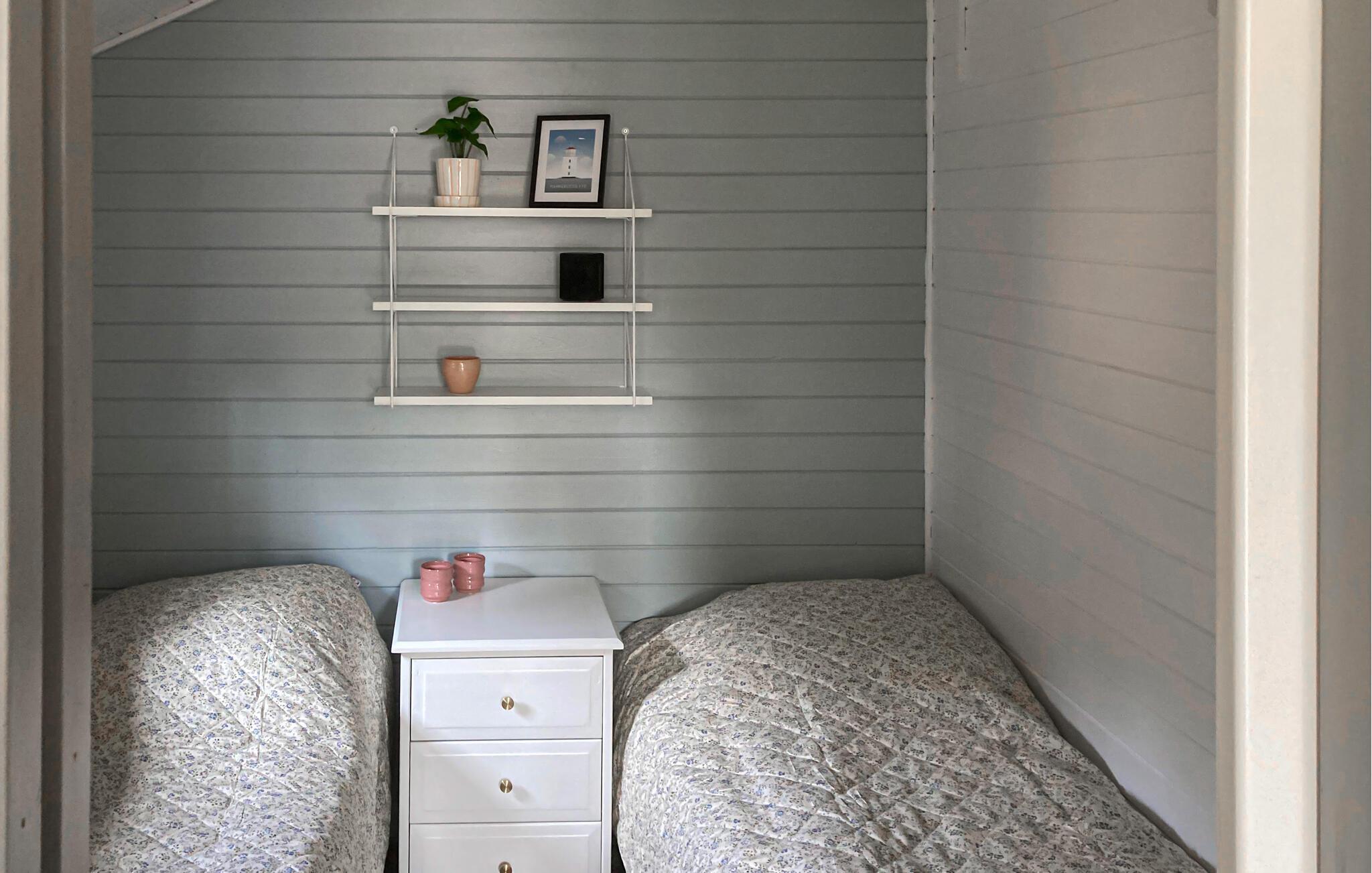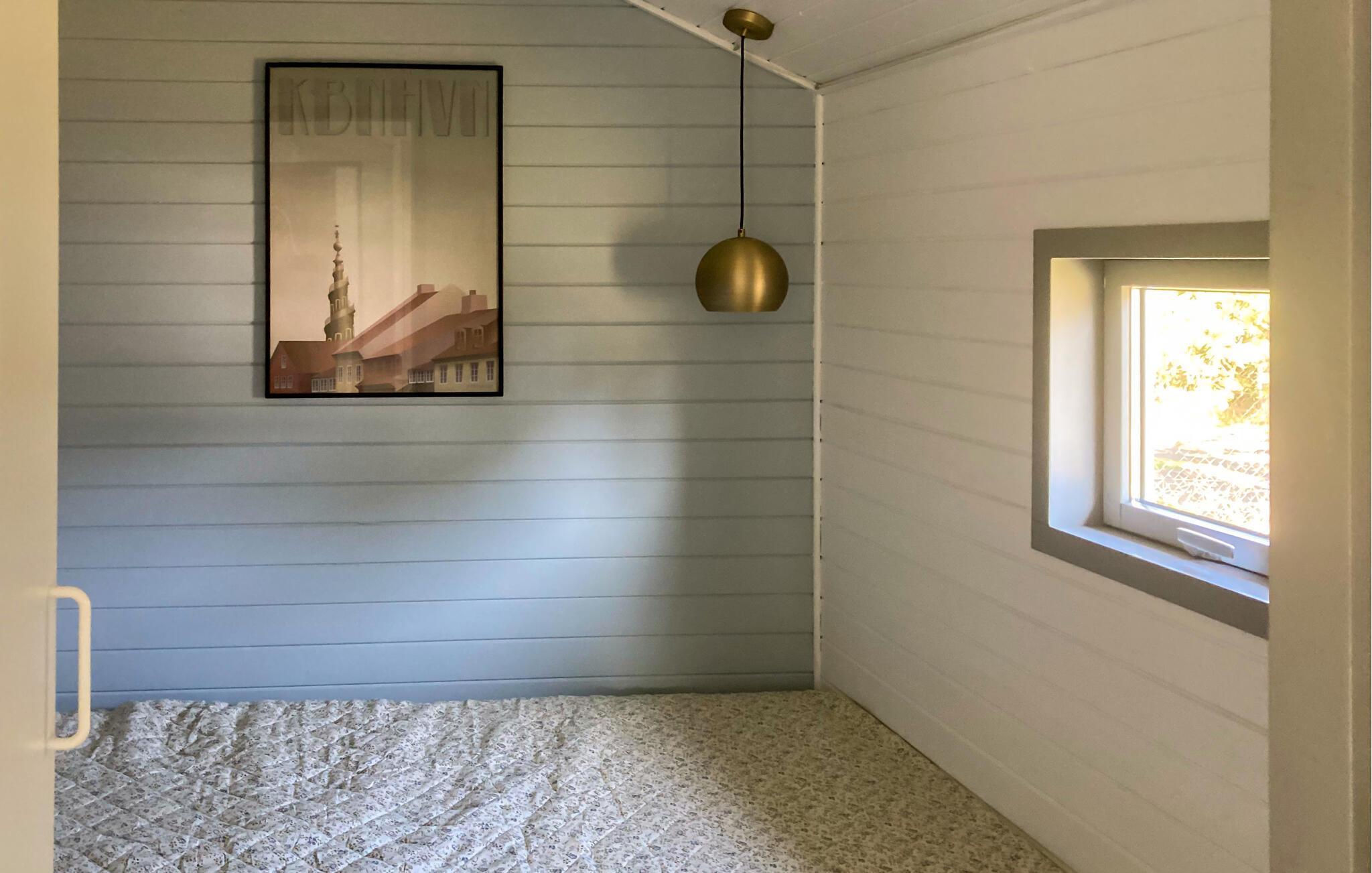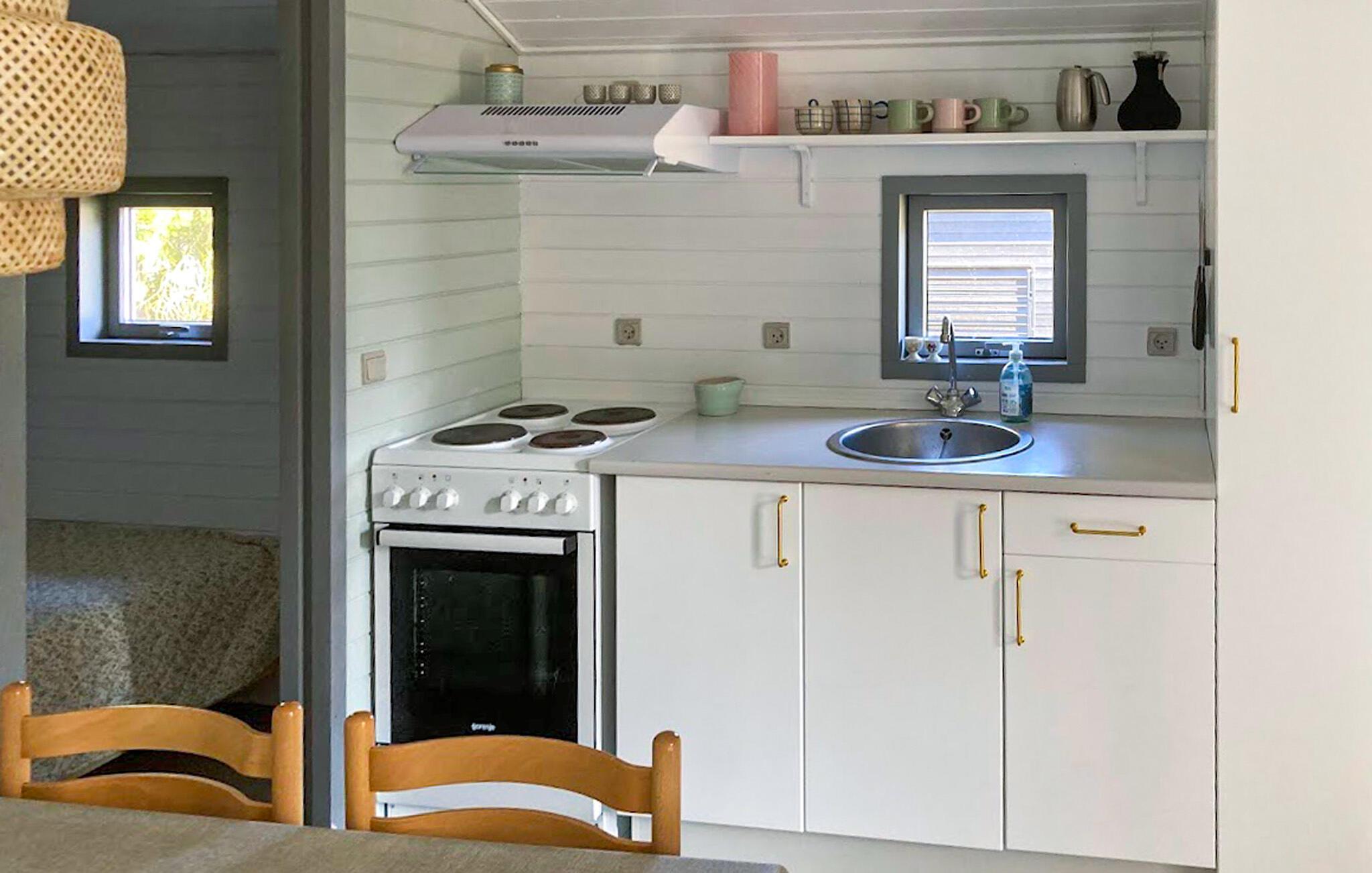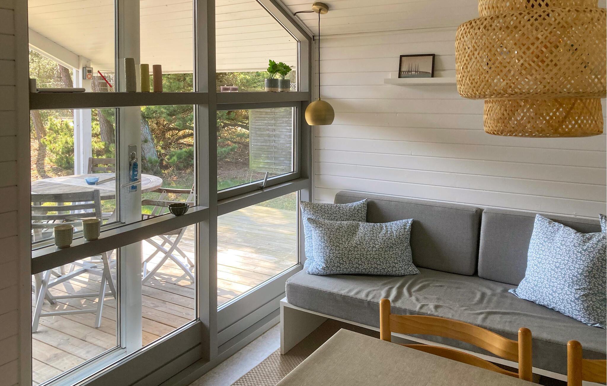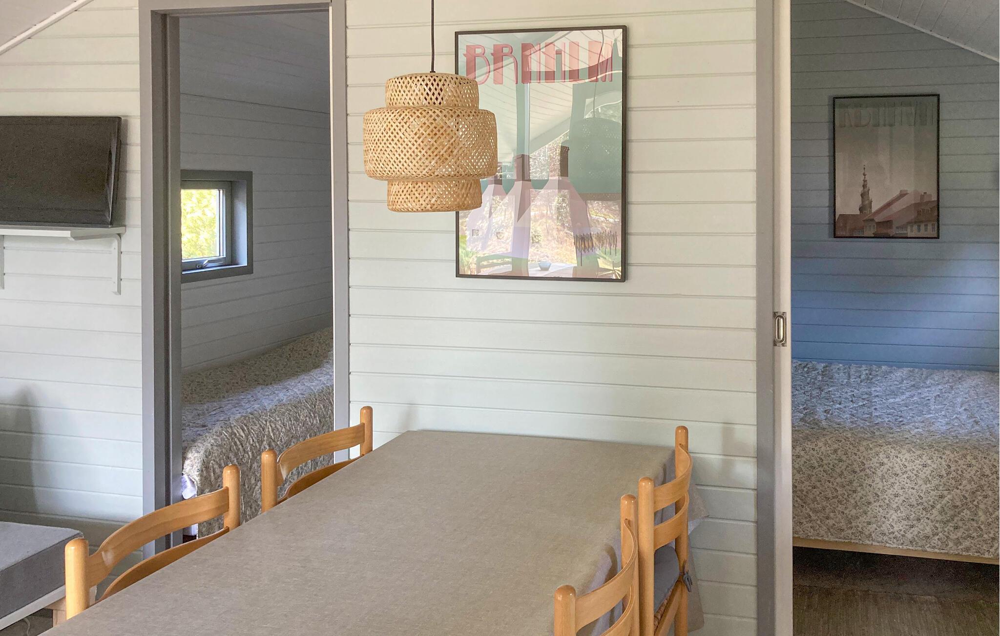Hytten er velindrettet med plads til fem personer. Der venter et hjemligt interiør i skandinavisk stil med åbent køkken, hvor I finder alt det udstyr, I skal bruge. Tag en kop kaffe og sæt jer i det hyggelige opholdsrum eller find en stol på den solrige terrasse. Sovepladserne fordeler sig over en dobbeltseng, en køjeseng og en enkeltseng.