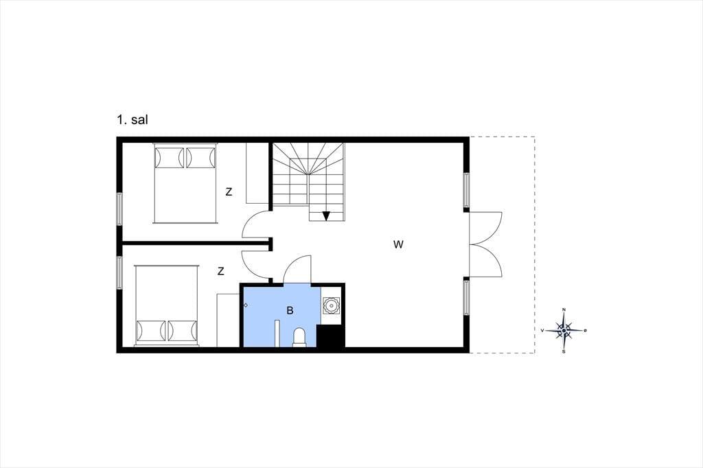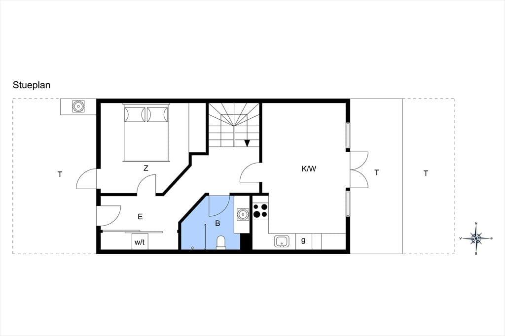 Denne feriebolig er et lyst og dejligt hus at opholde sig i, det mærker du med det samme, du træder ind ad døren. Huset er i to etager, og på begge etager er store vinduer vendt mod udsigten til havet. I stueetagen er husets entré og det første soveværelse, hvor der er plads til to personer samt god opbevaringsplads. Badeværelset er centralt i stueetagen, og som resten af huset er det lyst og funktionelt. I entréen finder I også vaskemaskine og tørretumbler, så praktikken er på plads, når I skal holde ferie her.