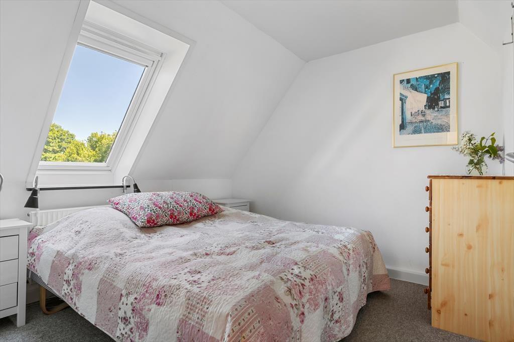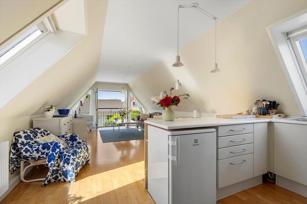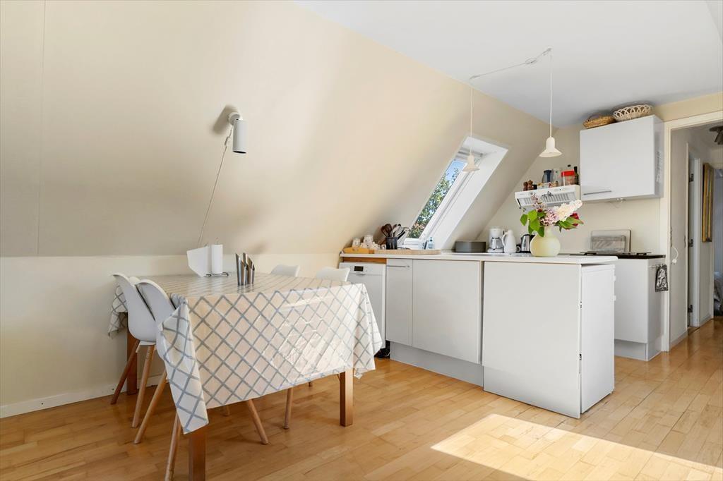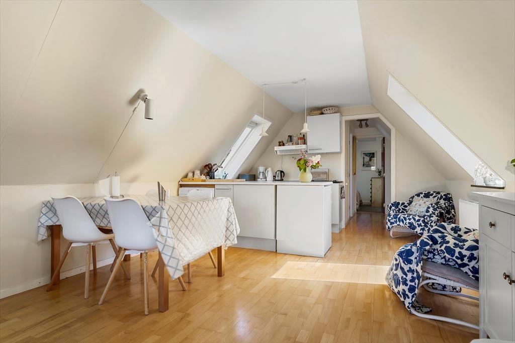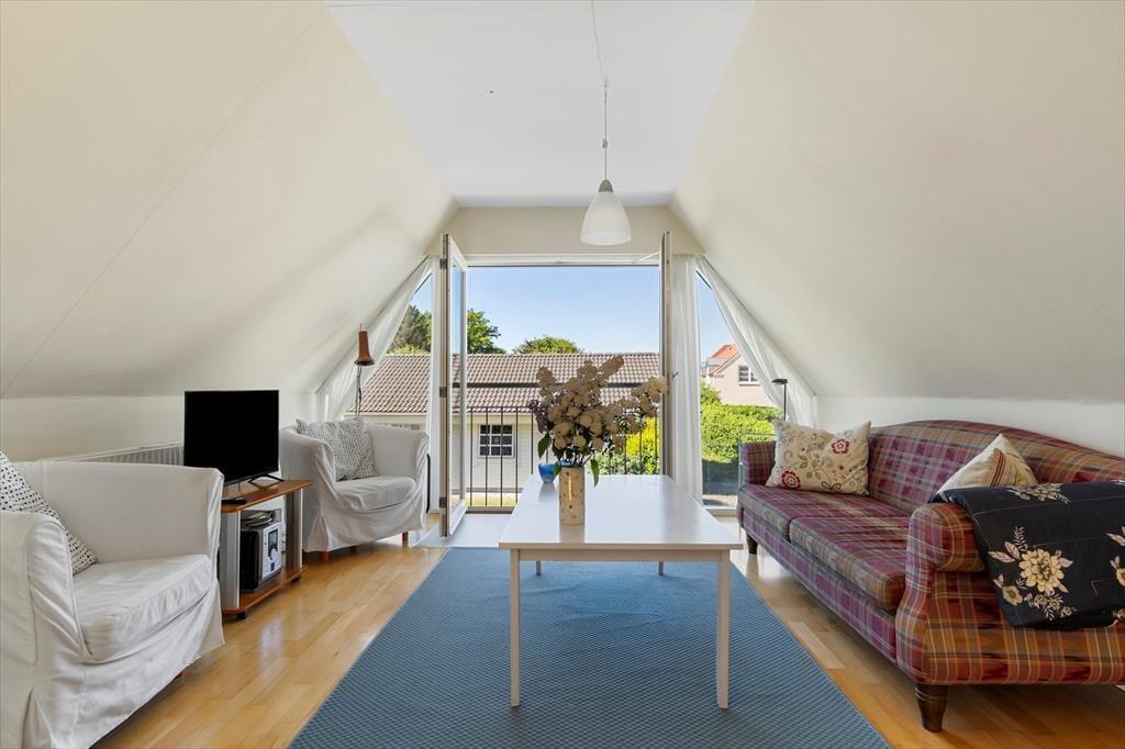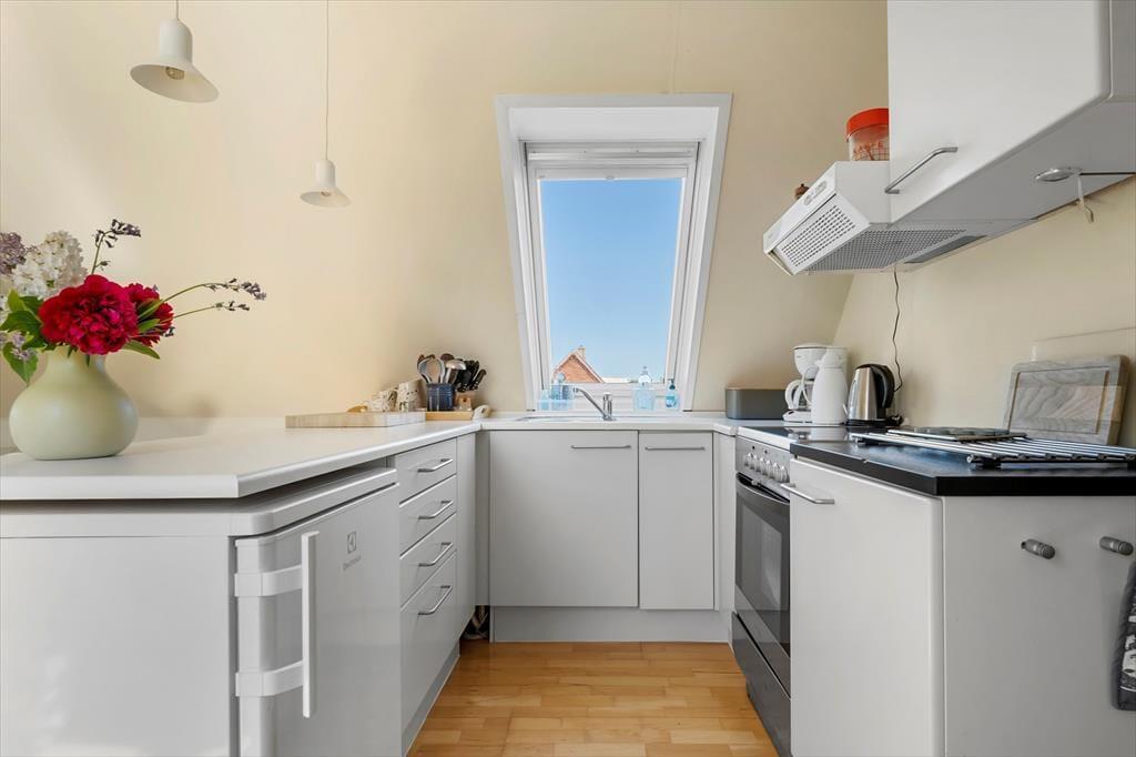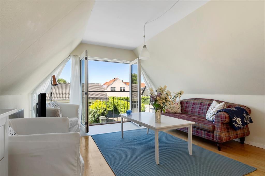 Lejligheden er lys og indbydende og rummer 80 m² med stue, køkken, badeværelse og tre soveværelser – ideel til fem voksne og ét barn. Der er desuden en sydvendt fransk altan i stuen, samt vandkik fra trappesatsen.