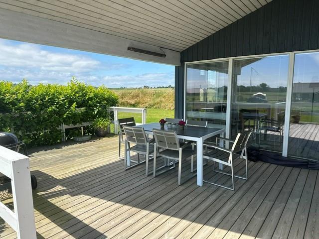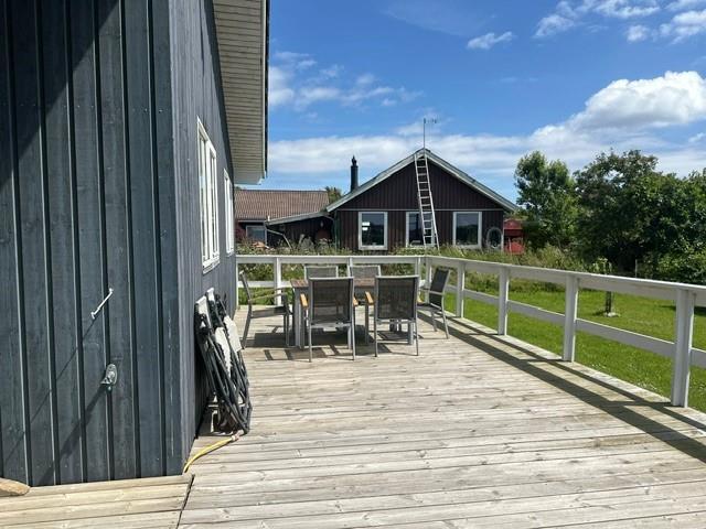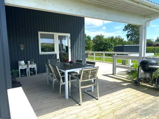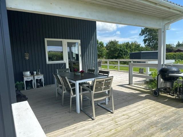 Fra stuen træder I direkte ud på den store delvist overdækkede træterrasse, udstyret med komfortable havemøbler og grill – perfekt til hyggelige aftener under åben himmel. Haven er ideel til leg og afslapning for både børn og voksne.