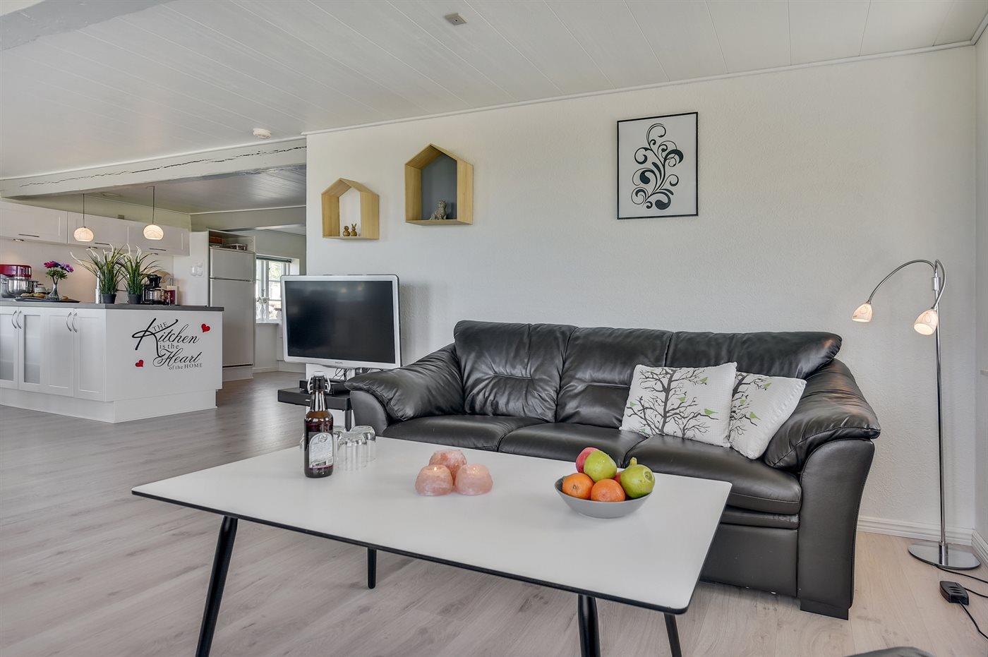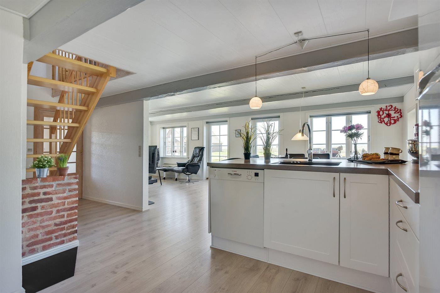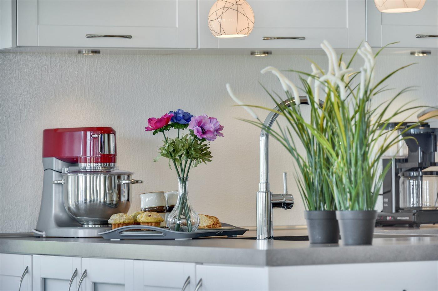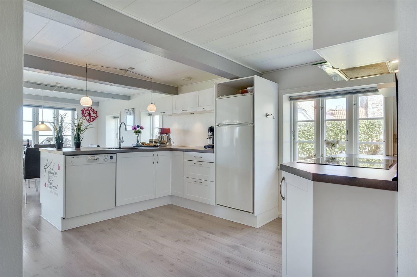 Køkkenet er udstyret med 1 køleskab. Der er 4 keramiske kogeplader, varmluftovn, mikrobølgeovn samt opvaskemaskine.