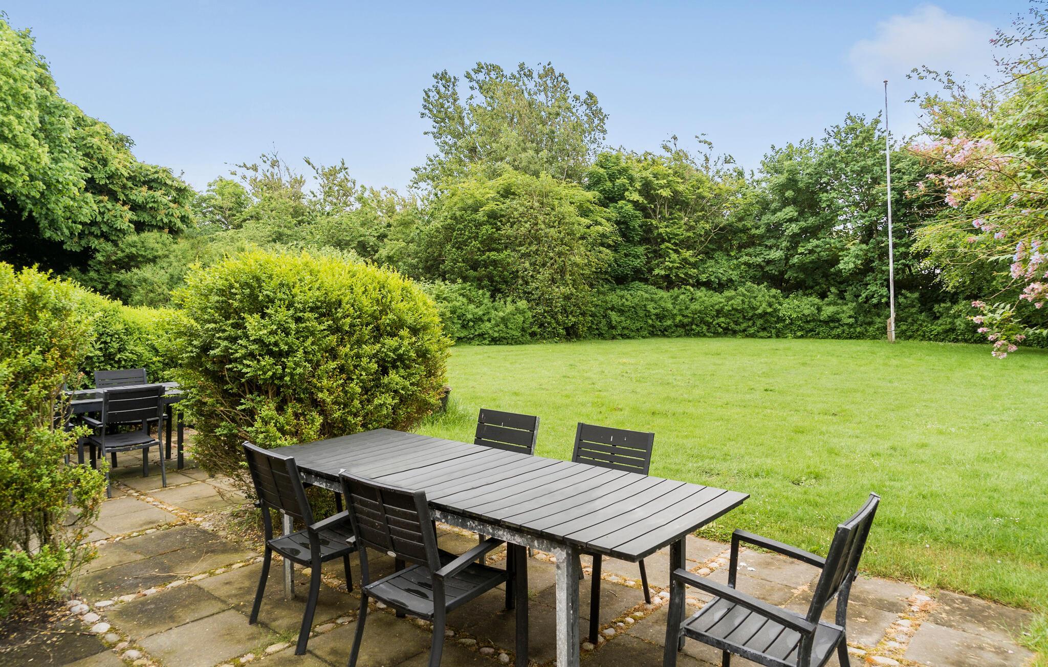 Udenfor er der en stor have og en gynge, som børnene kan boltre sig med lige fra morgenstunden. Her er også en skøn terrasse, hvor I kan nyde den friske luft og de grønne omgivelser med en god kop kaffe fra morgenstunden. Lad en smuk sommerdag gå på hæld med saftige bøffer fra grillen under den lune aftensol, mens I lægger planer for de kommende dage.