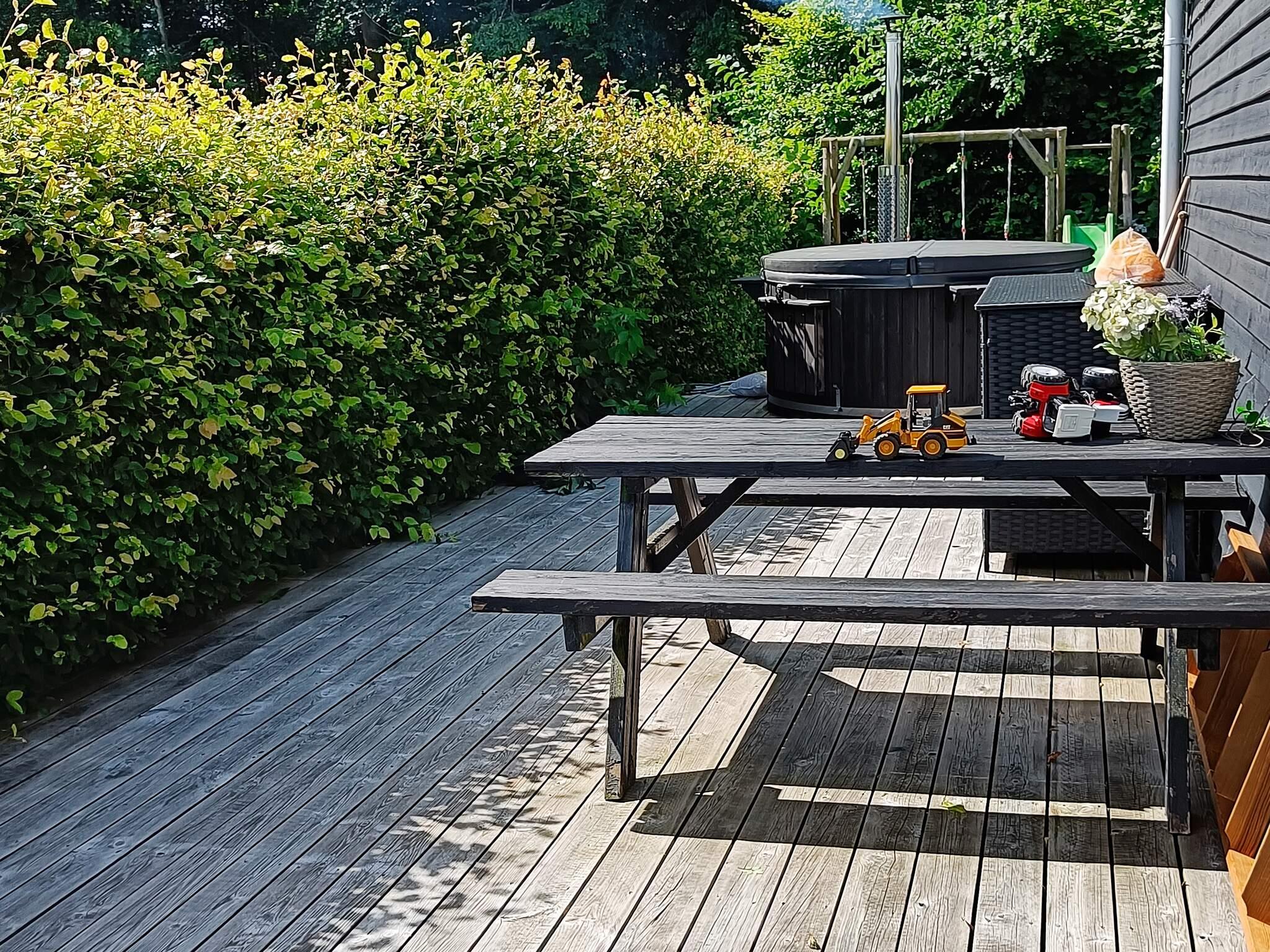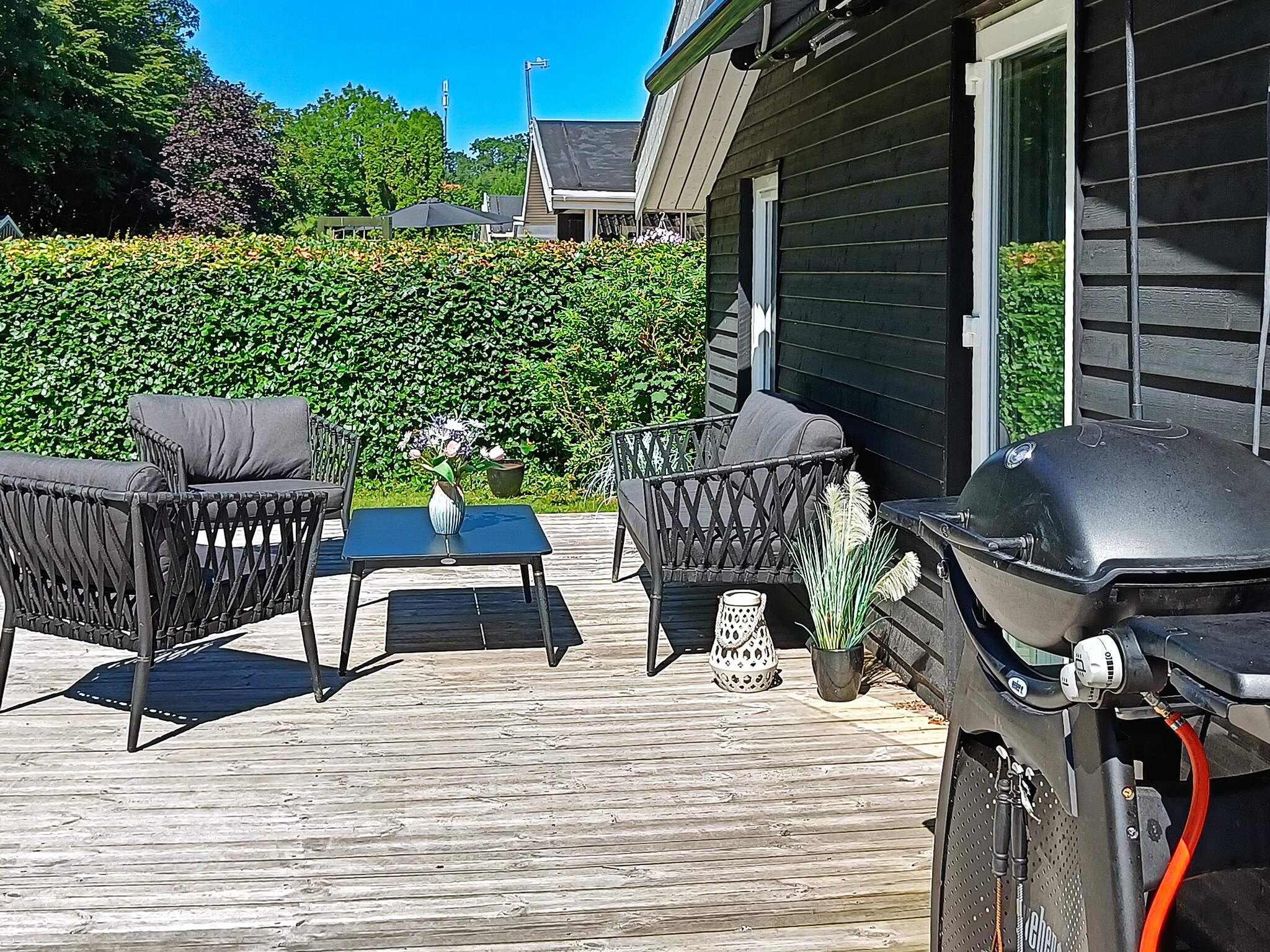 Huset er nærmest omkranset af terrasser, hvor I kan nyde udelivet med f.eks. grill og leg og nyde udsigten til vandet. På terrassen imod syd/vest kan I slappe i det dejlige loungesæt og når duggen falder, kan I køre den elektriske markise ud og nyde et lille glas bobler og hoppe i vildmarksbadet, der opvarmes med brænde. Der er gynge og i området finder I flere legepladsområder og boldbaner. Udlejes ikke til ungdomsgrupper.