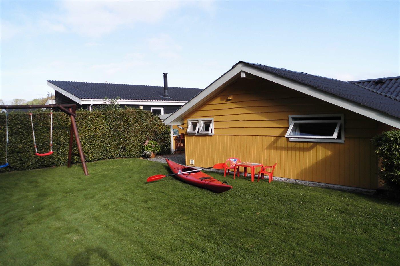 Ferieboligen er beliggende på en 700 m² stor havegrund. Grunden er indhegnet. Der er 100 m til havet. Der er en badebro i nærheden og kajak til rådighed. Nærmeste forretning er beliggende i en afstand af 100 m. Til ferieboligen hører 54 m² terrasseareal. Desuden er der 14 m² overdækket terrasse. Der er redskabsrum. Gynge. Sandkasse. Der er installeret stik til opladning af elbil. Type 2 stik. Med 11 kW ladeeffekt. Parkering ved ferieboligen.