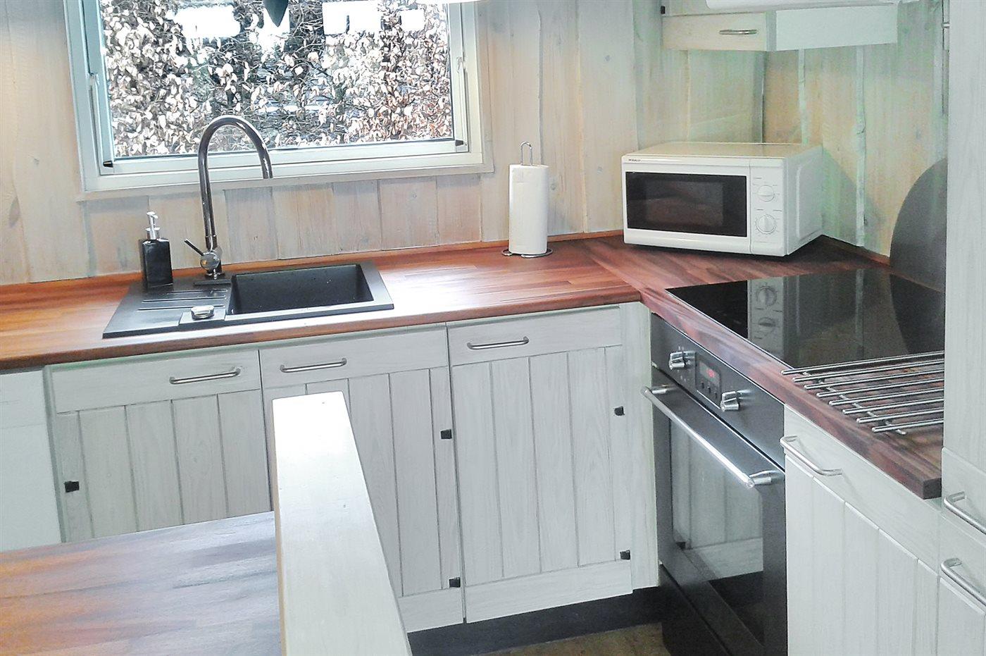 Køkkenet er udstyret med 1 køleskab. Der er 4 induktionskogeplader, varmluftovn, mikrobølgeovn samt opvaskemaskine.
