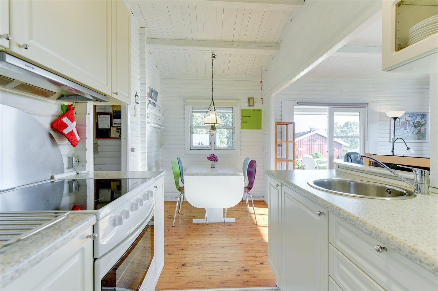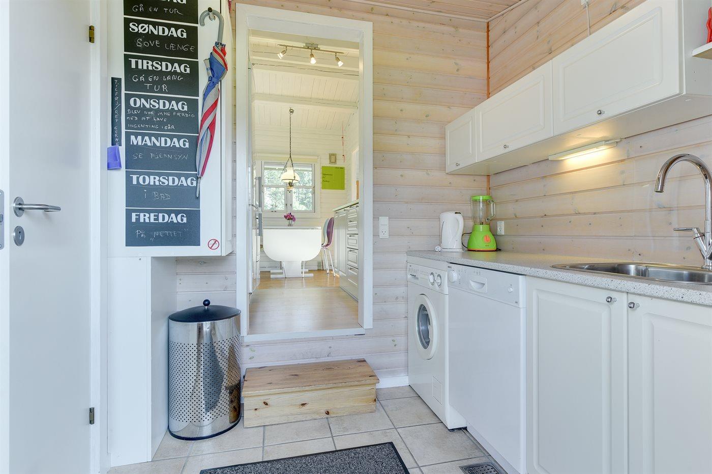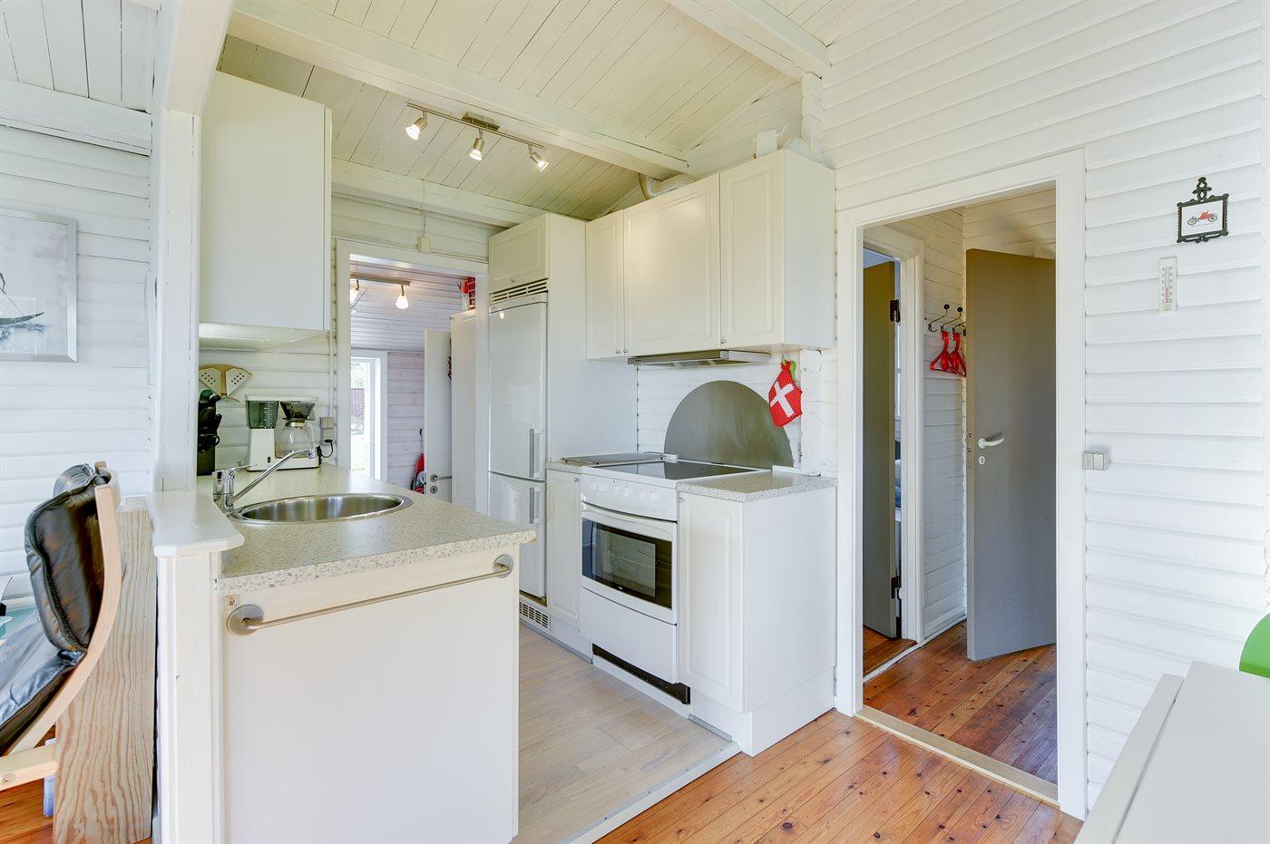 Køkkenet er udstyret med 1 køleskab. Der er 4 keramiske kogeplader, varmluftovn, mikrobølgeovn samt opvaskemaskine.