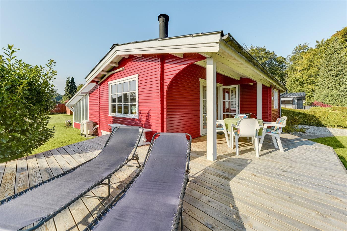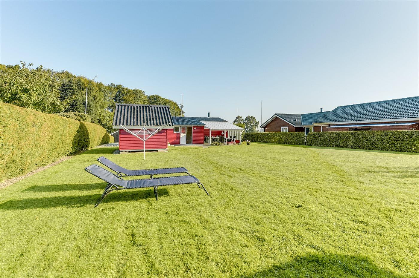 Til huset hører 2 overdækkede terrasser med havemøbler, hvoraf den ene har en skøn udsigt til vandet. Fra opholdsstuen kan udsigten til havet også nydes. Endvidere er der et godt anneks, hvor 2 af sovepladserne befinder sig.