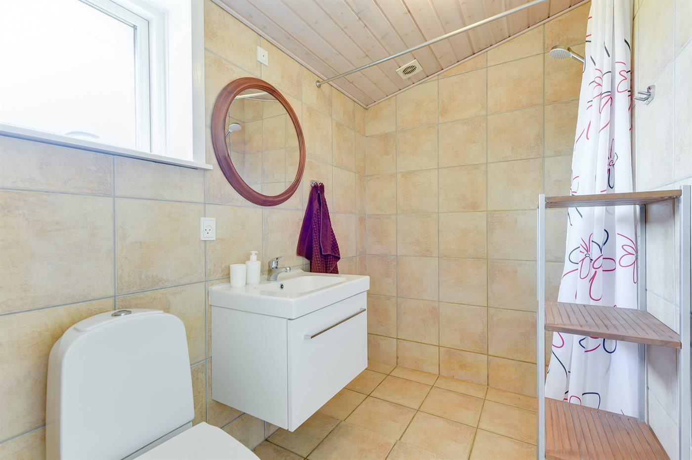 Der er 1 badeværelse med bruseniche og 2 toiletter, heraf 1 gæstetoilet. Der er gulvvarme på 1 badeværelse.