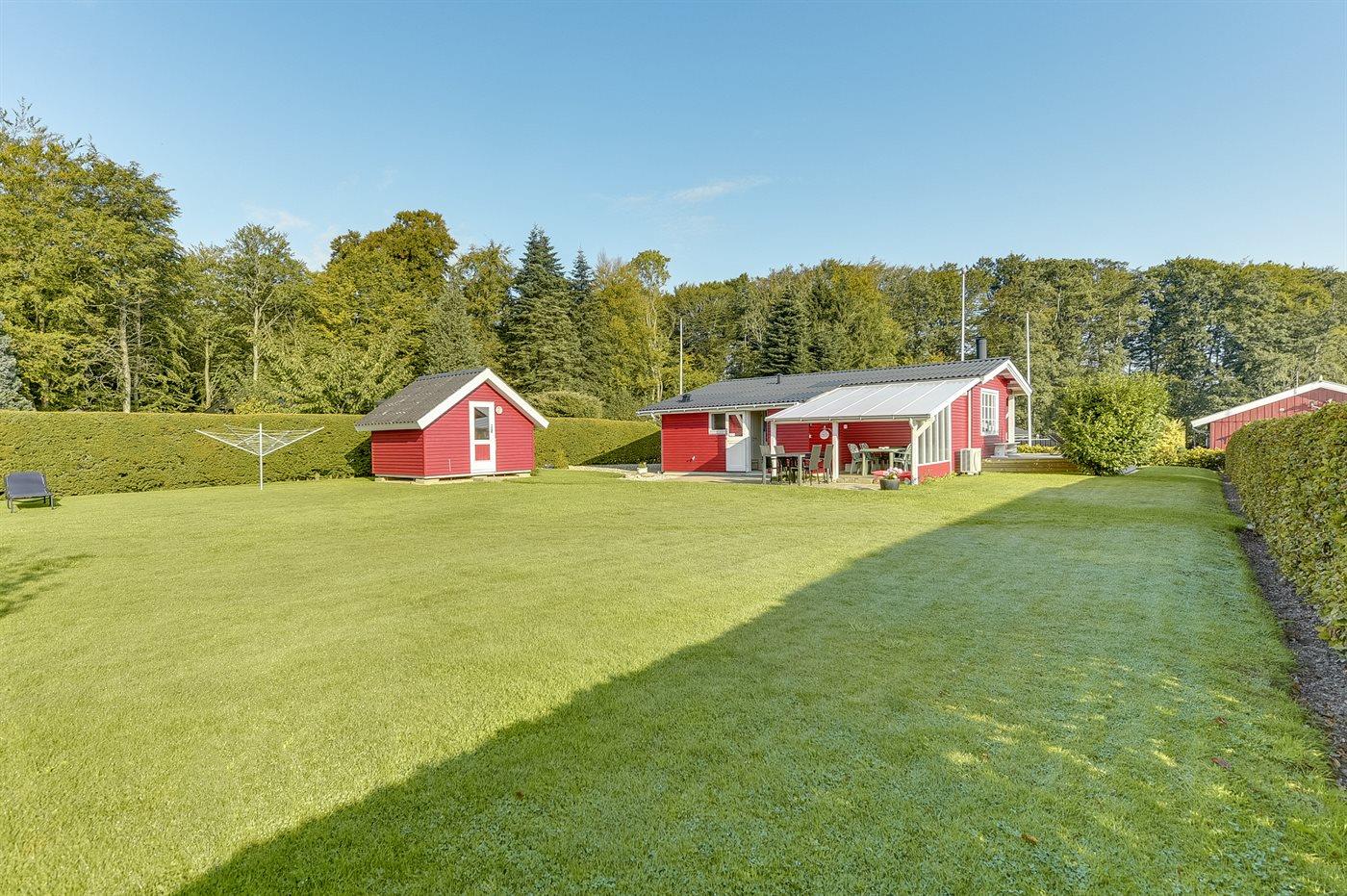 Ferieboligen er beliggende på en 801 m² stor havegrund. Der er 200 m til havet. Nærmeste forretning er beliggende i en afstand af 500 m. Til ferieboligen hører 20 m² terrasseareal. Desuden er der 20 m² overdækket terrasse. Sandkasse. Der er installeret stik til opladning af elbil. Type 2 stik. Med 11 kW ladeeffekt. Parkering ved ferieboligen.