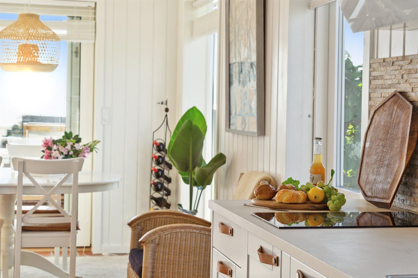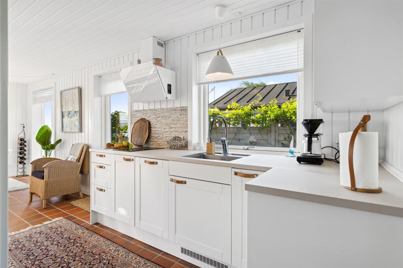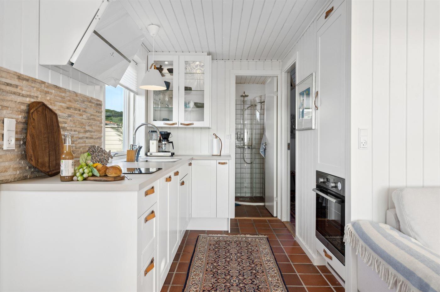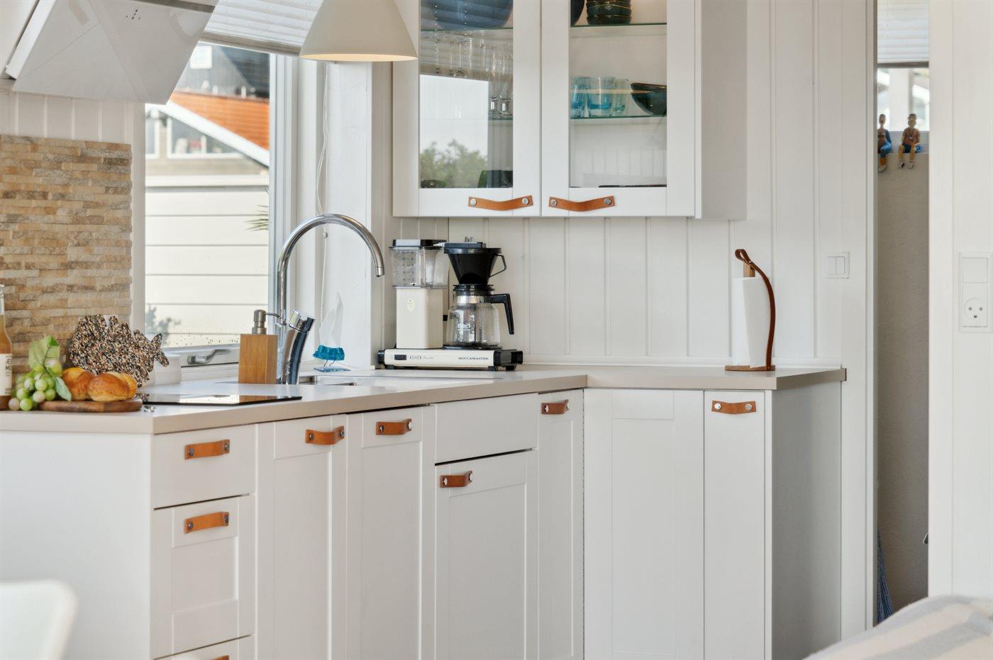 Køkkenet er udstyret med 1 køleskab. Der er 2 keramiske kogeplader, varmluftovn samt opvaskemaskine.