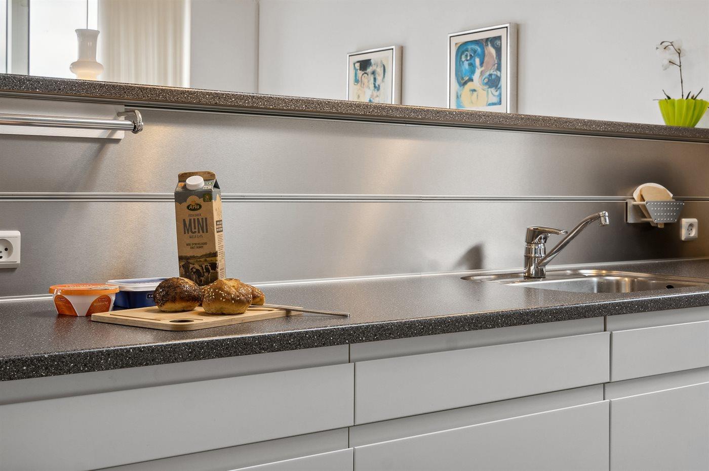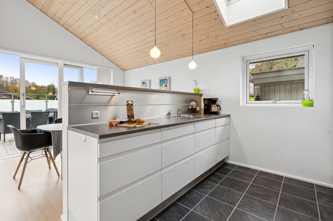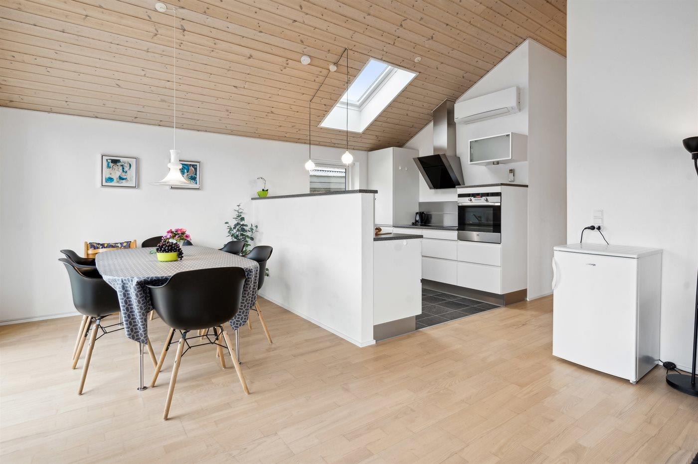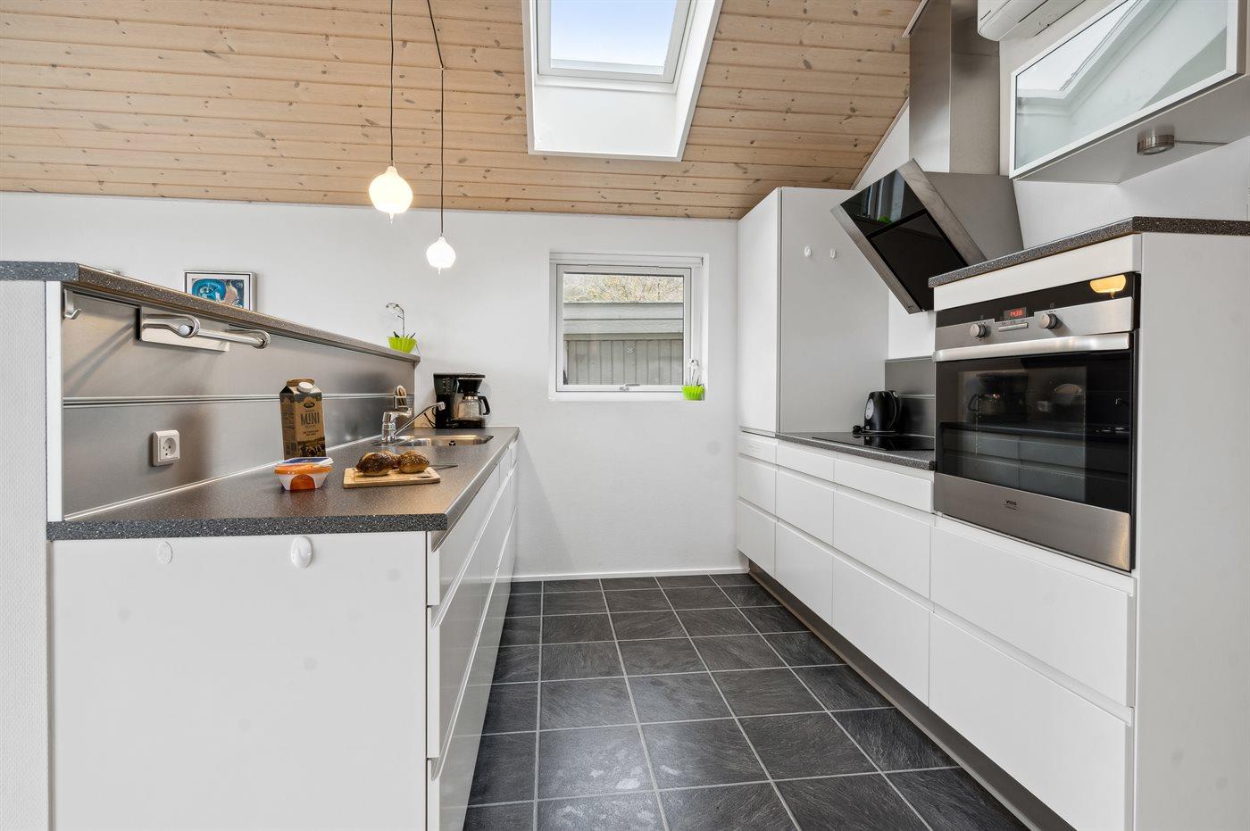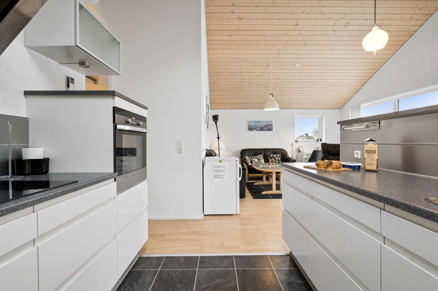 Køkkenet er udstyret med 2 køleskabe. Der er 4 keramiske kogeplader, varmluftovn, mikrobølgeovn samt opvaskemaskine.