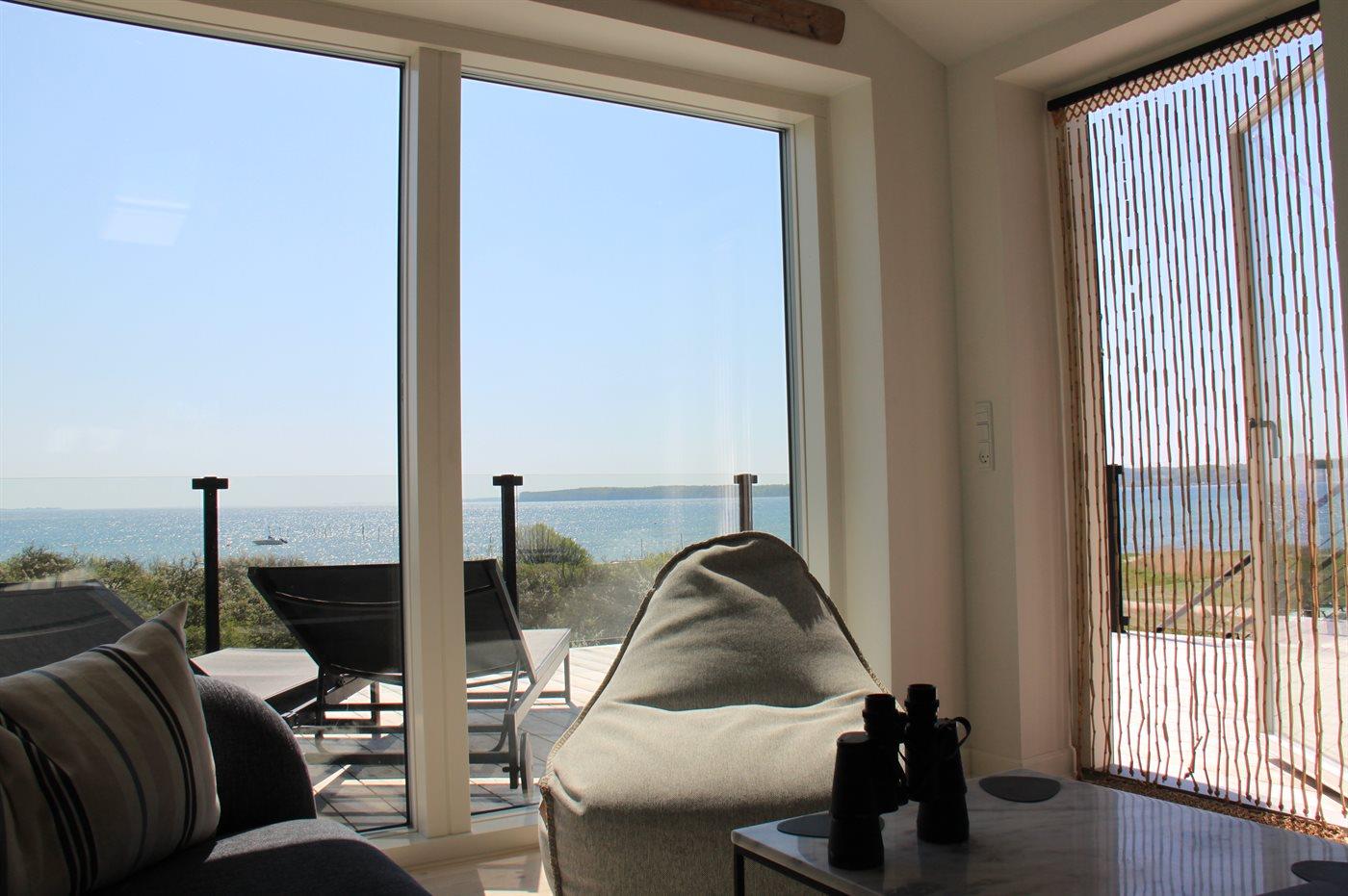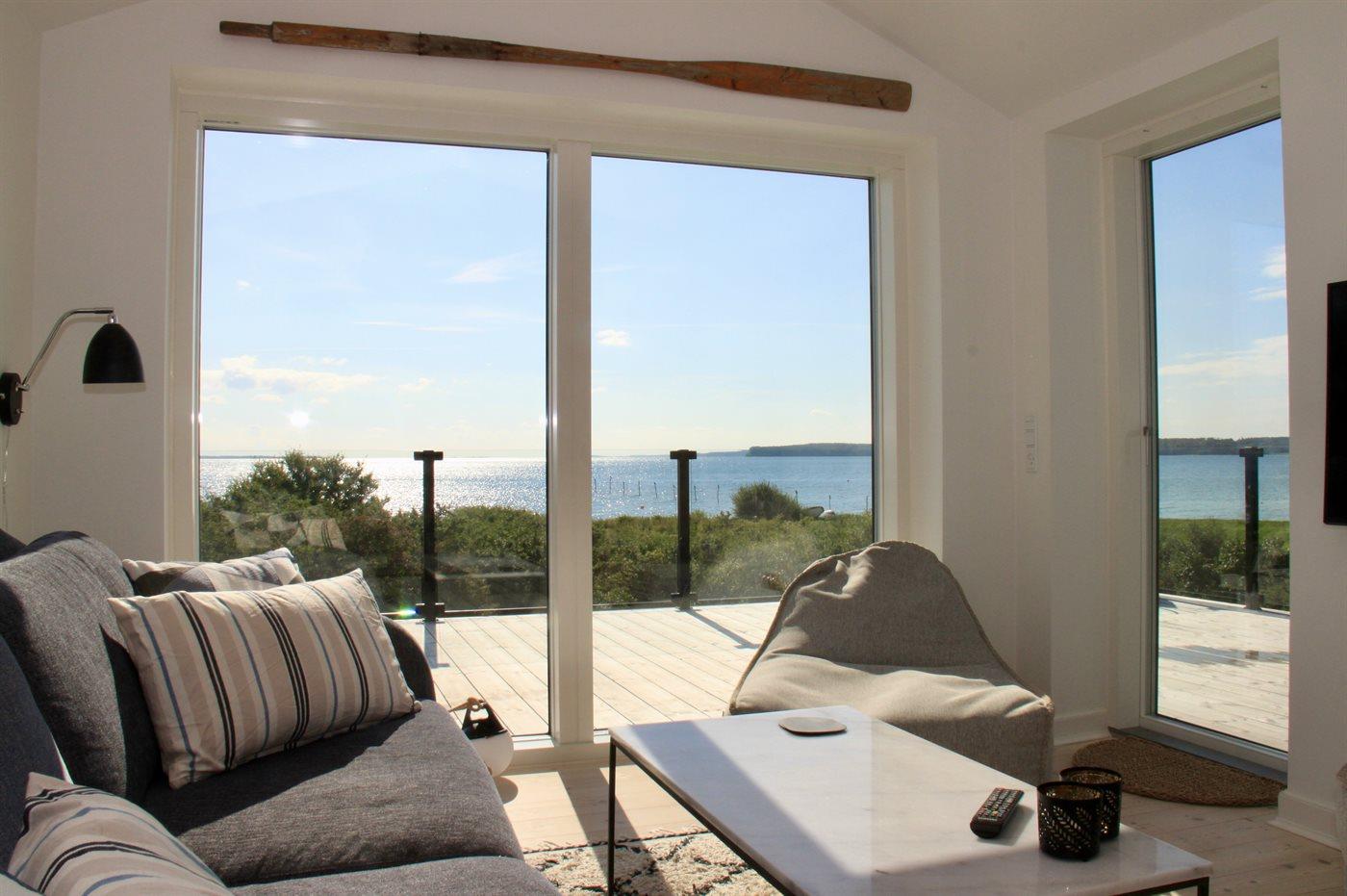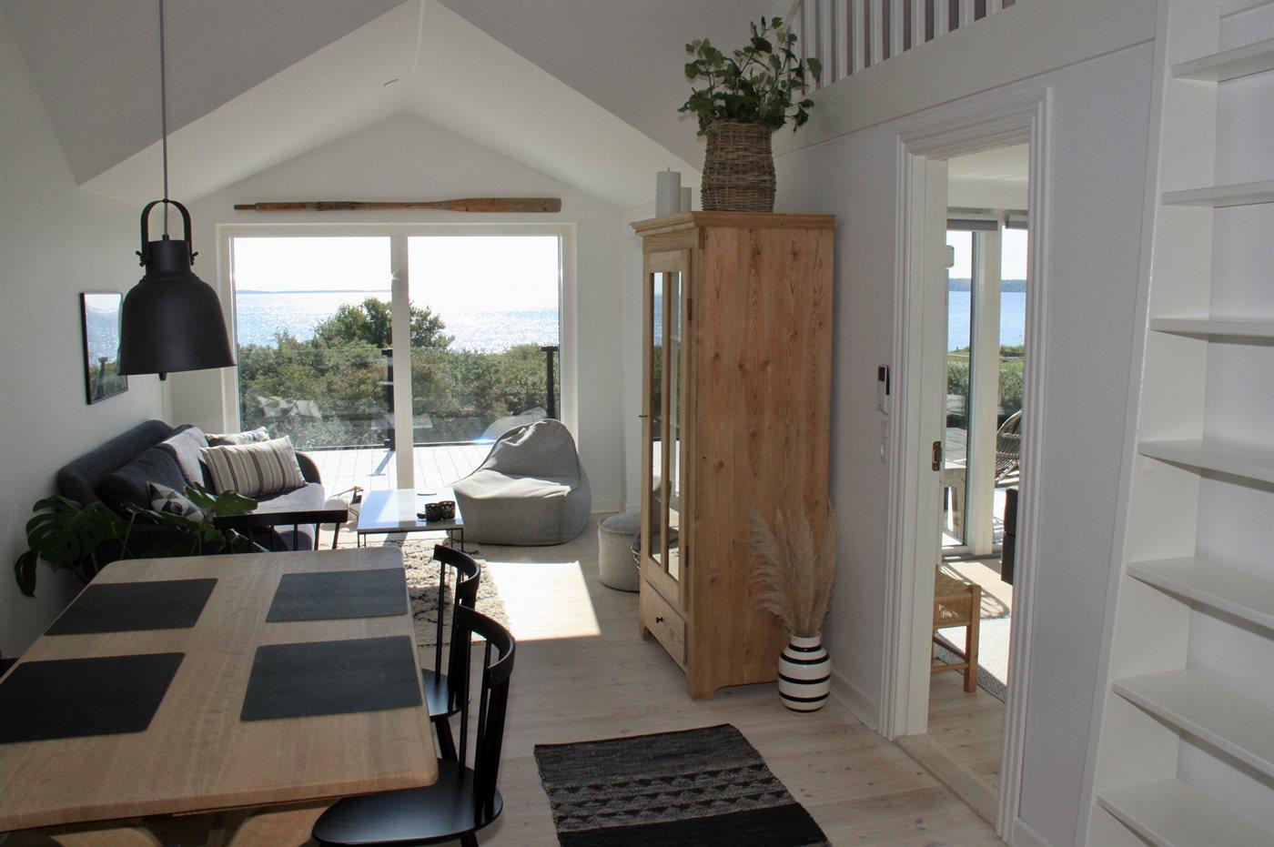 Indendørs mødes I af et lyst og åbent rum med loft til kip, der kombinerer moderne design med klassisk moderne sommerhusstemning. Soveværelset er indrettet, så I kan vågne op til den betagende udsigt – træk blot gardinerne fra og lad blikket glide ud over vandet.