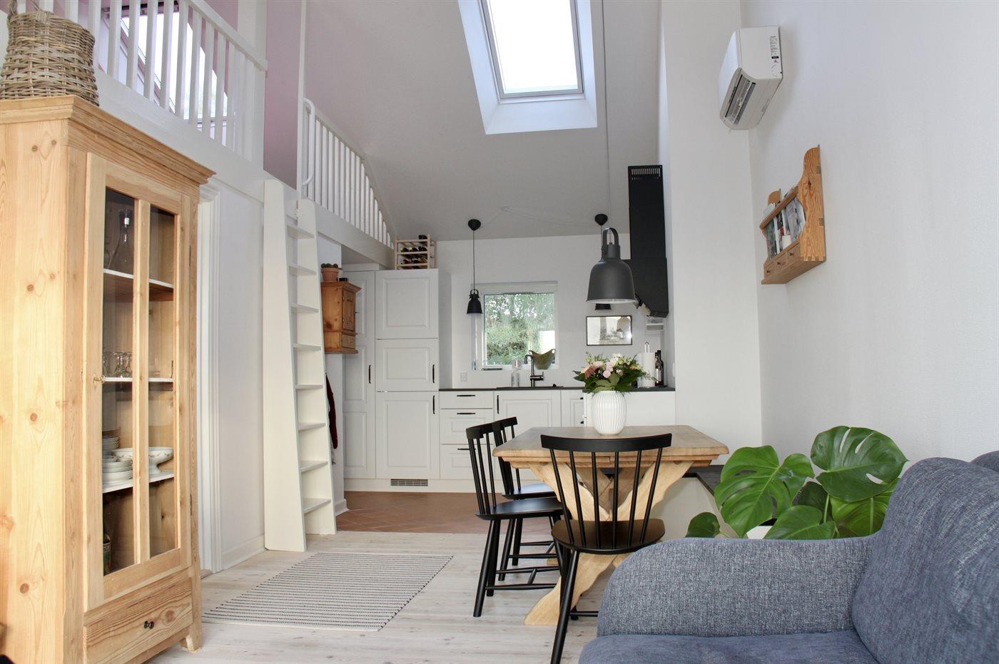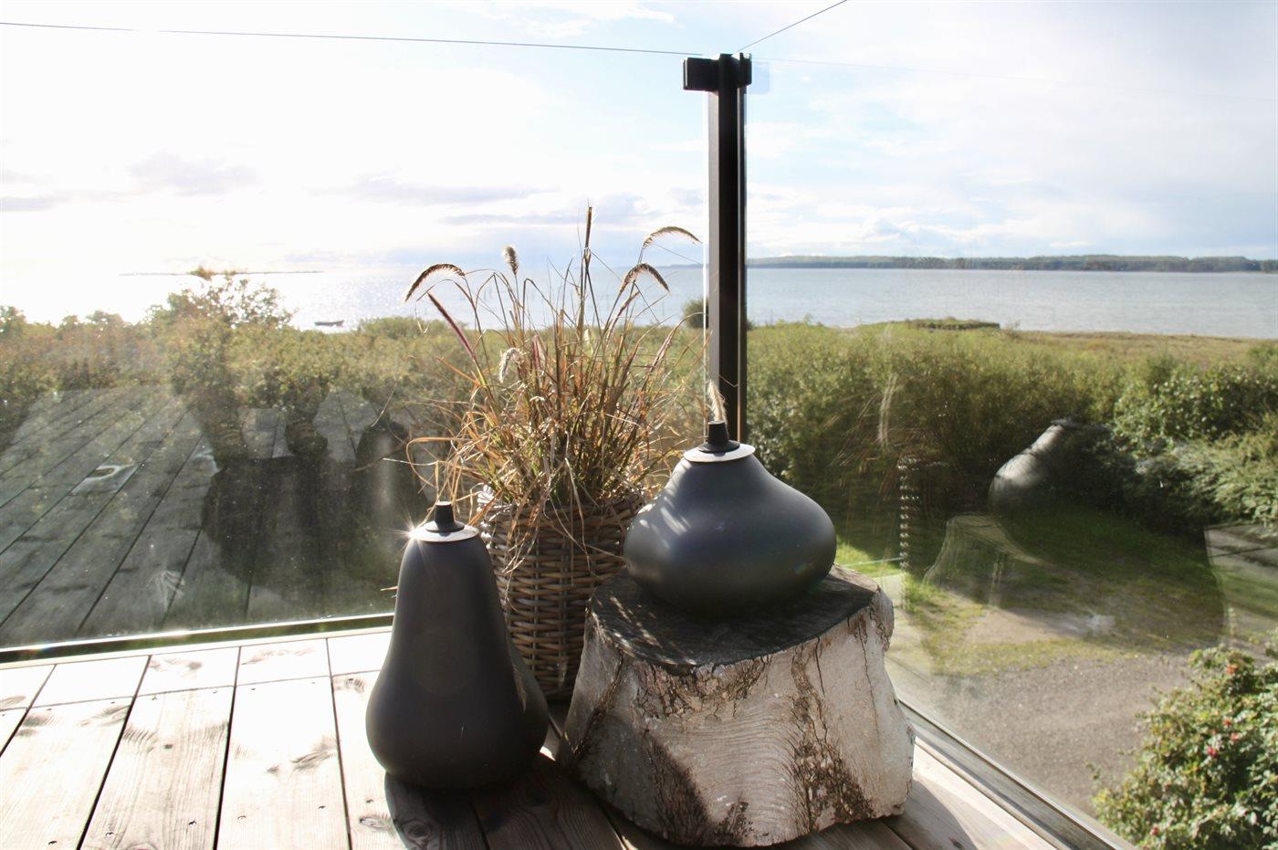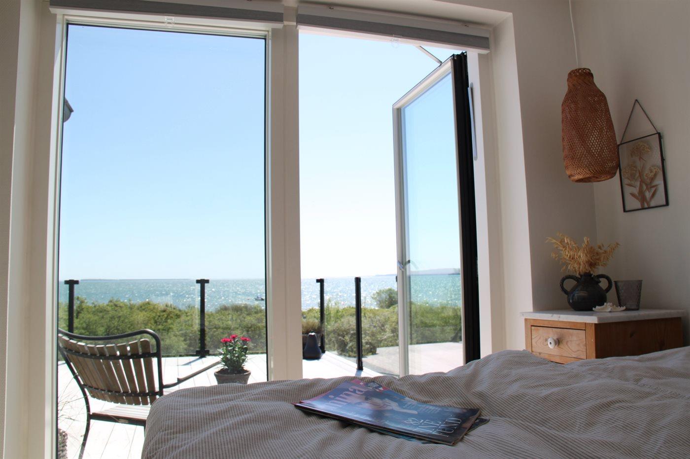 Indendørs mødes I af et lyst og åbent rum med loft til kip, der kombinerer moderne design med klassisk moderne sommerhusstemning. Soveværelset er indrettet, så I kan vågne op til den betagende udsigt – træk blot gardinerne fra og lad blikket glide ud over vandet.