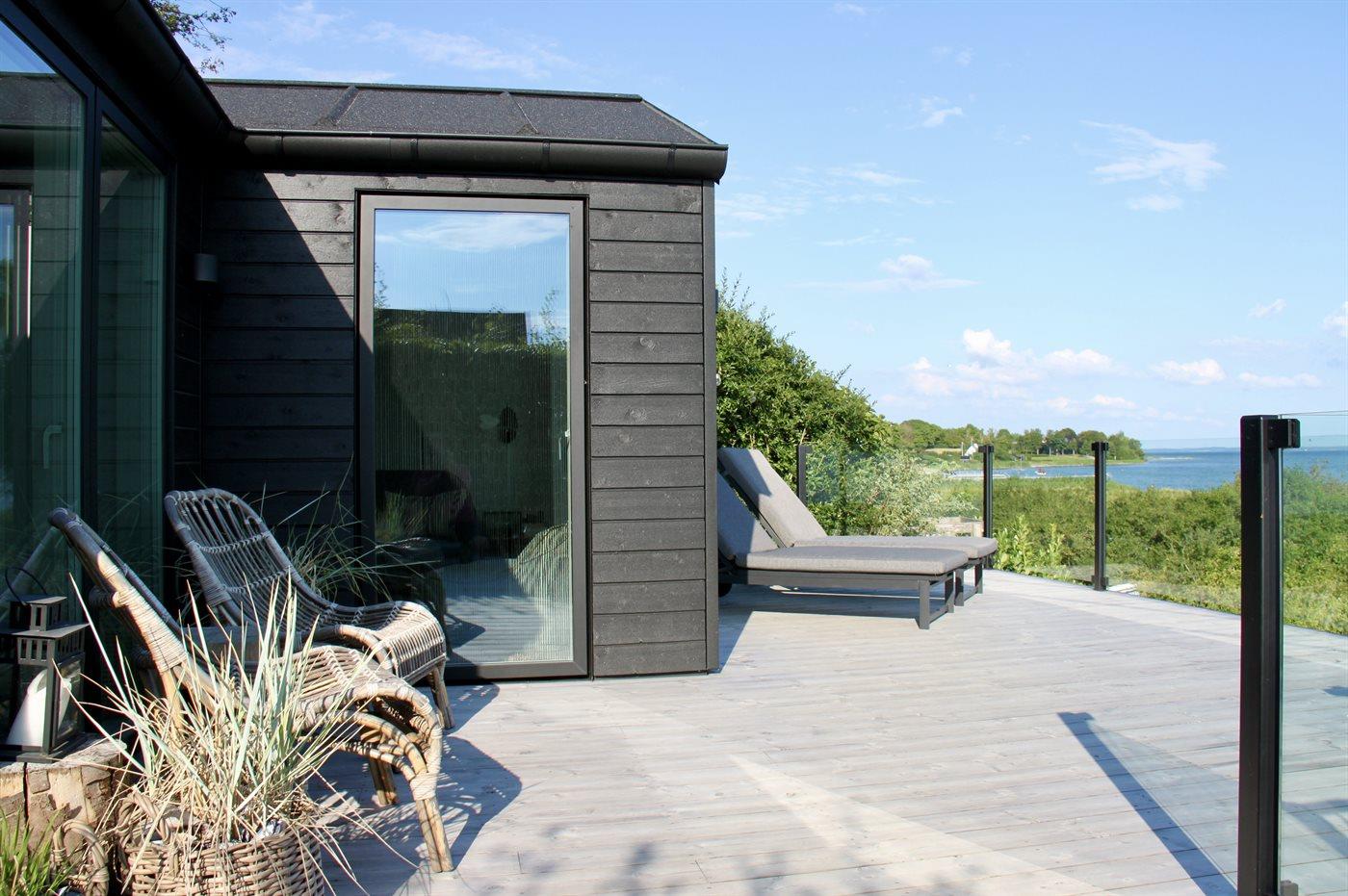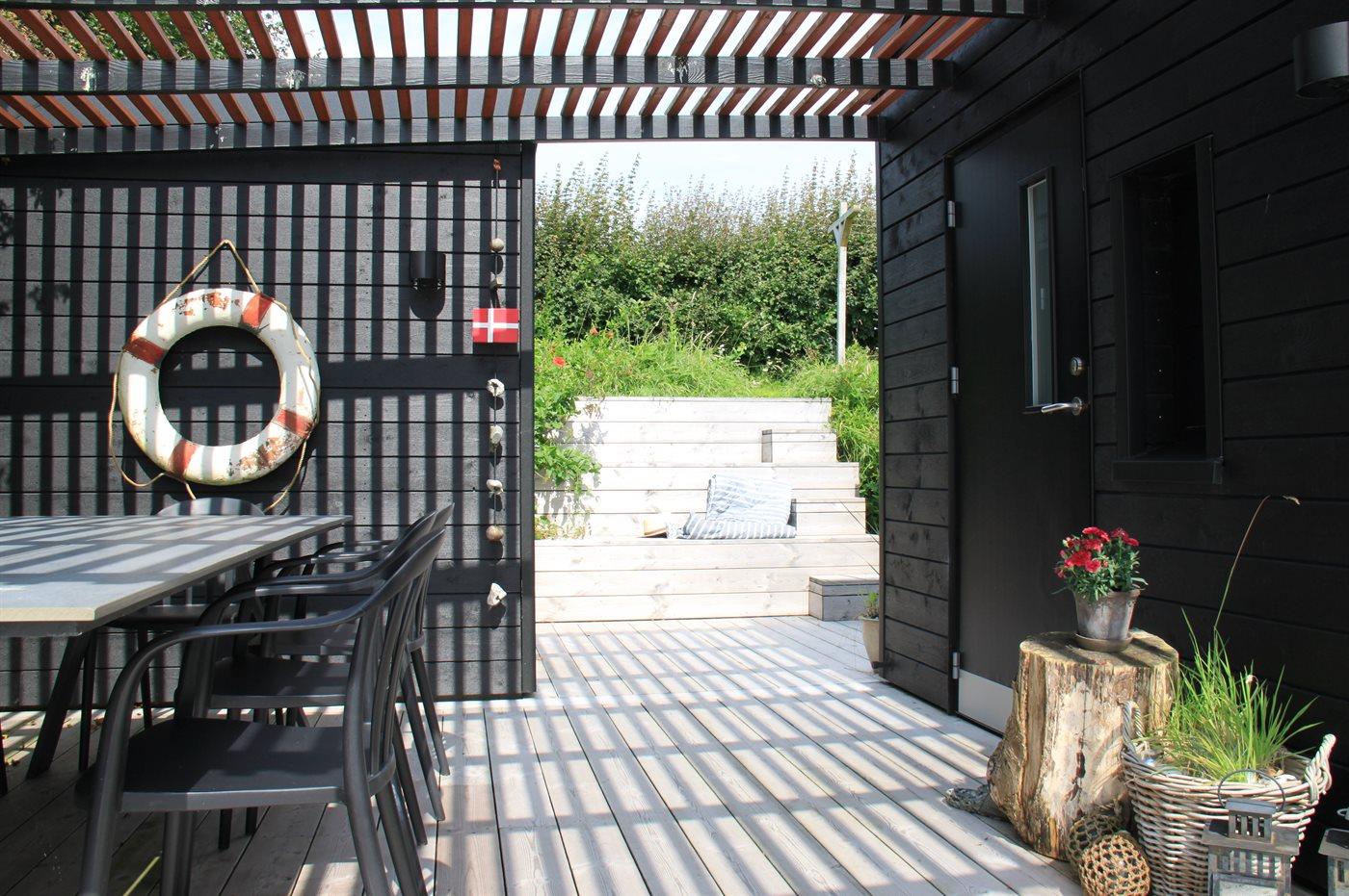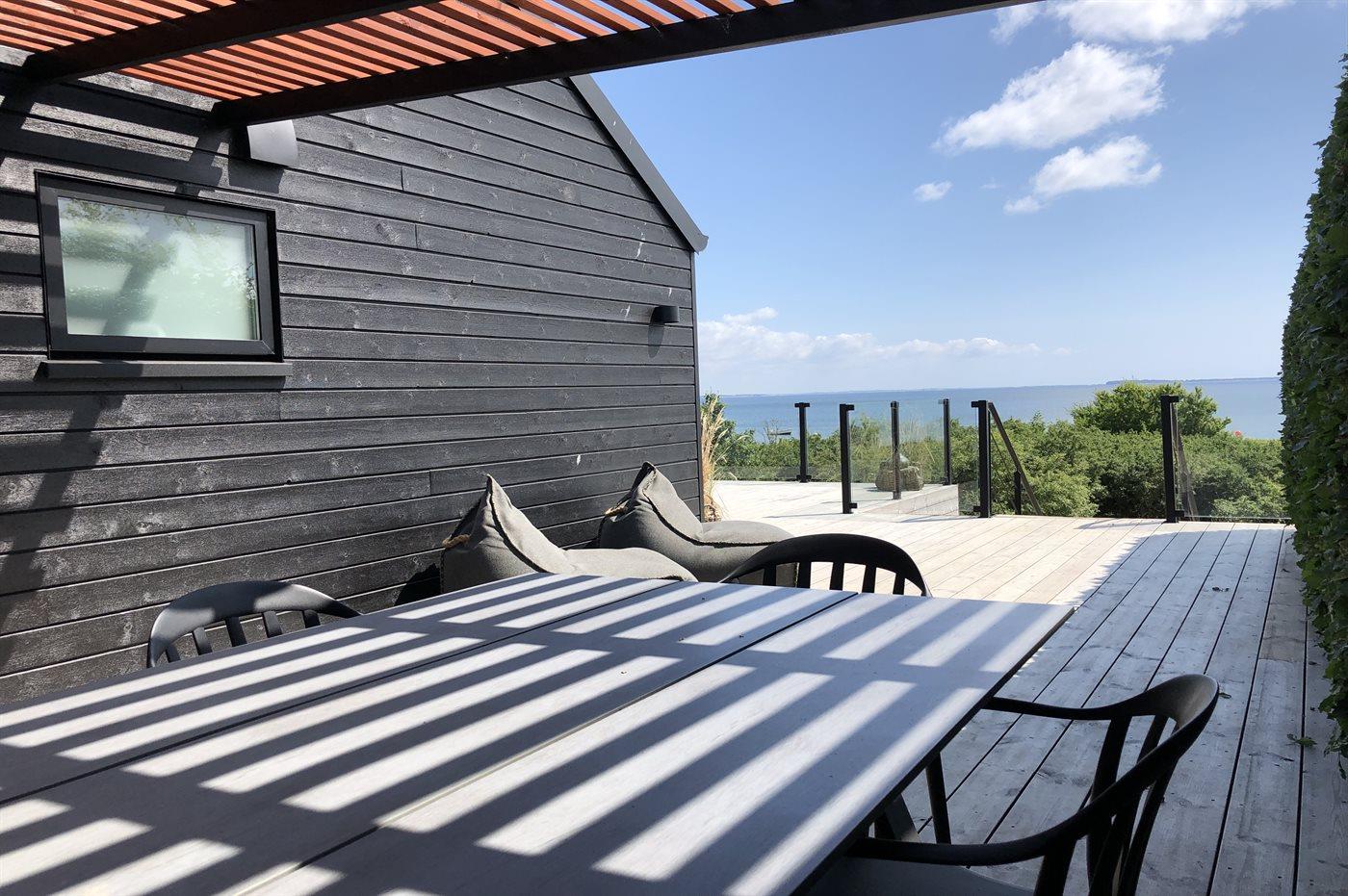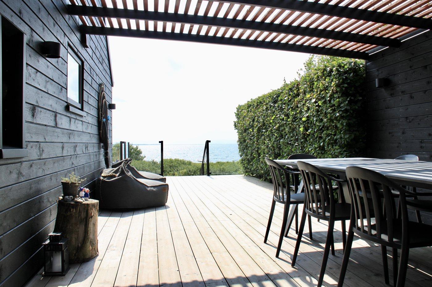 Den 120 m2 store træterrasse er en oase for udeliv, udstyret med hyggelige møbler og en pergola, der giver skygge på solrige dage. Terrassen er afskærmet med et elegant glasparti mod vandet, hvilket sikrer uforstyrret nydelse af udsigten. Bag huset finder I en hyggelig lille, vild have, samt en udendørs bruser, som giver mulighed for et forfriskende skyl efter en dag på stranden.
