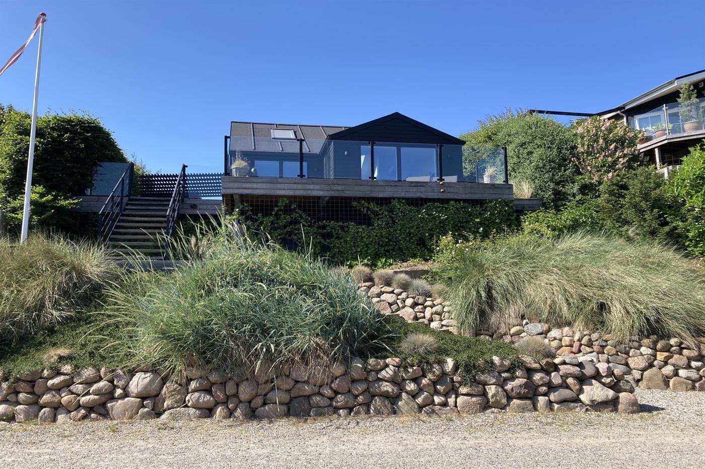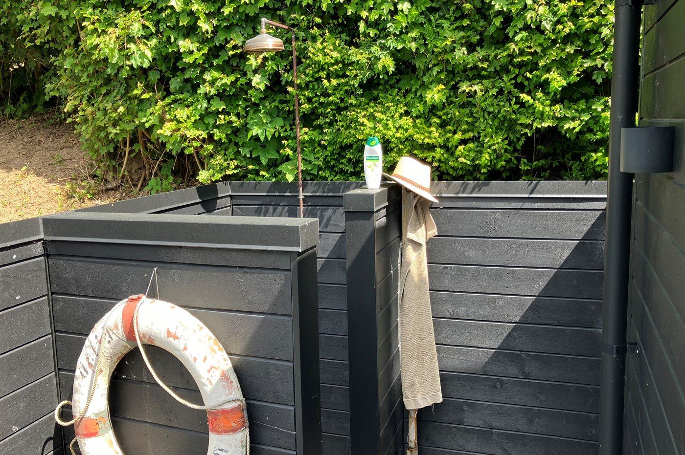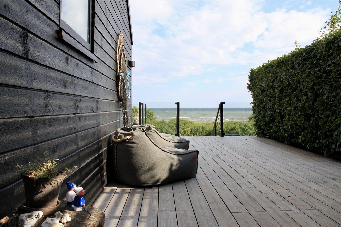 Den 120 m2 store træterrasse er en oase for udeliv, udstyret med hyggelige møbler og en pergola, der giver skygge på solrige dage. Terrassen er afskærmet med et elegant glasparti mod vandet, hvilket sikrer uforstyrret nydelse af udsigten. Bag huset finder I en hyggelig lille, vild have, samt en udendørs bruser, som giver mulighed for et forfriskende skyl efter en dag på stranden.