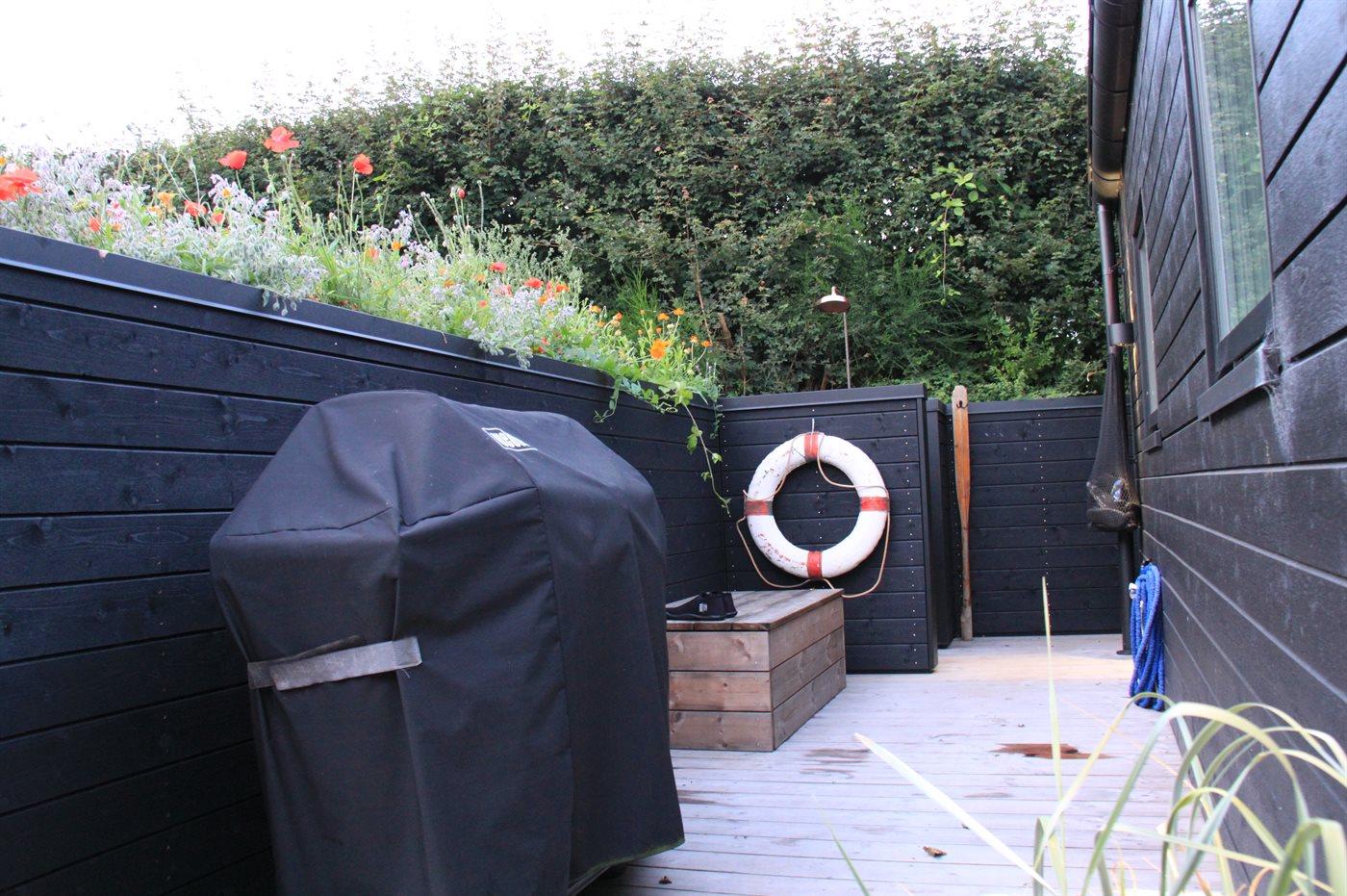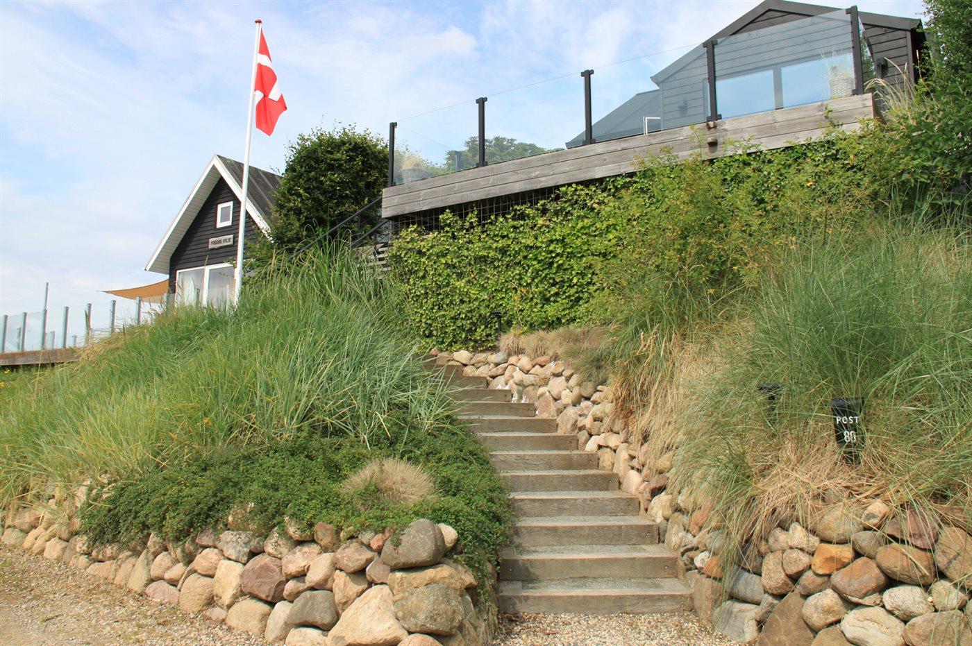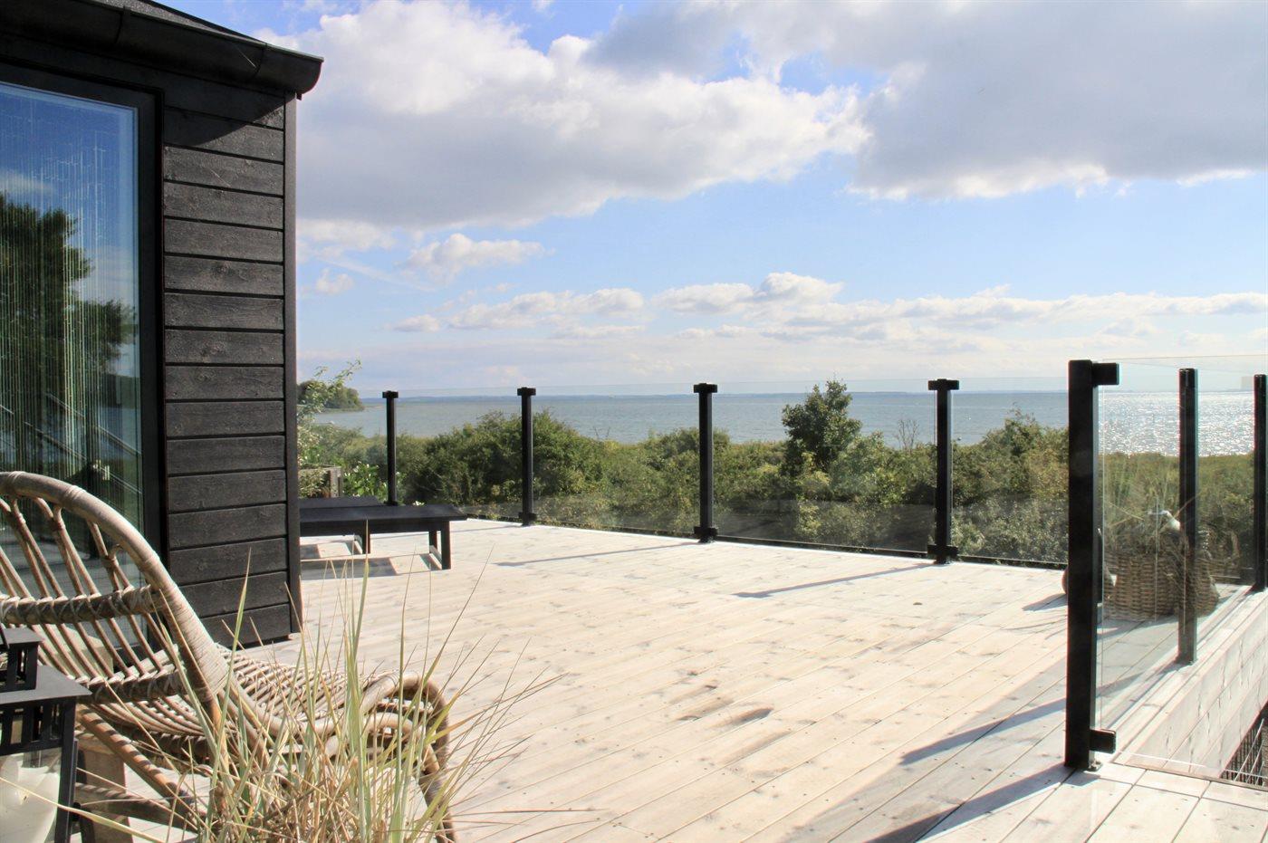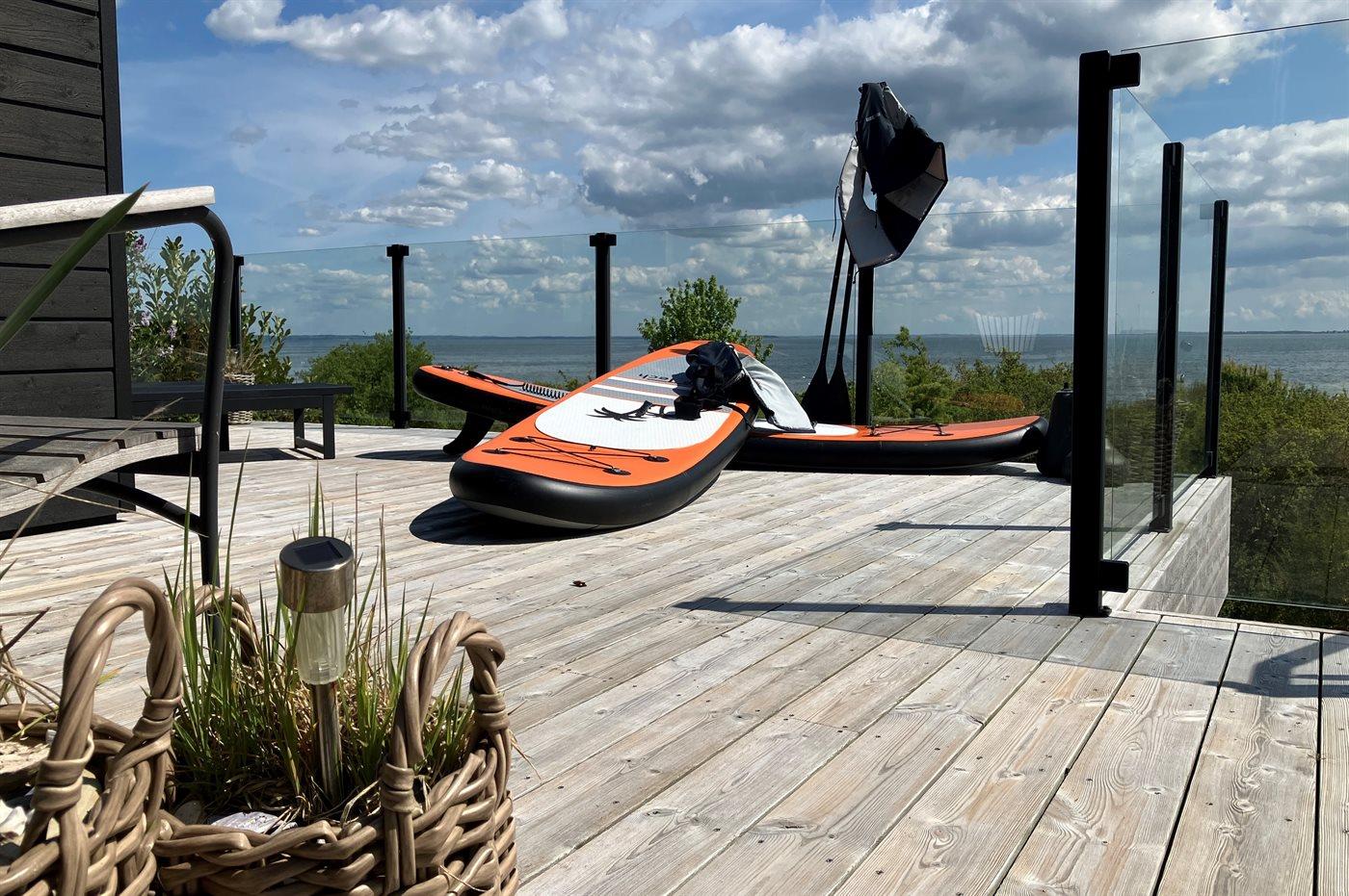 Den 120 m2 store træterrasse er en oase for udeliv, udstyret med hyggelige møbler og en pergola, der giver skygge på solrige dage. Terrassen er afskærmet med et elegant glasparti mod vandet, hvilket sikrer uforstyrret nydelse af udsigten. Bag huset finder I en hyggelig lille, vild have, samt en udendørs bruser, som giver mulighed for et forfriskende skyl efter en dag på stranden.