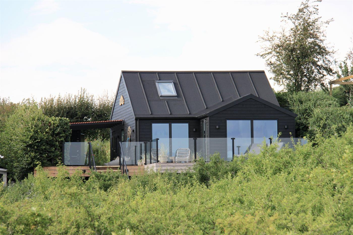 Oplev et charmerende sommerhus med panoramaudsigt over vandet og en stor træterrasse i Binderup.
