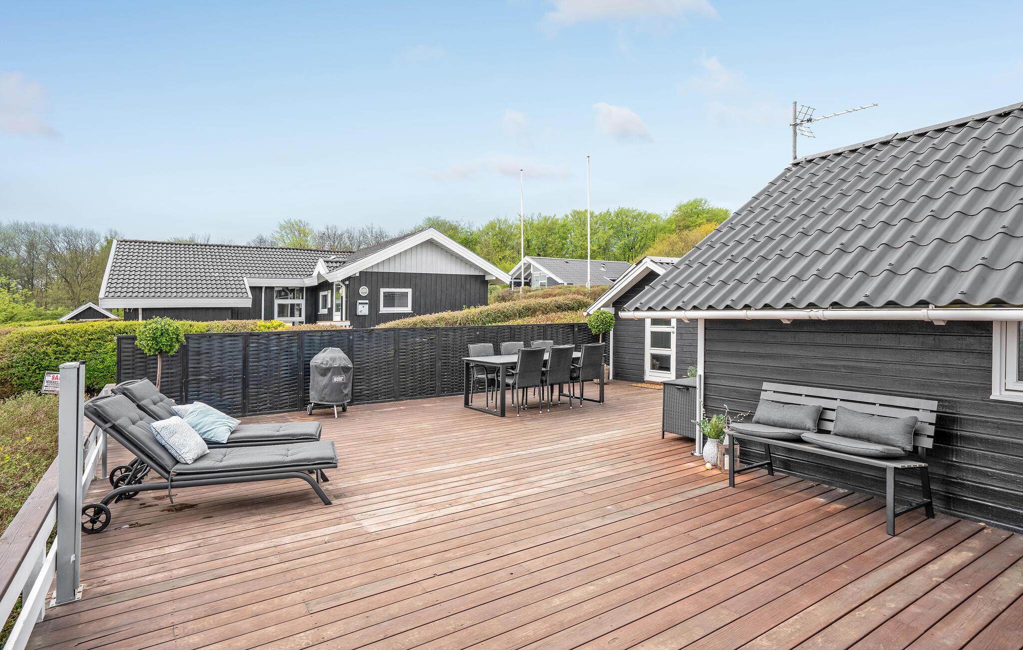 Terrassen har delvis overdækning, så I kan også spise frokost ude i den lette sommerregn. Det er også skønt at læne sig tilbage med en god bog på liggestolene eller tænde bål i haven sammen med børnene.