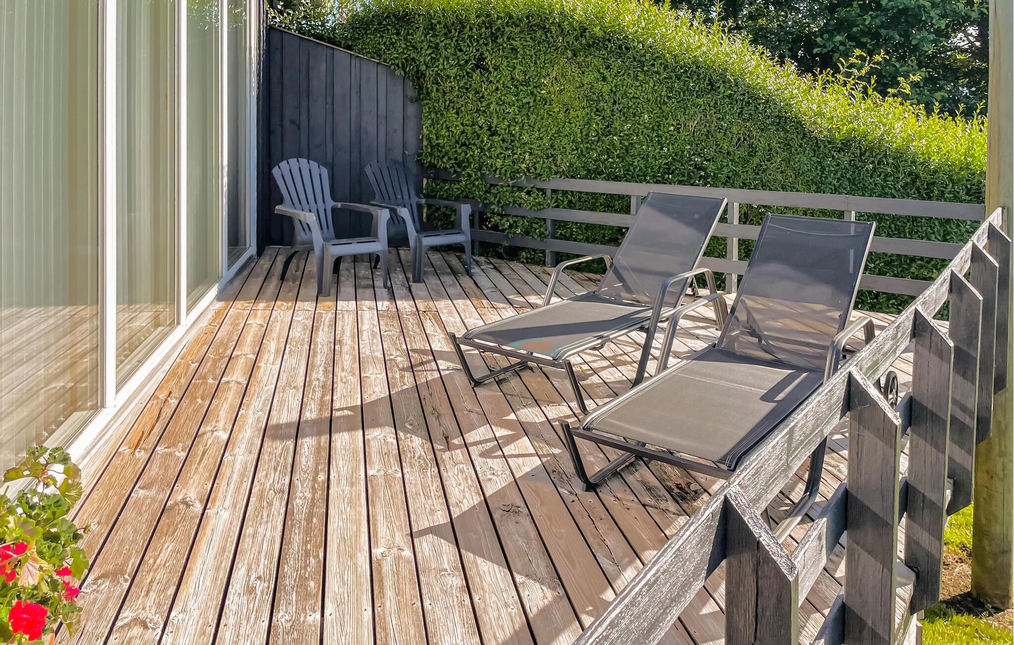 Herfra er der adgang til en stor træterrasse med flere solkroge, hvor I kan nyde sommervejret i fulde drag. Slap af under parasollen med en kold forfriskning, mens jeres børn leger på grunden.