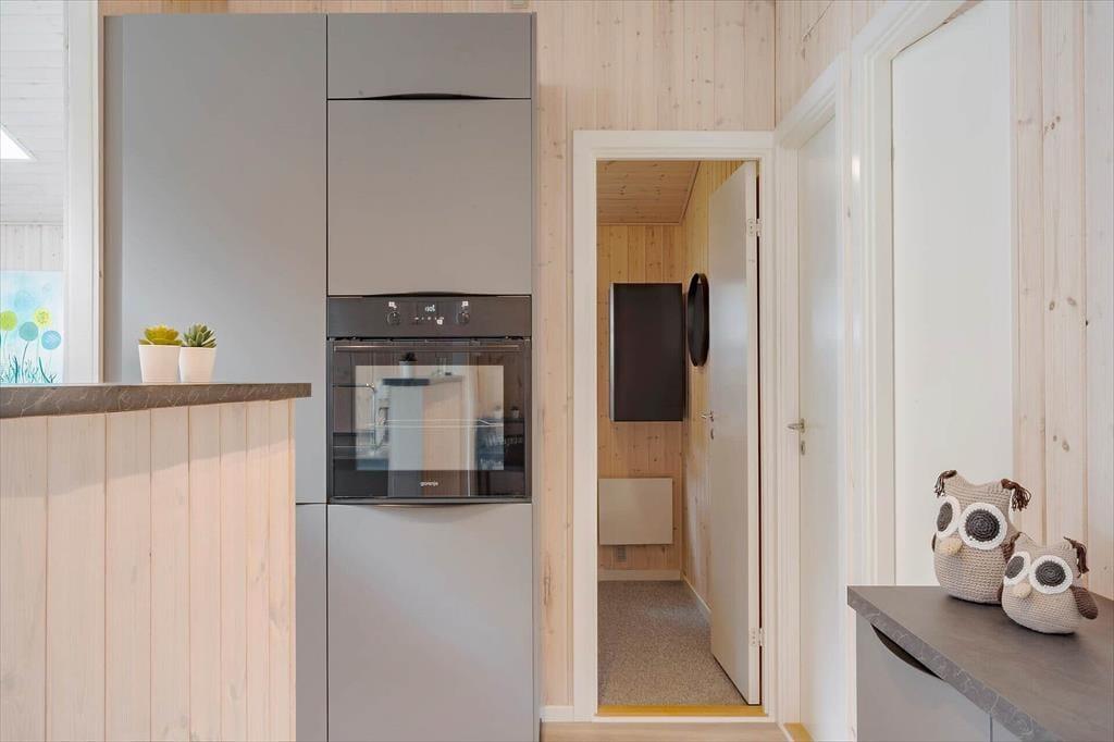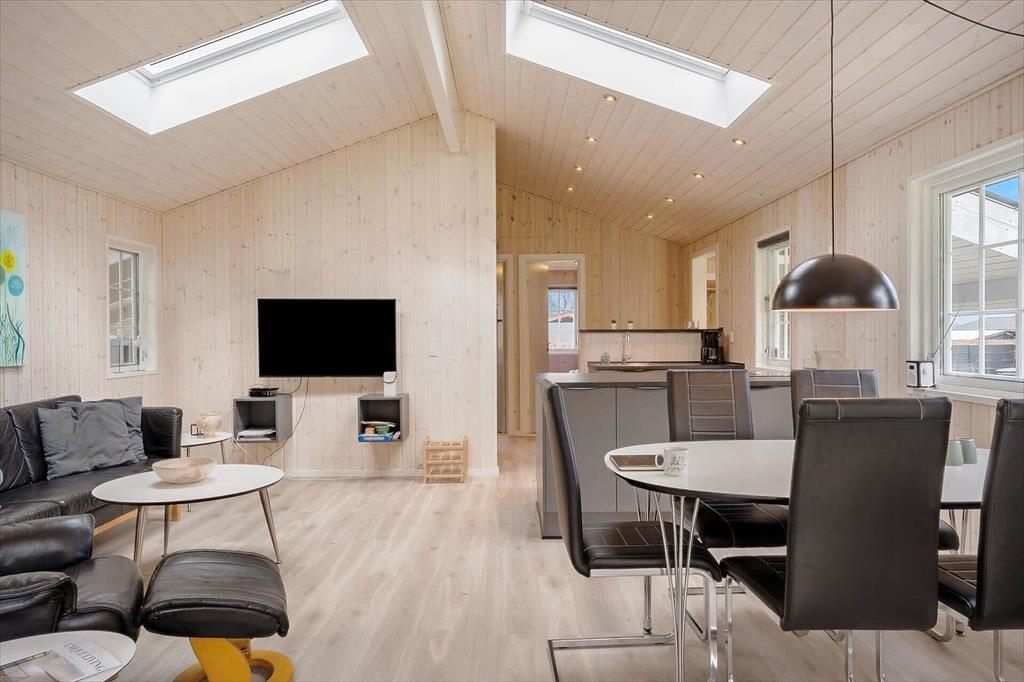 Indenfor mødes du af en lys og hyggeligt indrettet atmosfære, der straks indbyder til at sænke skuldrene og nyde ferien. Sommerhusets indretning er holdt i lyse nuancer, som sammen med dagslyset skaber en let og behagelig stemning i opholdsrummene. Her er der god plads til samvær, hvad enten I samles omkring spisebordet til fælles måltider eller slapper af i stuen med en god bog og en kop kaffe. På køligere dage bliver brændeovnen hurtigt et naturligt samlingspunkt, hvor flammernes knitren spreder varme og ægte sommerhushygge. Forestil dig en rolig aften, hvor regnen trommer let mod ruden, mens ilden knitrer, og ferieroen sænker sig. Indretningen er både funktionel og stemningsfuld, så du nemt føler dig hjemme fra første øjeblik – et sommerhus, der indbyder til nærvær og afslapning i trygge rammer.