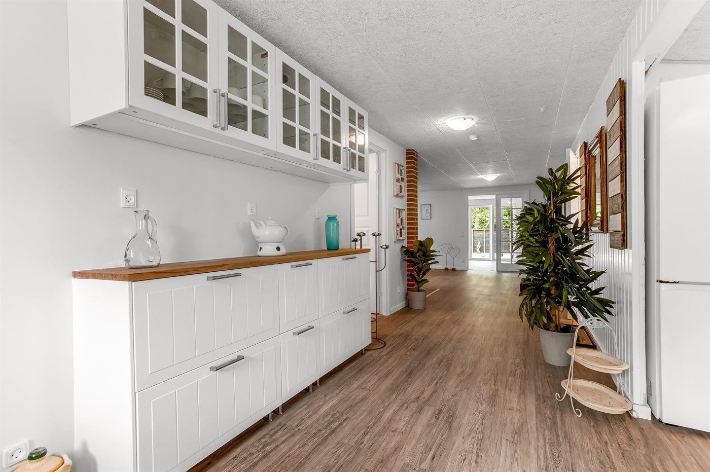Køkkenet er udstyret med 1 køleskab. Der er 4 keramiske kogeplader, varmluftovn, mikrobølgeovn, Airfryer samt opvaskemaskine.