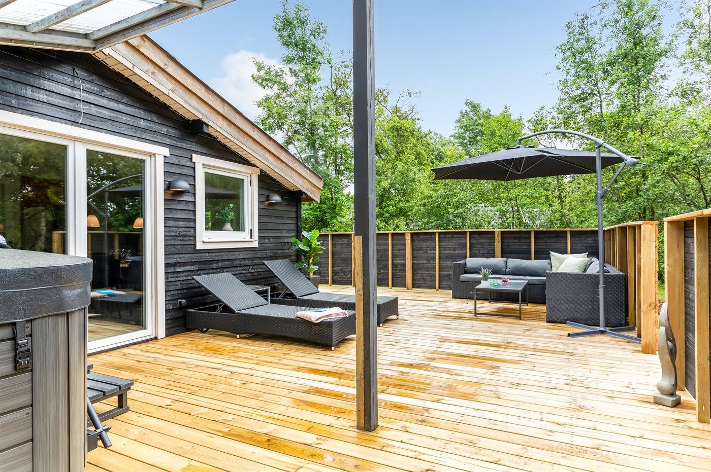 Skønt sommerhus i Hals med stor lukket terrasse, hundehave og udendørs spa for afslapning.