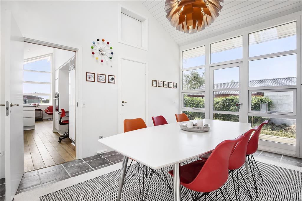 Feriehuset er indrettet med kombineret køkken og opholdsstue. Nyt lyst køkken med indbygget ovn, kogeplader med induktion, køleskab, mikroovn og opvaskemaskine. Opholdsstue med udgang til delvis overdækket terrasse og med et stort lysindfald fra de store vinduespartier. Loft til kip. Sofaafdeling med stor hjørnesofa og TV med Waoo lille Tv pakke. Separat spisestue med adgang til værelser og hems. Flot stort badeværelse med bruseniche og spa. To soveværelser. Et med dobbeltseng og et med 2 enkeltsenge. Desuden er der en hems med 3 sovepladser på madrasser. Udhus med vaskemaskine og fryser. Huset opvarmes med gulvvarme, som der er i hele huset.