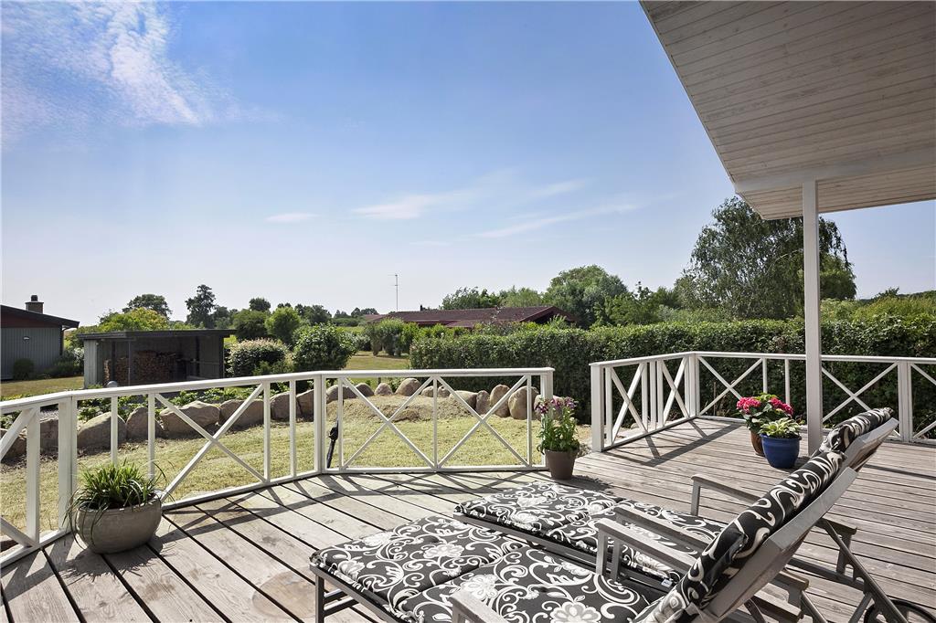 Huset er højt beliggende på en 539 m2 grund med en flot udsigt ud over vandet. Udover en delvis overdækket træterrasse foran huset er der en stor afskærmet solgård, hvor der en markise som kan overdække den. Ved huset er der havemøbler, liggestole, parasol og grill.