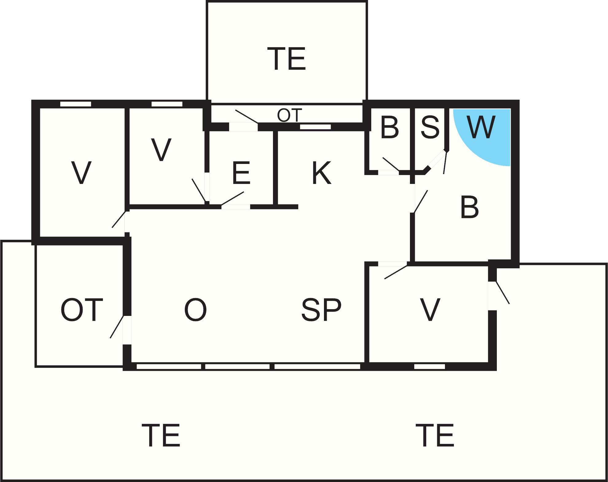 Indenfor bydes du velkommen af ??en funktionel entré med plads til frakker og sko. Herfra kommer du ind i et soveværelse med to enkeltsenge. Den lyse stue har store vinduespartier, hyggelig brændeovn og direkte udgang til en 21 m² overdækket terrasse. Det åbne køkken er godt integreret med spisepladsen. Fra stuen når du også et soveværelse med dobbeltseng, mens et andet soveværelse med egen terrasse er placeret ud for gangen. En lille hems med to ekstra sovepladser giver ekstra plads, især for børn.