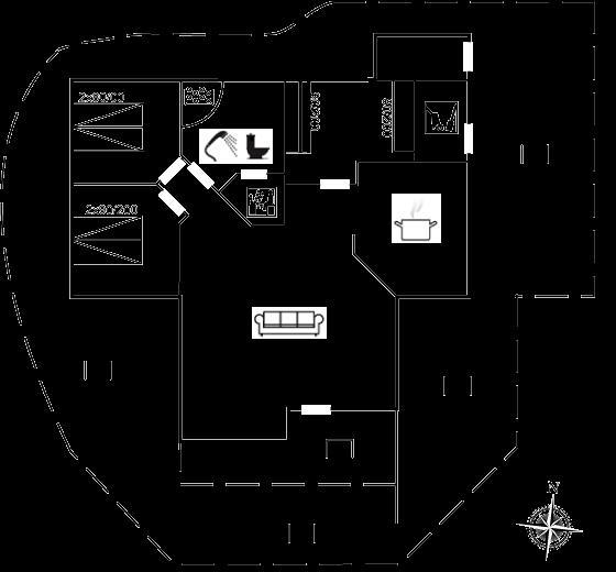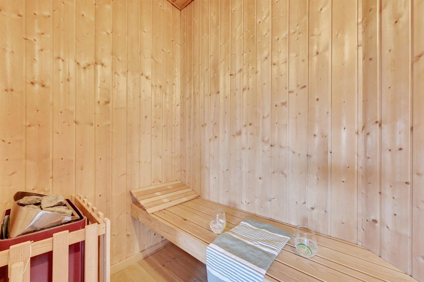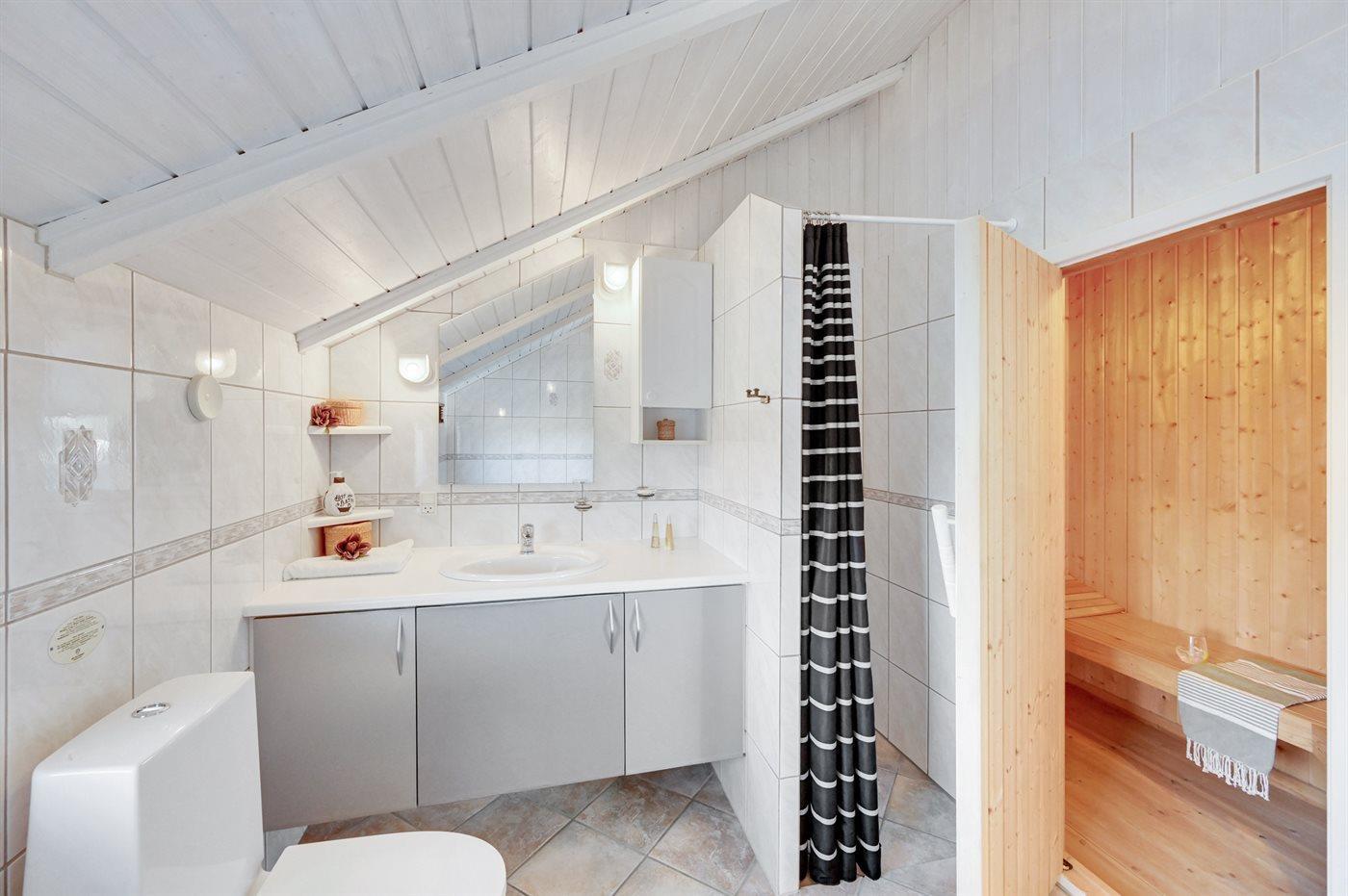 Der er 1 badeværelse med bruser og 1 toilet.. Der er gulvvarme på 1 badeværelse. I saunaen er der mulighed for afslapning.