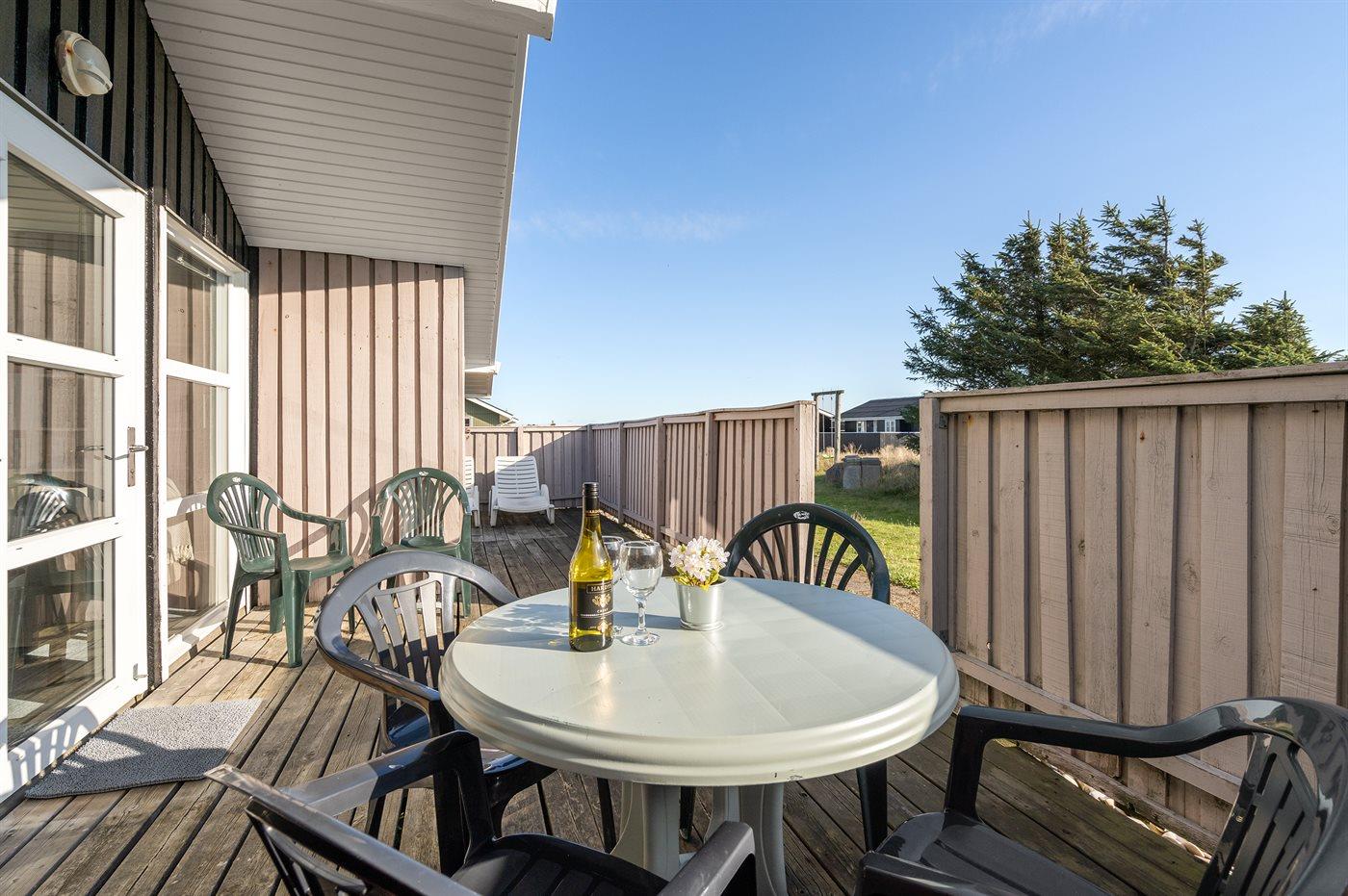 Ferieboligen er beliggende på en 1200 m² stor naturgrund. Der er 400 m til havet. Nærmeste forretning er beliggende i en afstand af 2000 m. Til ferieboligen hører 20 m² terrasseareal. Desuden er der overdækket terrasse. Parkering ved ferieboligen.