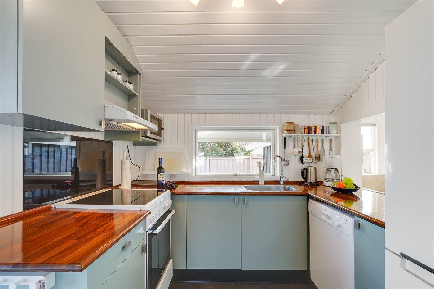 Køkkenet er udstyret med 1 køleskab. Der er 4 keramiske kogeplader, varmluftovn, mikrobølgeovn samt opvaskemaskine.