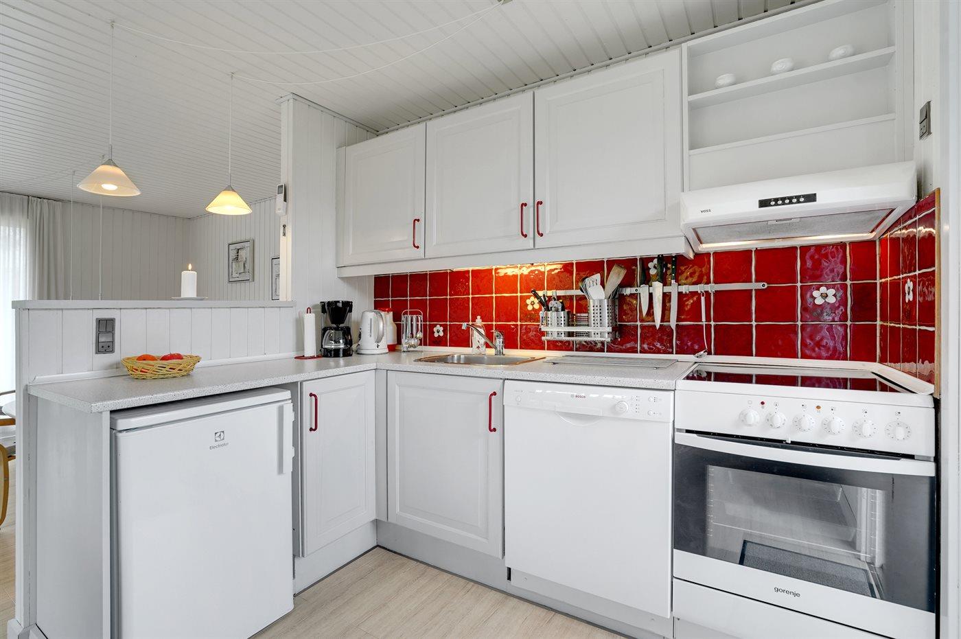 Køkkenet er udstyret med 1 køleskab. Der er 4 elkogeplader, bageovn samt opvaskemaskine.