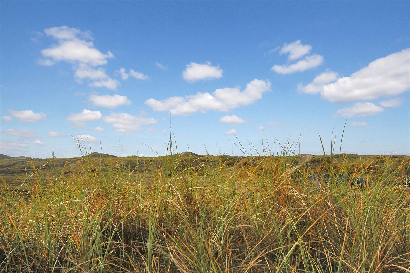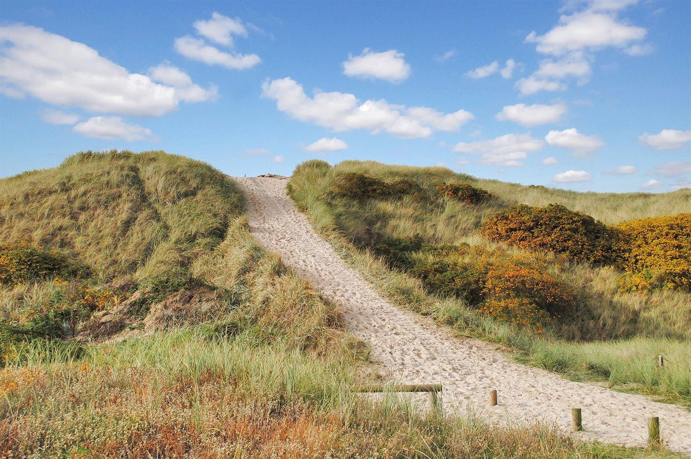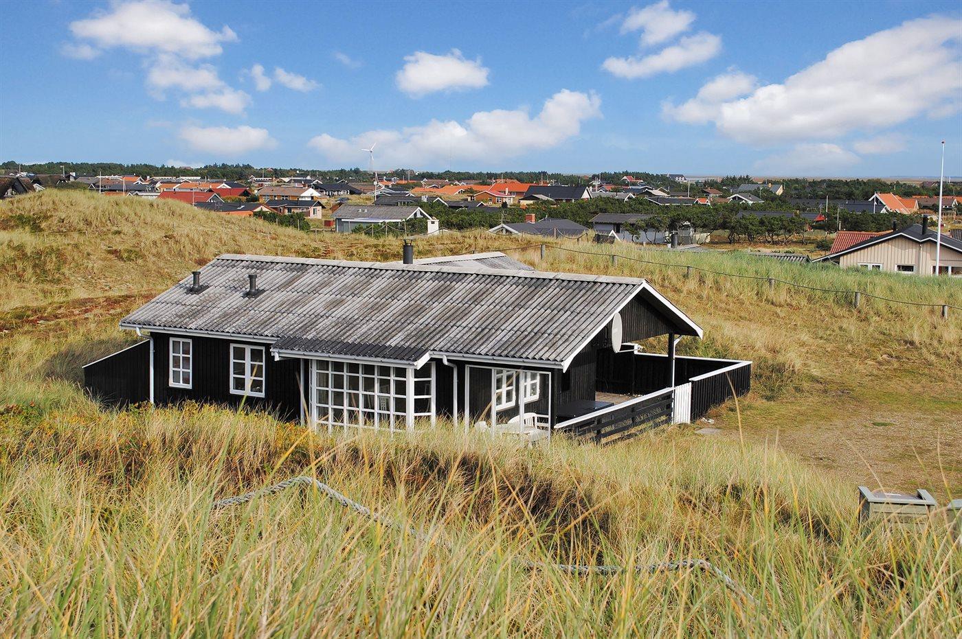 Sommerhus beliggende på en åben og kuperet grund tæt ved stranden og Vesterhavet.