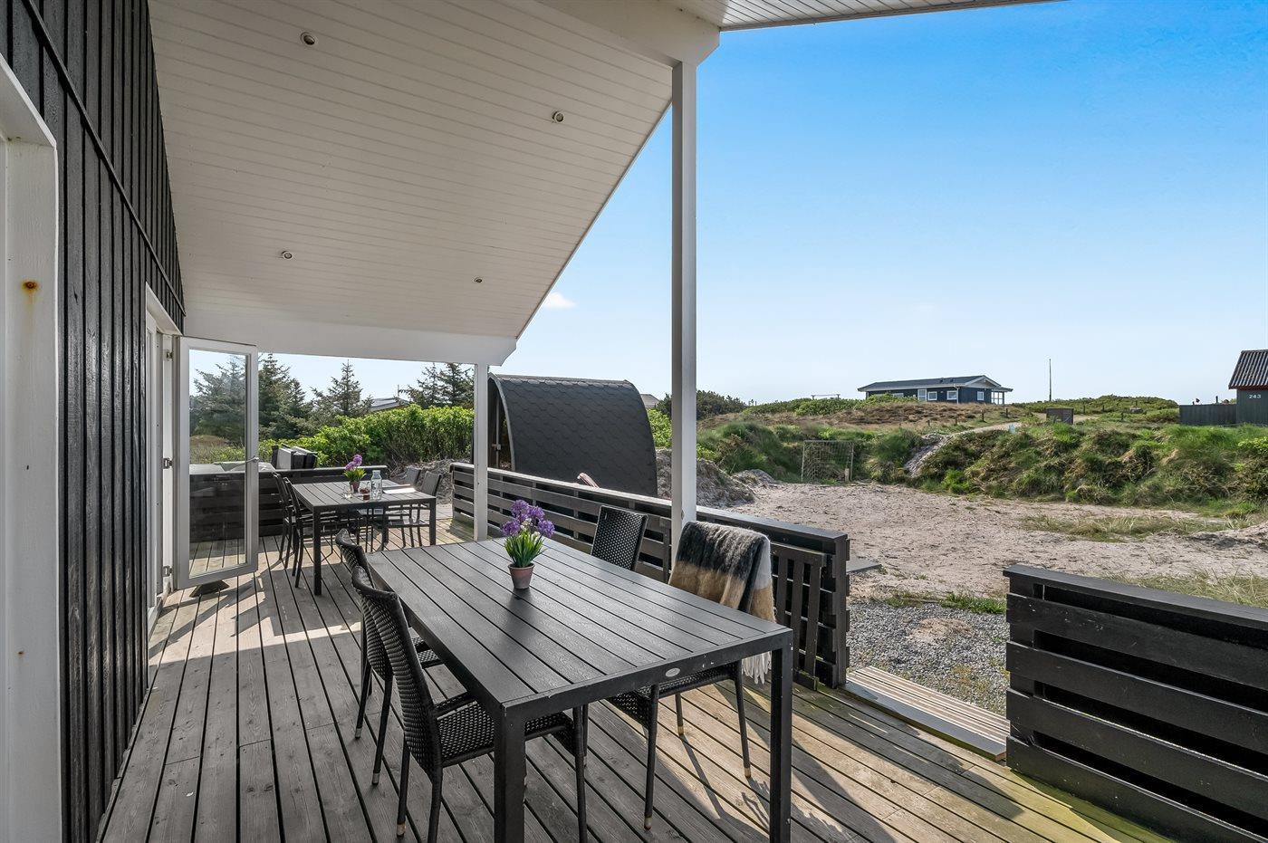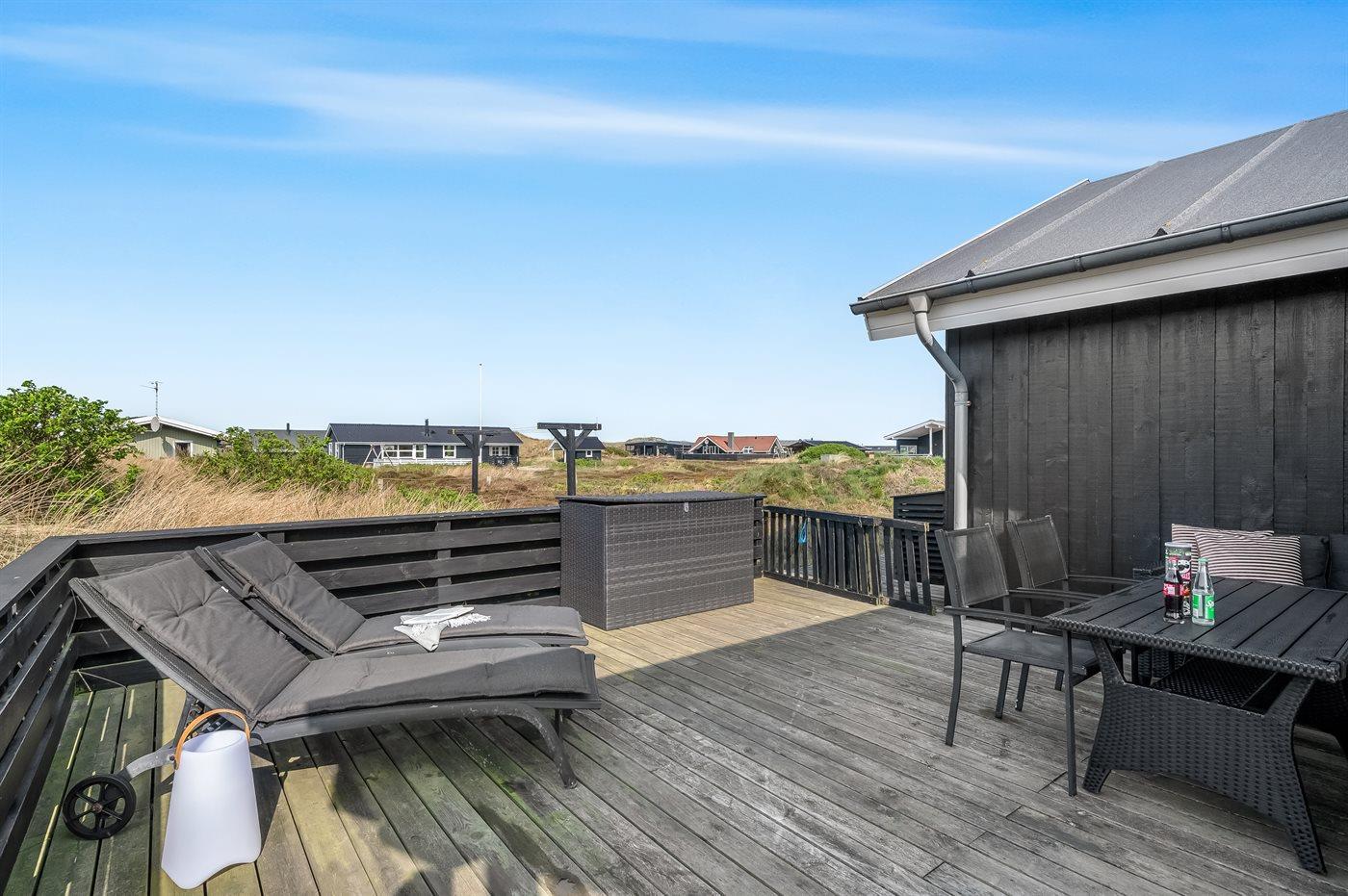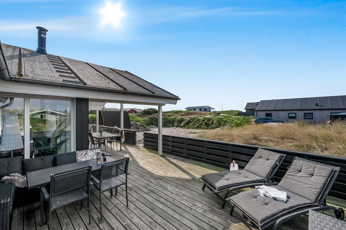 Hyggeligt sommerhus nær Vesterhavet med spa, sauna og stor terrasse til afslapning.