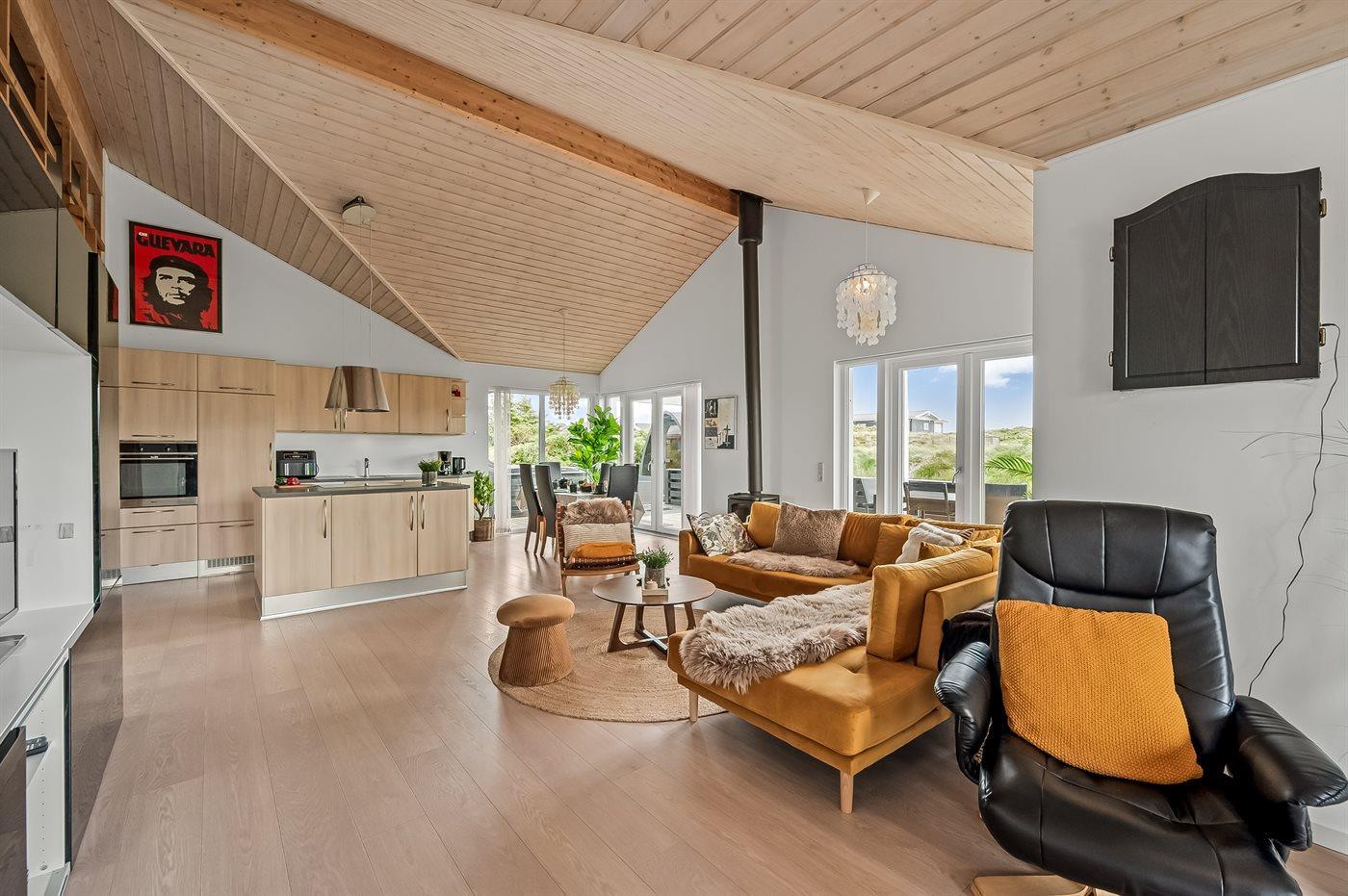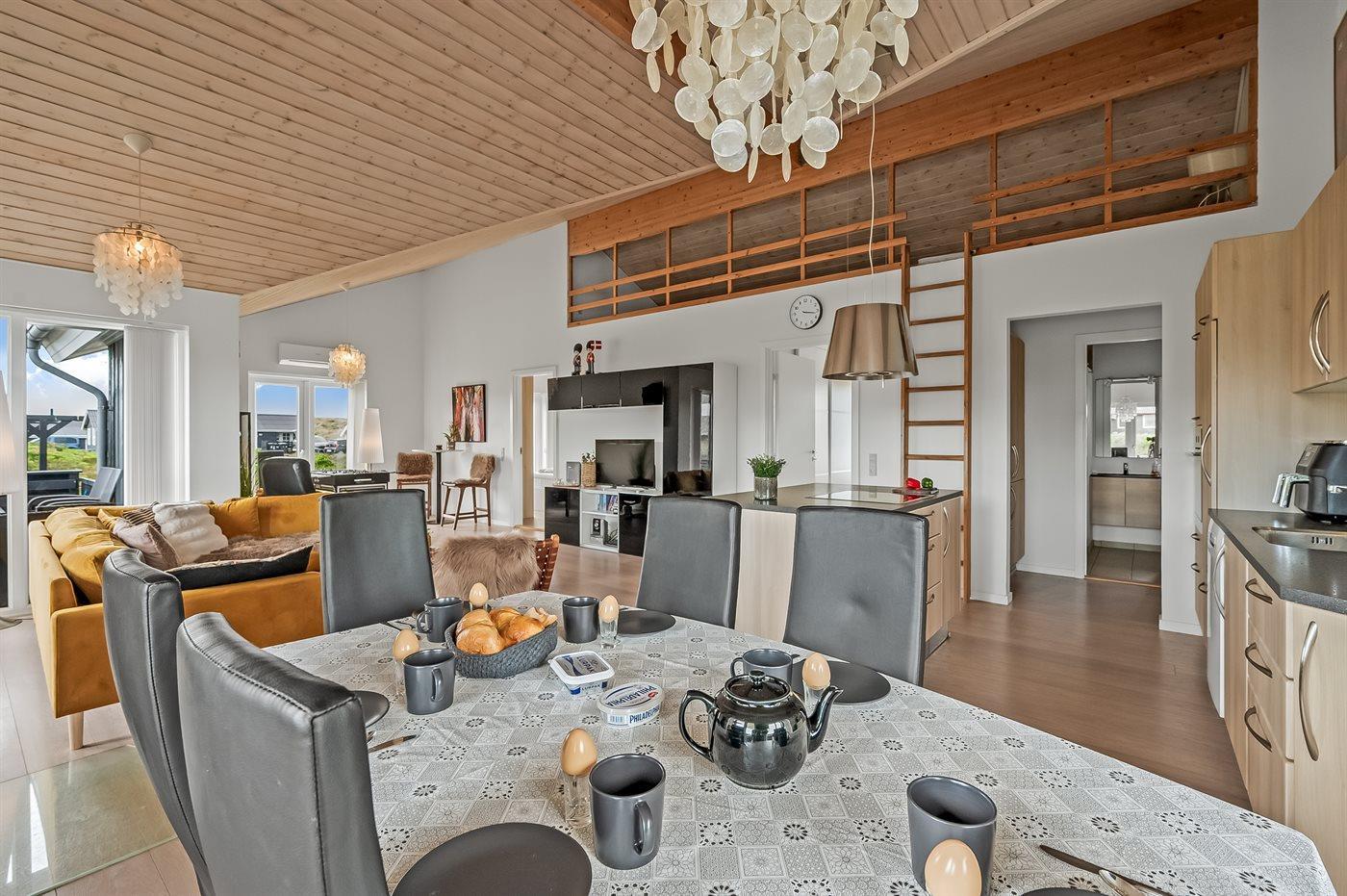 Indenfor i sommerhuset venter dig et stort og lyst køkken-alrum, hvor I kan slappe af, nyde hinandens selskab, samt forberede og nyde måltiderne sammen. Køkkenet er fuldt udstyret med alt, hvad I behøver for at lave lækre måltider.