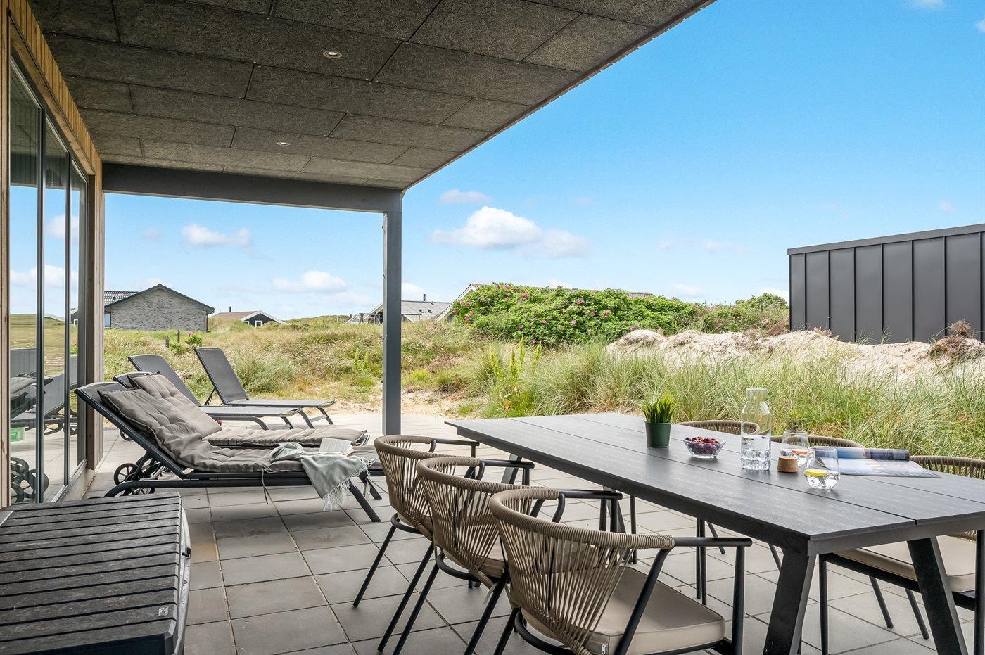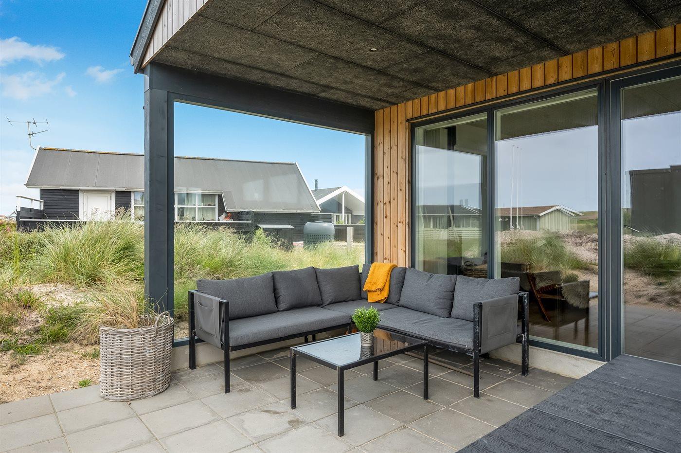 Fra husets lækre terrassemiljø kan du nyde udsigten over klitlandskabet, og vil du for alvor skrue op for luksussen skal du tænde for den udendørs spa og sauna. Dækket af det varme vand kan du slappe fuldstændig af, og om aftenen er der frit udsyn til den smukke, klare stjernehimmel. På terrassen finder du også en udendørs bruser, hvor du kan skylle saltvandet af kroppen og sandet af fødderne, når du har taget en dukkert i Vesterhavet. Du kan også vælge at tage dit morgenbad under åben himmel. Udendørsbruseren kan benyttes fra april til november.