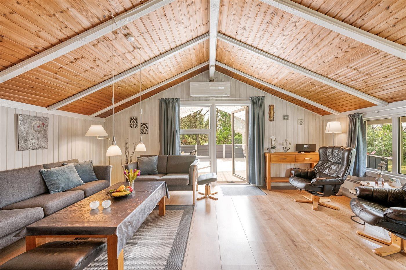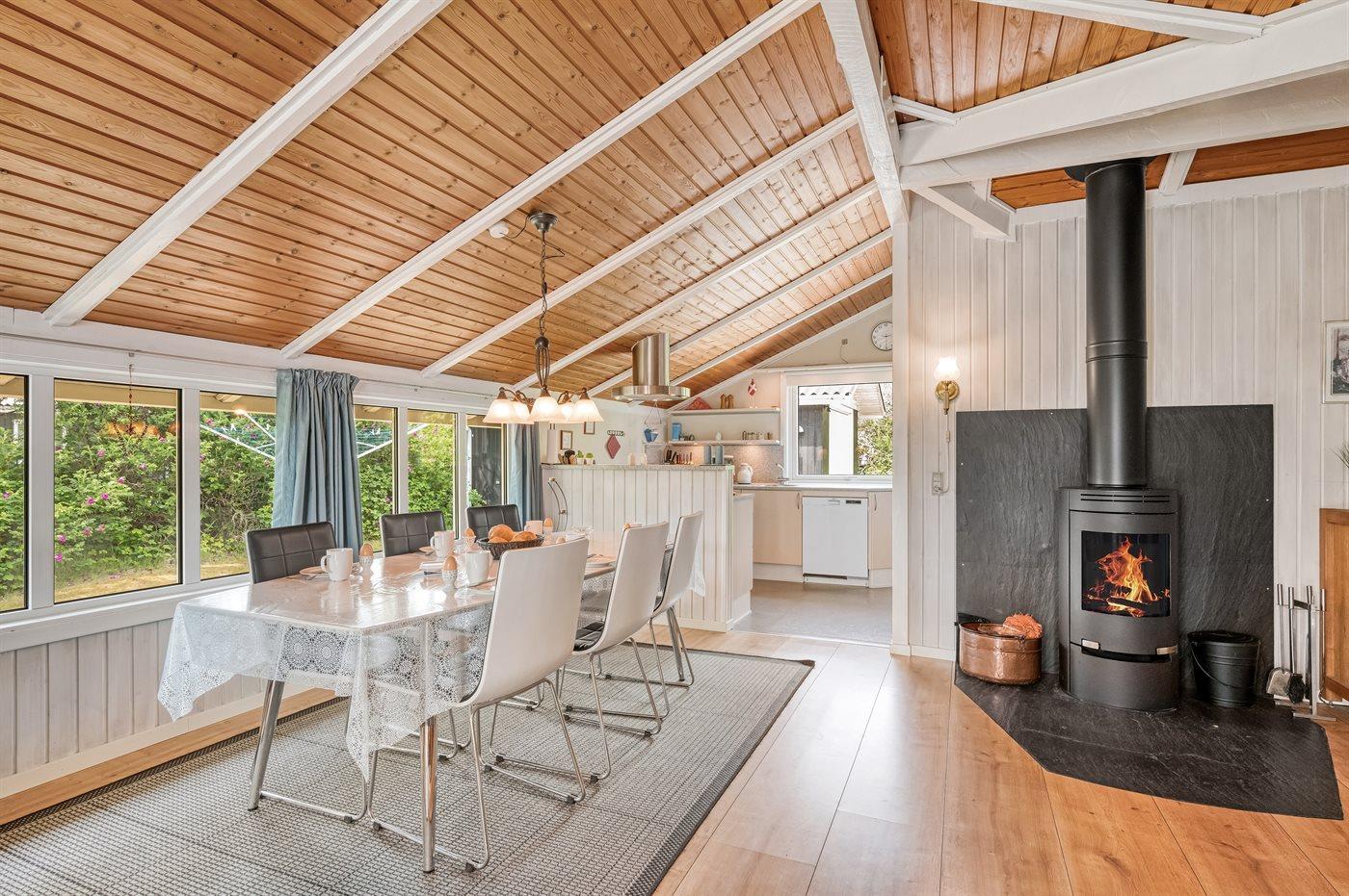 Flot sommerhus i Bjerregård med sauna, brændeovn og stor terrasse nær hav og fjord.