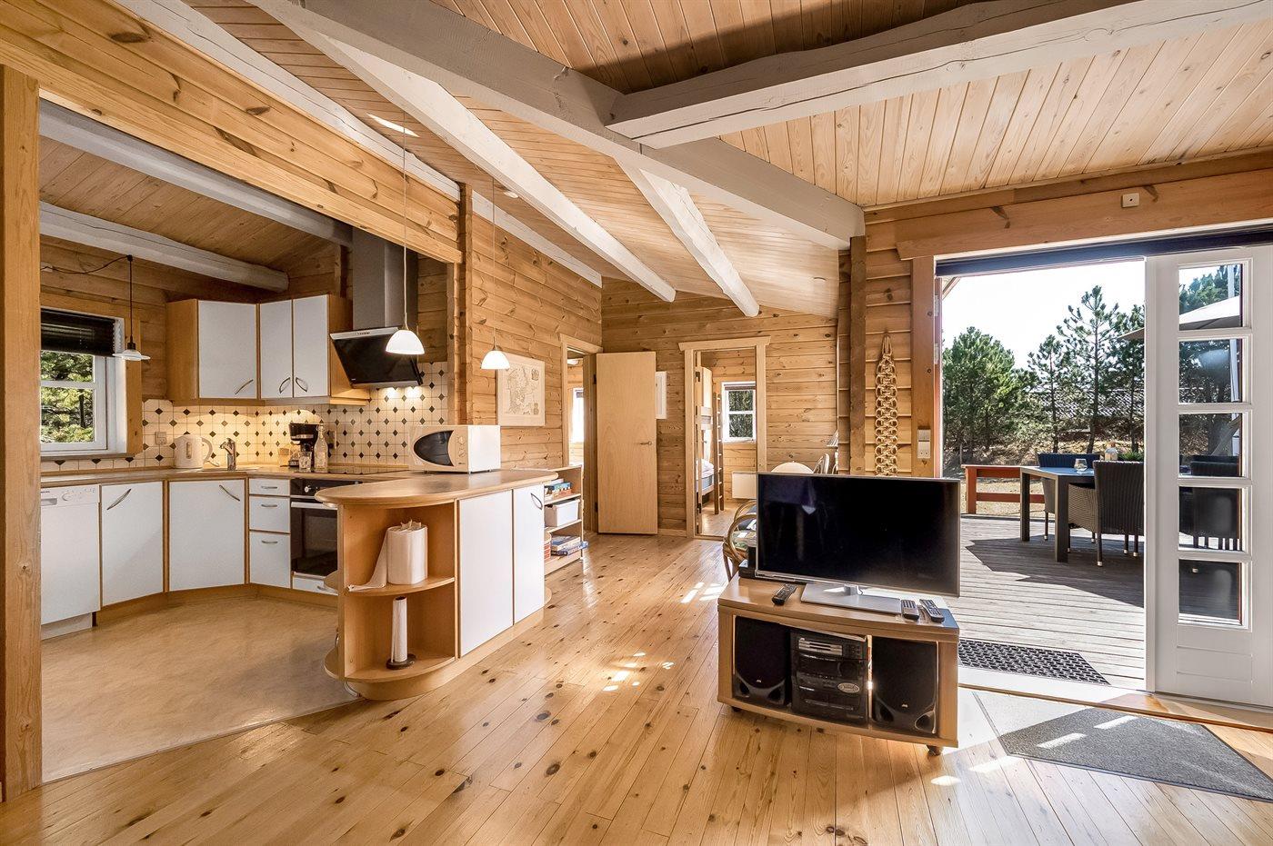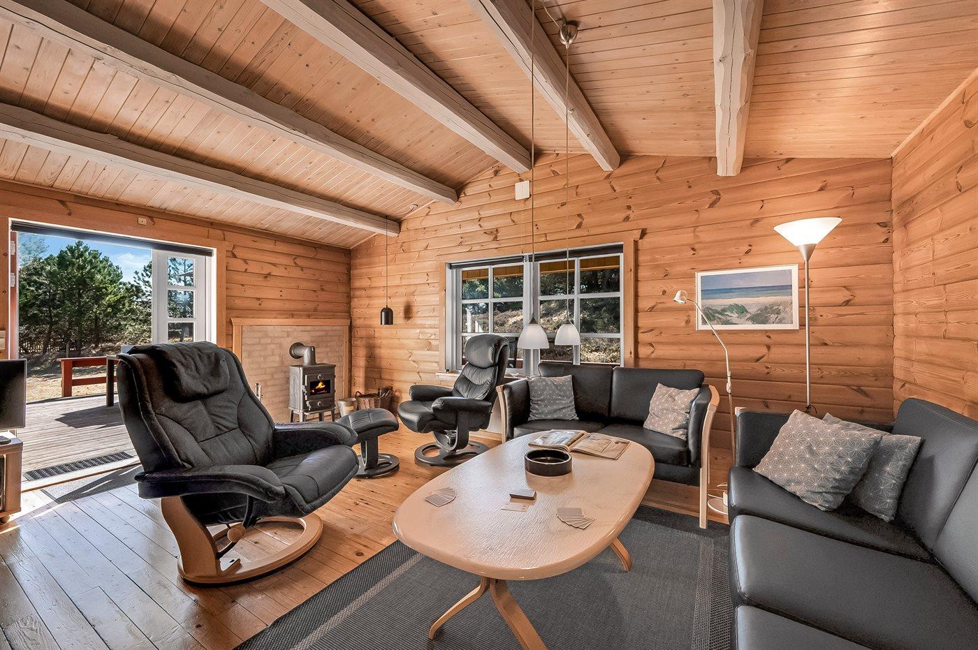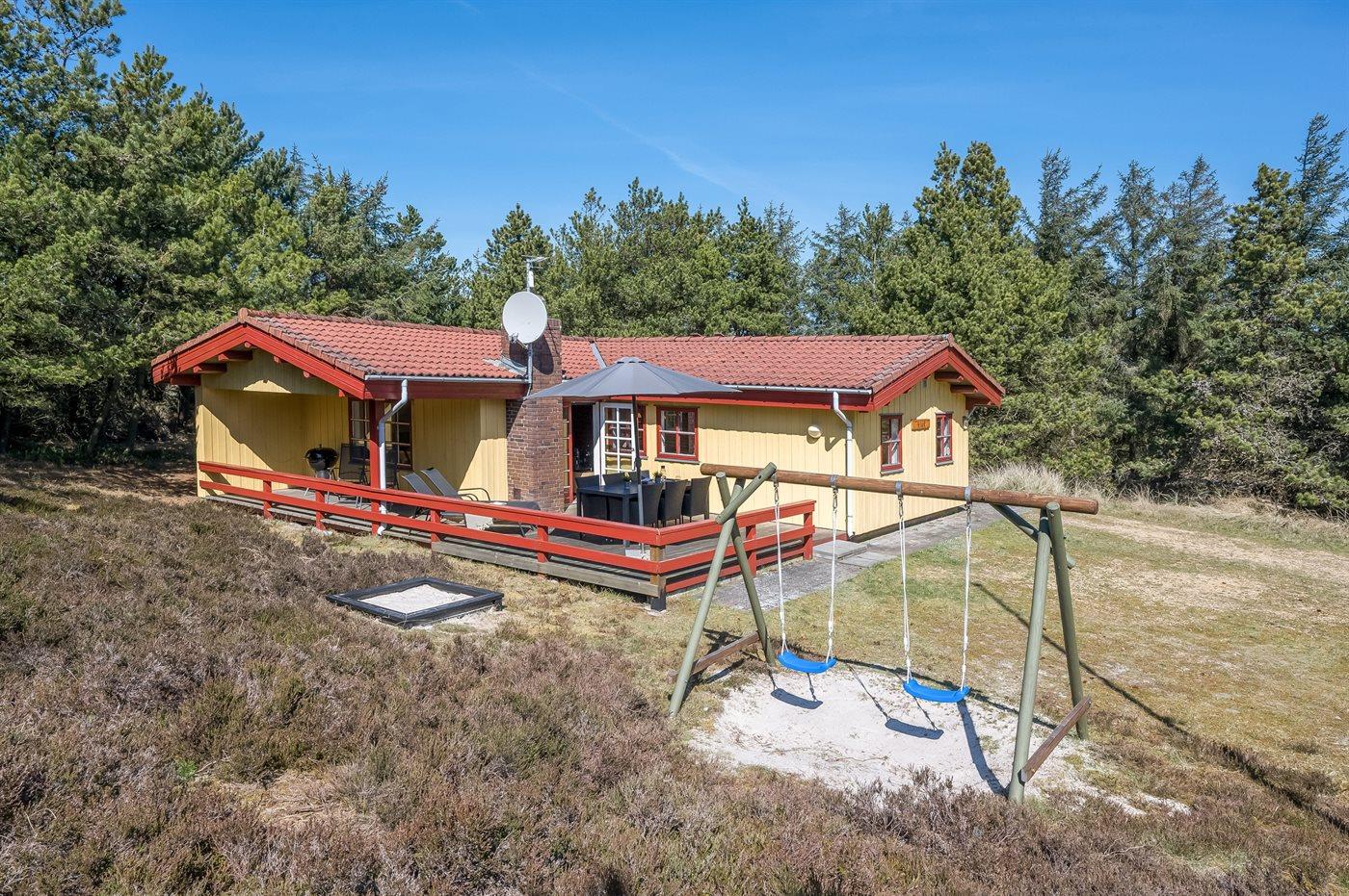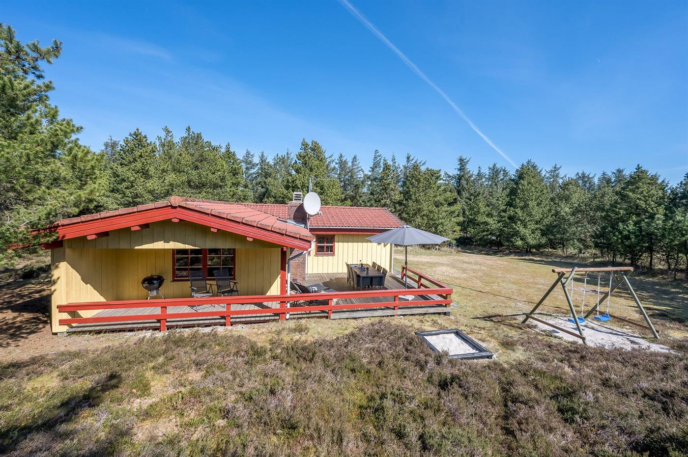 Dette pæne og hyggeligt indrettede sommerhus ligger på en stor lyngklædt naturgrund, som er omgivet af træer og buske og med gode læforhold - kun få minutters gang fra den kilometerlange, sandstrand med det fineste hvide sand. Til huset hører såvel åben som overdækket terrasse med havemøbler og på grunden findes der sandkasse og gynge til de mindste feriegæster. Det rummelige køkken er kombineret med spise-opholdsstuen og bl.a. udstyret med opvaskemaskine, mikrobølgeovn, lille fryser, varmluftovn og komfur med keramiske kogeplader. I spise-/opholdsstuen, hvorfra der er direkte adgang til den åbne terrasse, finder I brændeovn, TV med parabol (digital) og stereoanlæg. Huset er indrettet med 3 soveværelser; 2 med dobbeltseng og 1 med køjeseng. Badeværelse med gulvvarme og bruseniche. Af yderligere udstyr kan gratis, trådløs internetforbindelse (computer skal medbringes), vaskemaskine, tørretumbler, barneseng samt høj barnestol nævnes og der er installeret energibesparende varmepumpe. Et dejligt sommerhus ved Vestkysten - som med sine strande, klitter og den flotte jyske natur er det perfekte udgangspunkt for gode ferieoplevelser i naturen. Den gamle købstad Ringkøbing, med de velkendte røde tage, er et besøg værd. Om aftenen kan I gå en tur sammen med "Vægterne" og indsnuse den specielle atmosfære blandt byens mange gamle huse. I bør også tage turen til Hvide Sande og se slusen, Fiskeriets Hus og den aktive fiskerihavn. Blot en times kørsel fra huset ligger Legoland og Givskud Zoo.