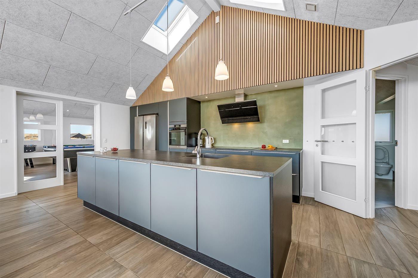 Køkkenet er udstyret med 1 amerikansk køleskab. Der er 4 induktionskogeplader, varmluftovn, mikrobølgeovn samt opvaskemaskine.
