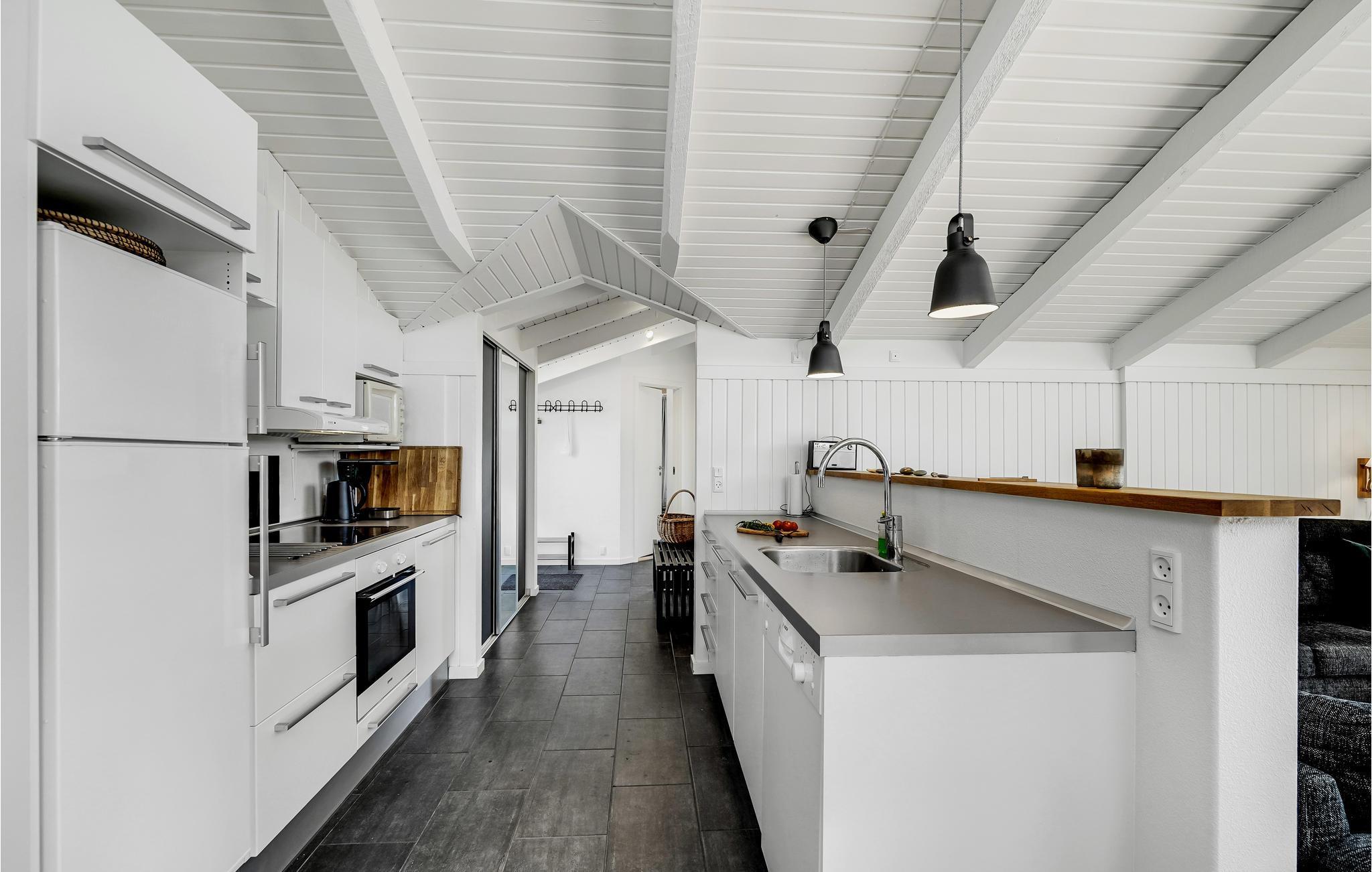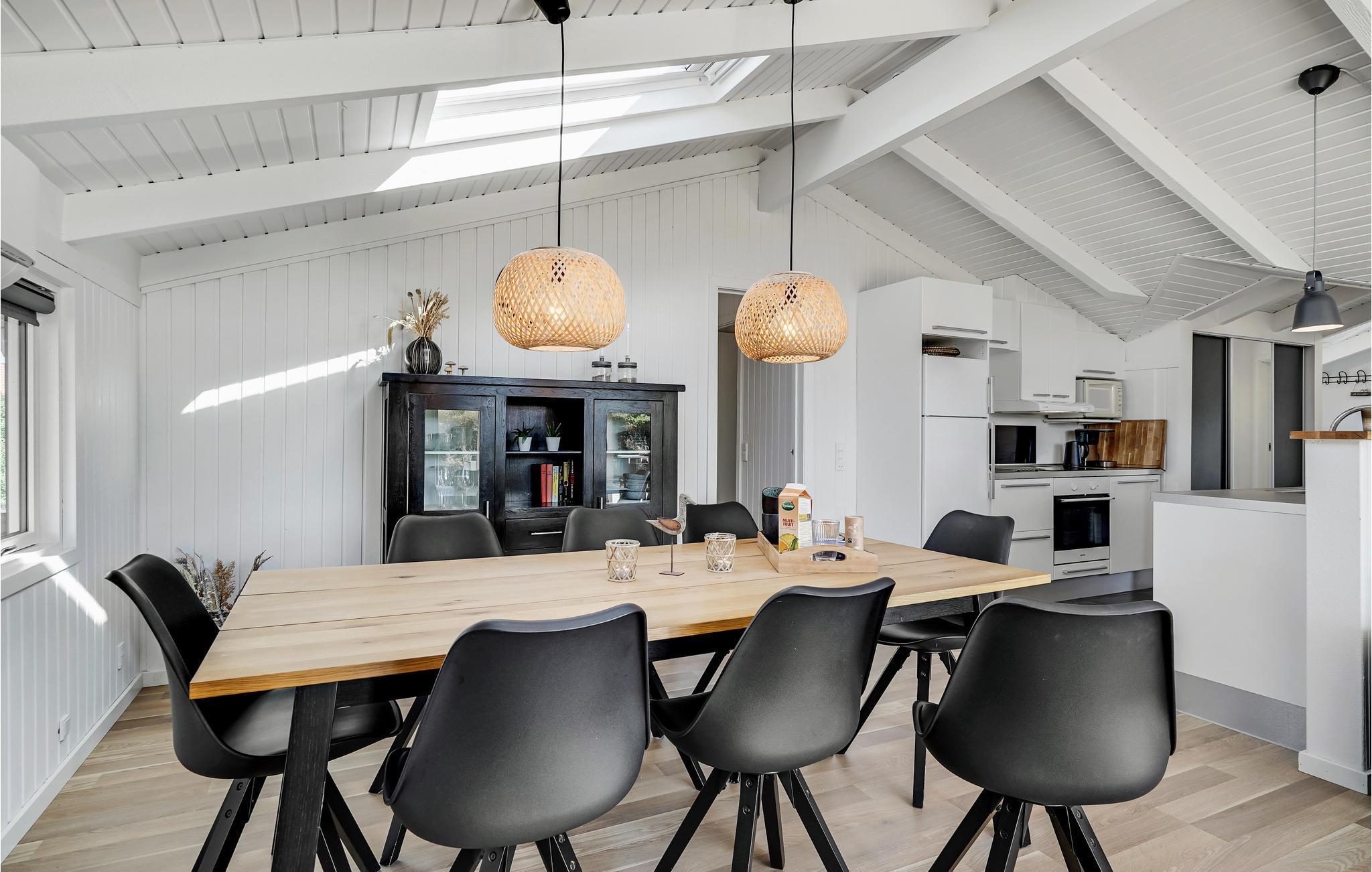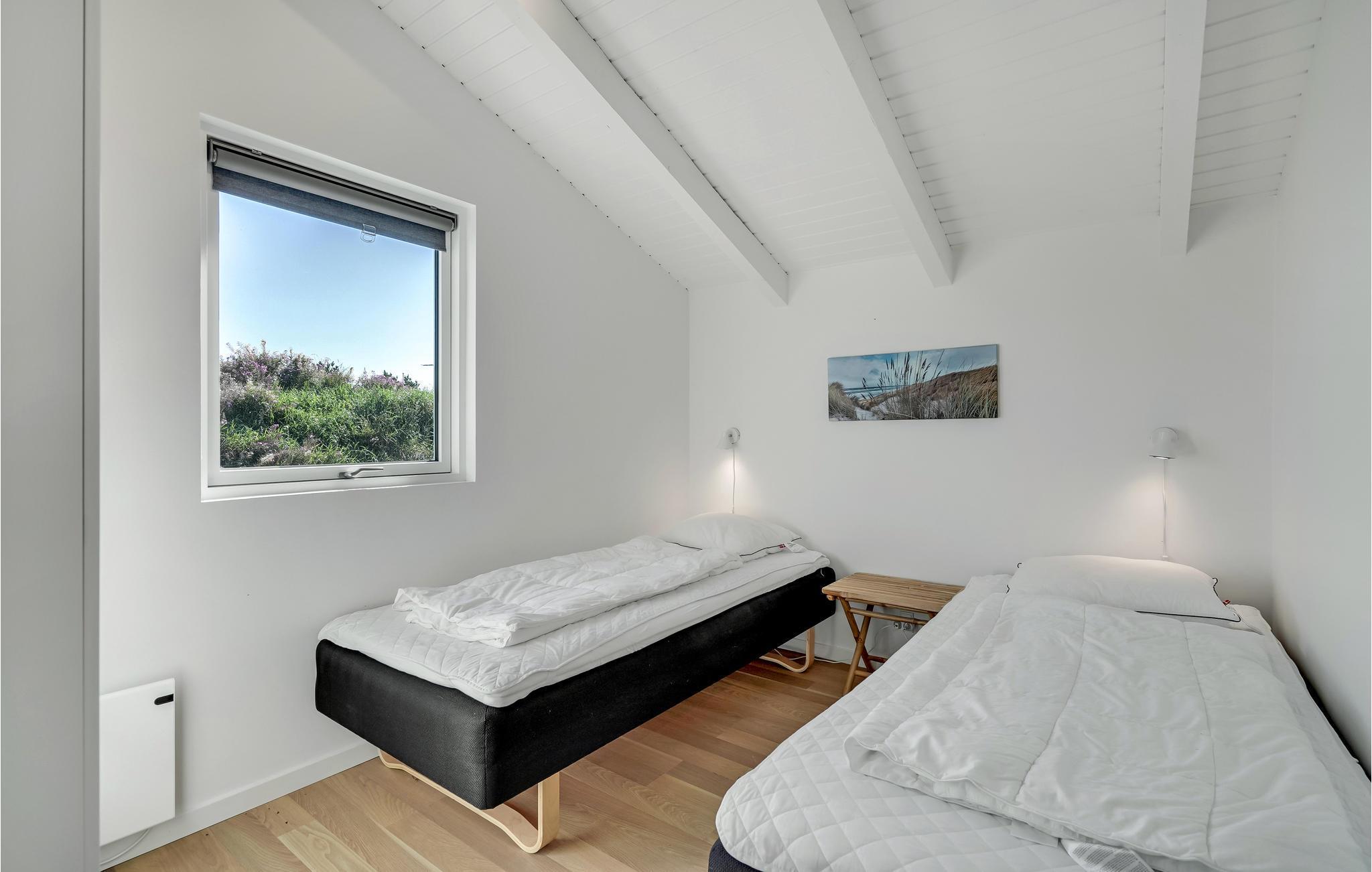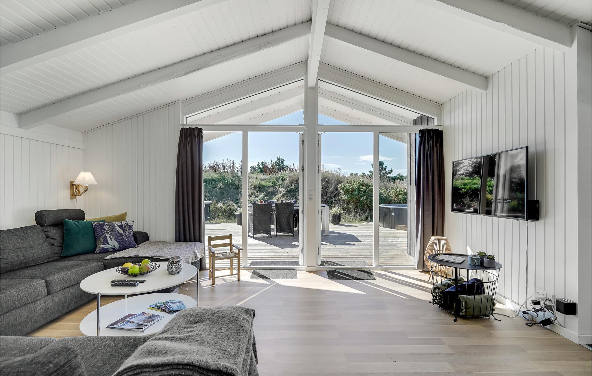 I Bjerregård ligger dette skønne feriehus, hvor I kan tage på ferie med den store familie eller to familier på tur. Her finder I alt, hvad I skal bruge til en sjov og afslappende ferie. I det indbydende lyse fællesrum kan I samles om madlavningen, dagens måltider, hyggelige brætspil eller afslapning i sofaerne. Herfra er der adgang til den store terrasse, som også byder på mange gode muligheder. Omgivet af klitterne kan I grille og nyde sommerens måltider. Små børn kan se frem til en dejlig sandkasse og en sansegynge, hvor de nemt kan få tiden til at gå. Glæd jer til at benytte saunaen og sæt jer derefter til rette i vildmarksbadet på terrassen.