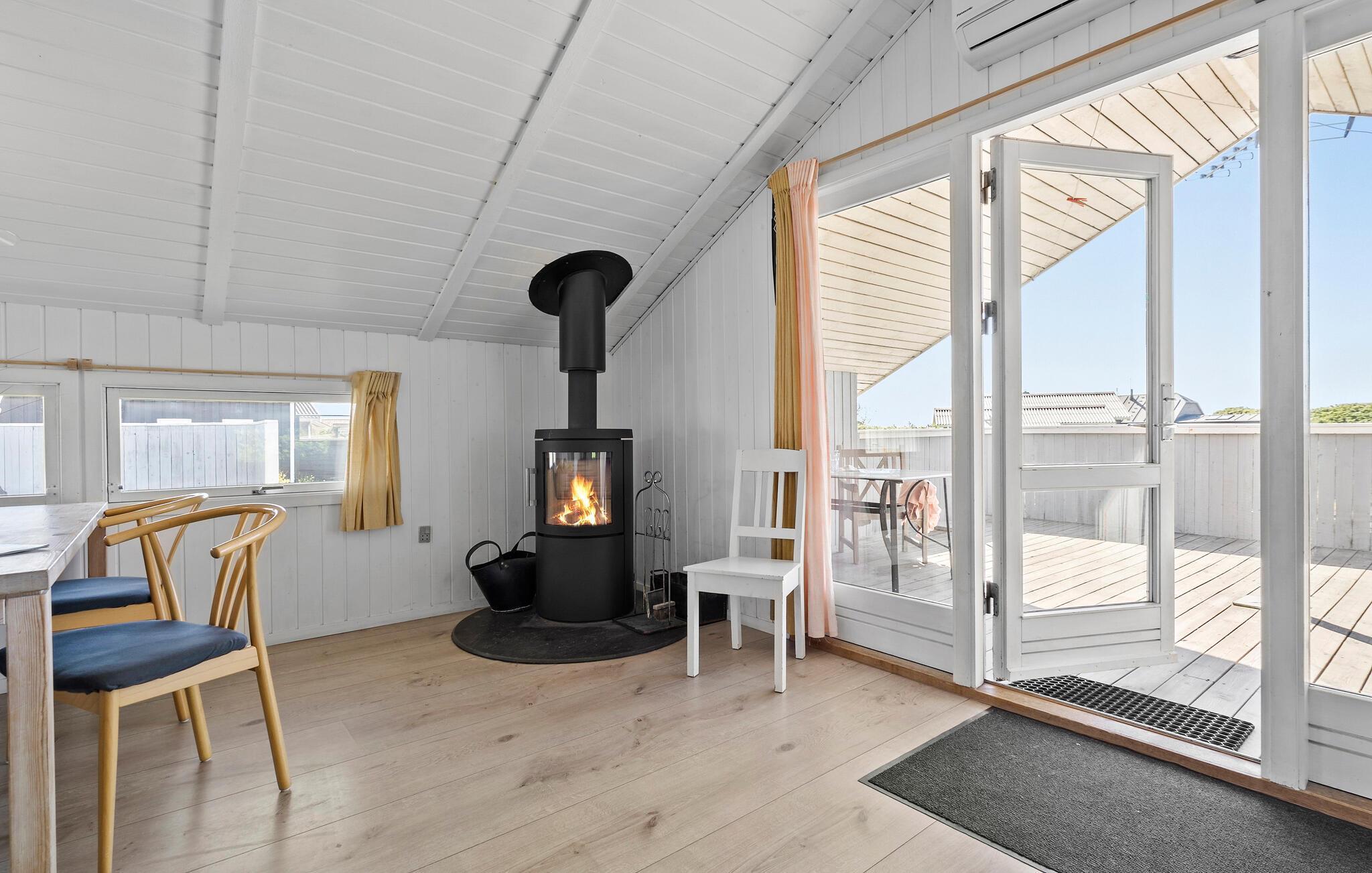 Hyggeligt træhus tæt på Vesterhavet med åben terrasse, brændeovn og WiFi i rolige omgivelser ved Hvide Sande.