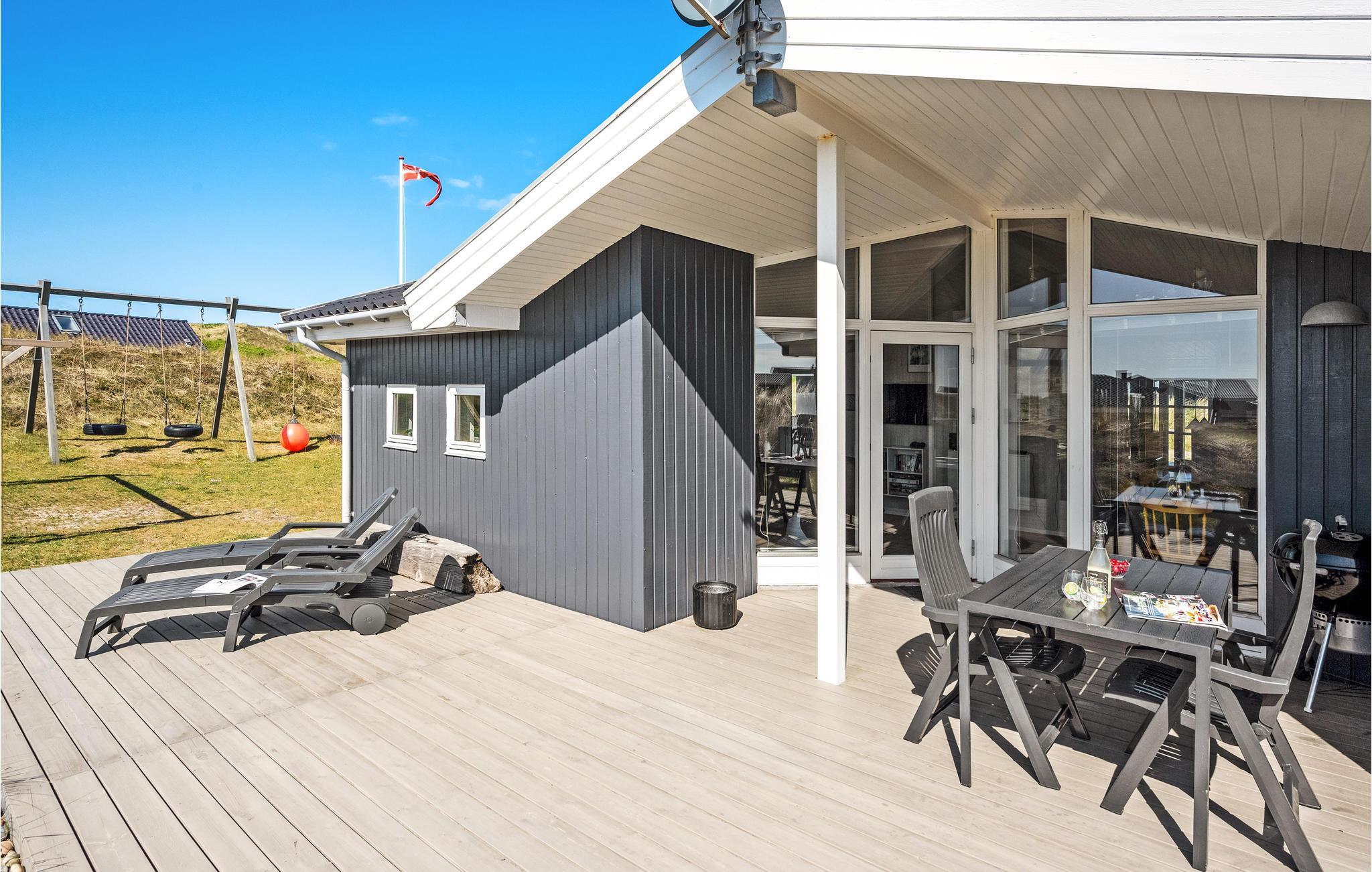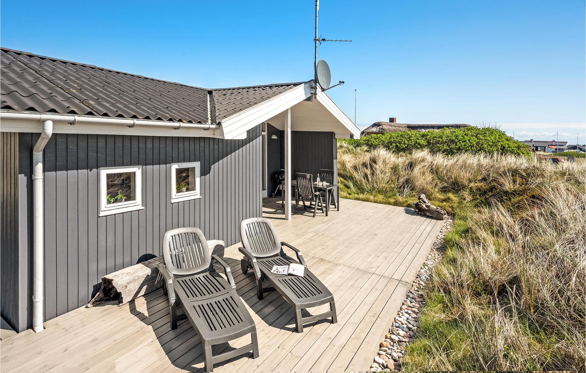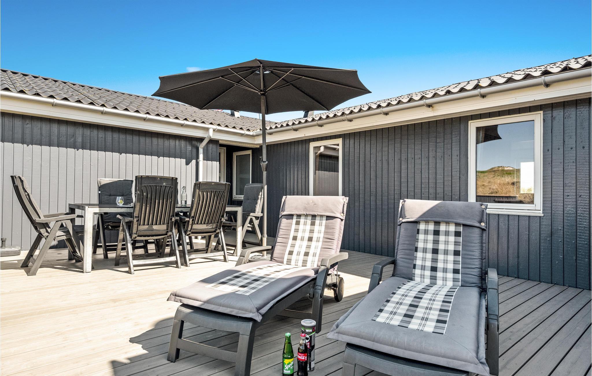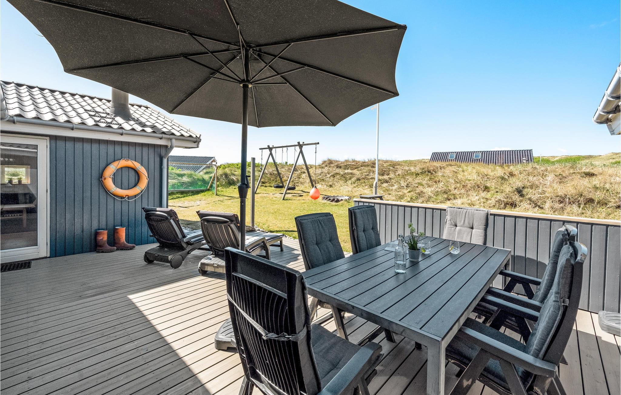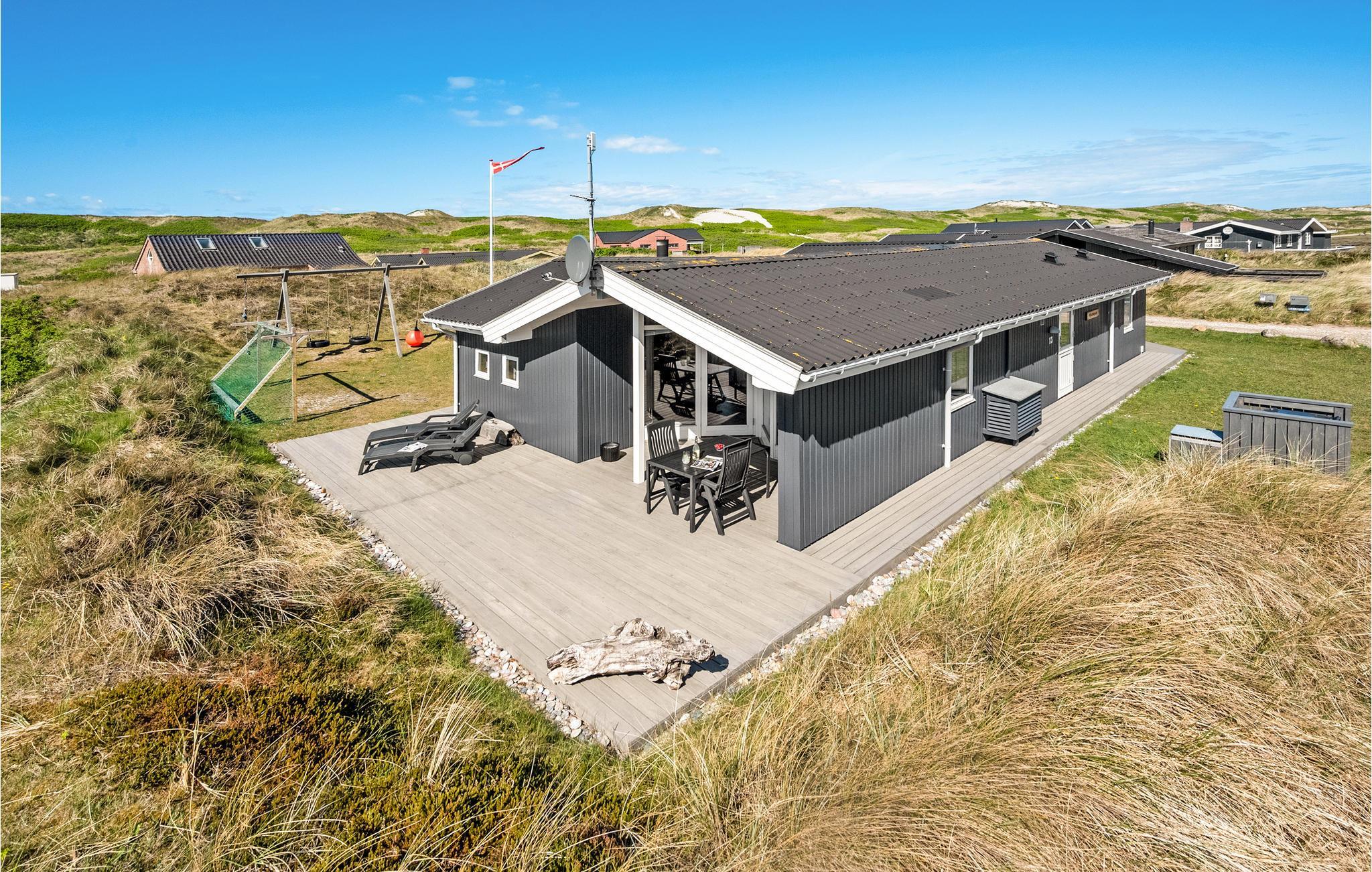 Dette skønne og meget velholdte feriehus, der ligger på en kuperet klitgrund, er lyst, venligt og moderne indrettet. Huset ligger for enden af en stille vej i rolige omgivelser, ud mod et klitareal og meget tæt på Vesterhavet, klitterne og den brede, hvide sandstrand. Her er flere skønne terrasser som indbyder til afslapning, solbadning og hyggelige grillaftner mens I kan sidde i læ for vinden og lytte til bølgerne der slår mod stranden. Huset rummer en stor, lys stue, i åben kombination med køkken og to komplette badeværelser, hvoraf det ene er med spa og det andet direkte adgang til sauna. Der er lagt vægt på kvalitet og hygge, wellness og komfort. I hele huset er der træ- og klinkegulve, og ingen faste tæpper. Ude og inde er der mange muligheder for aktiviteter for både børn og voksne. Et skønt sted til ferie, uanset årstid.