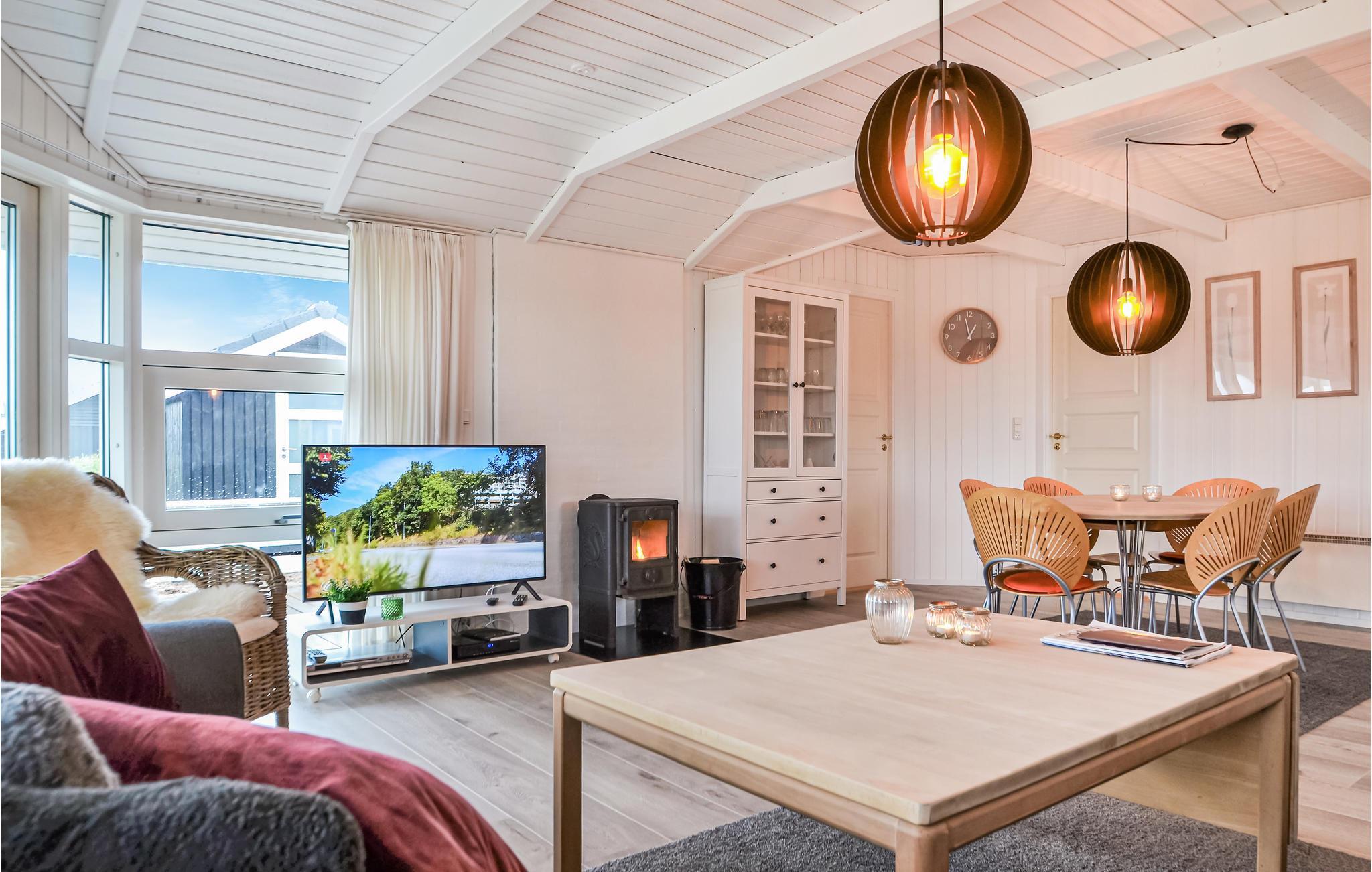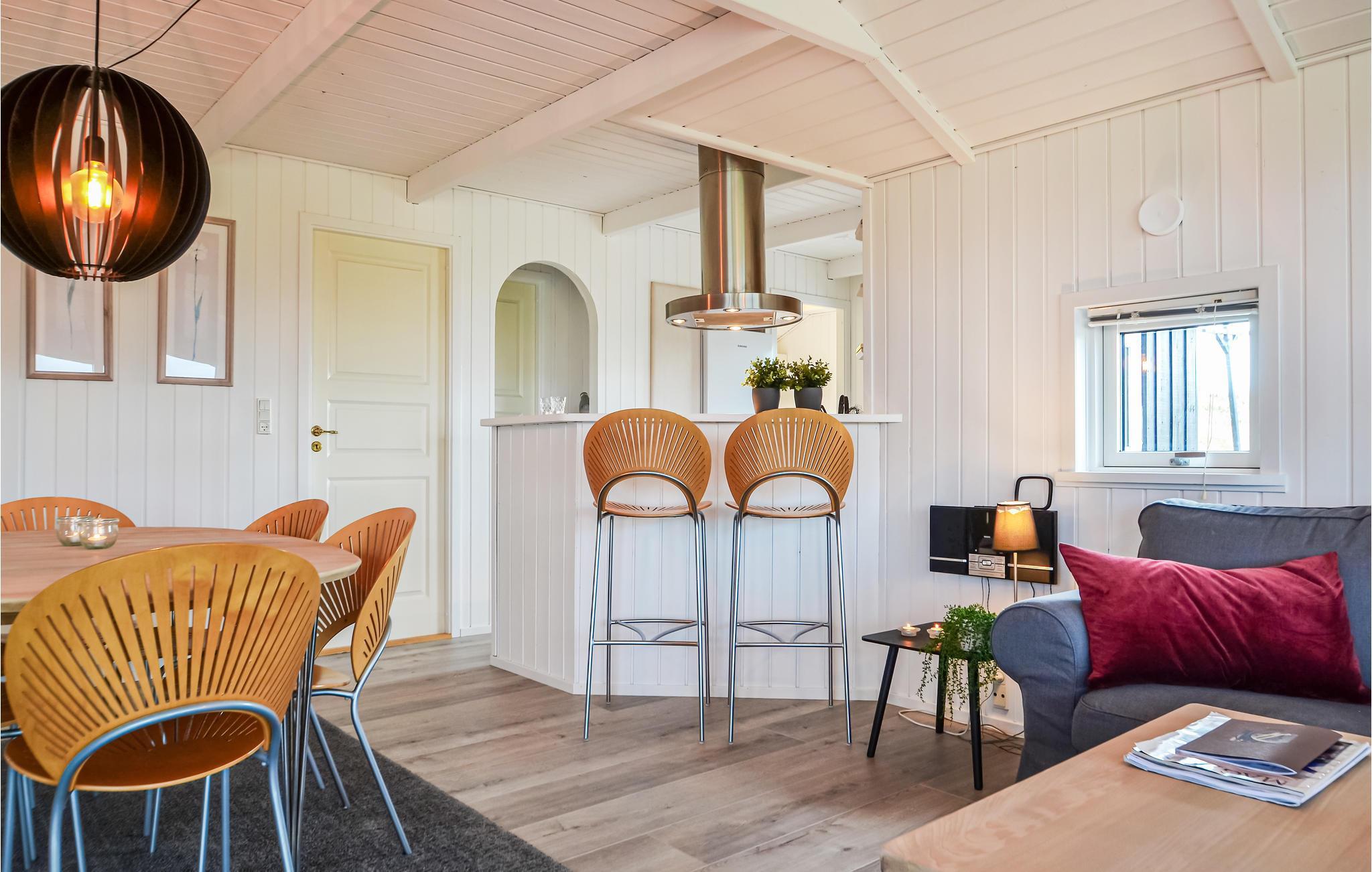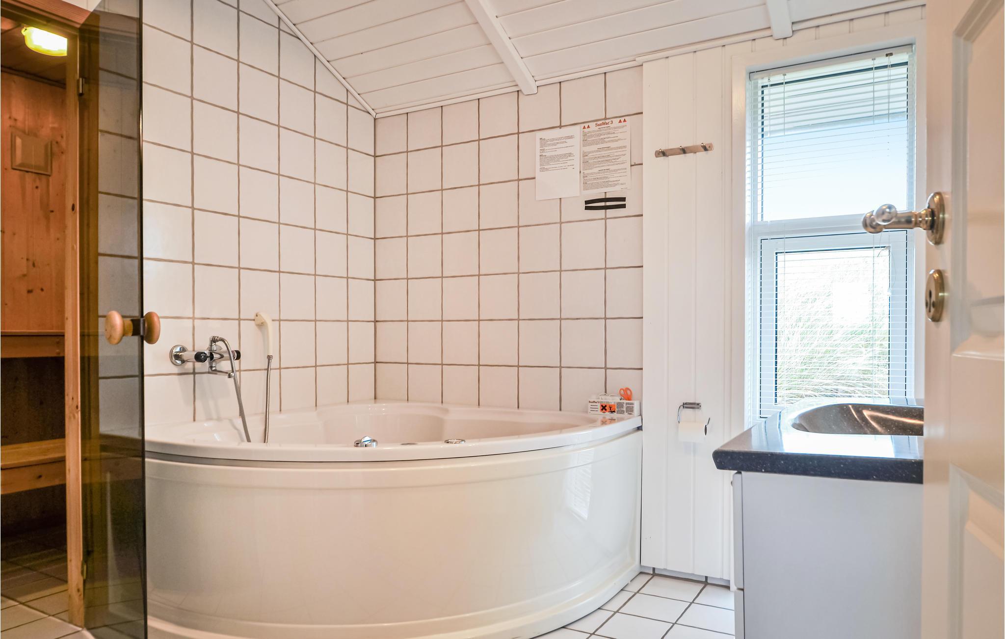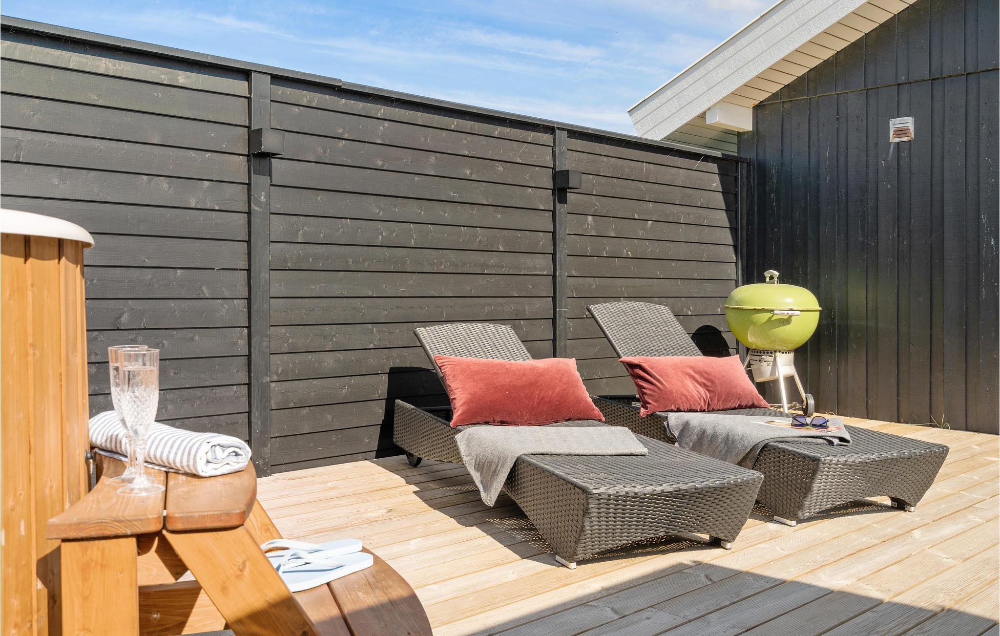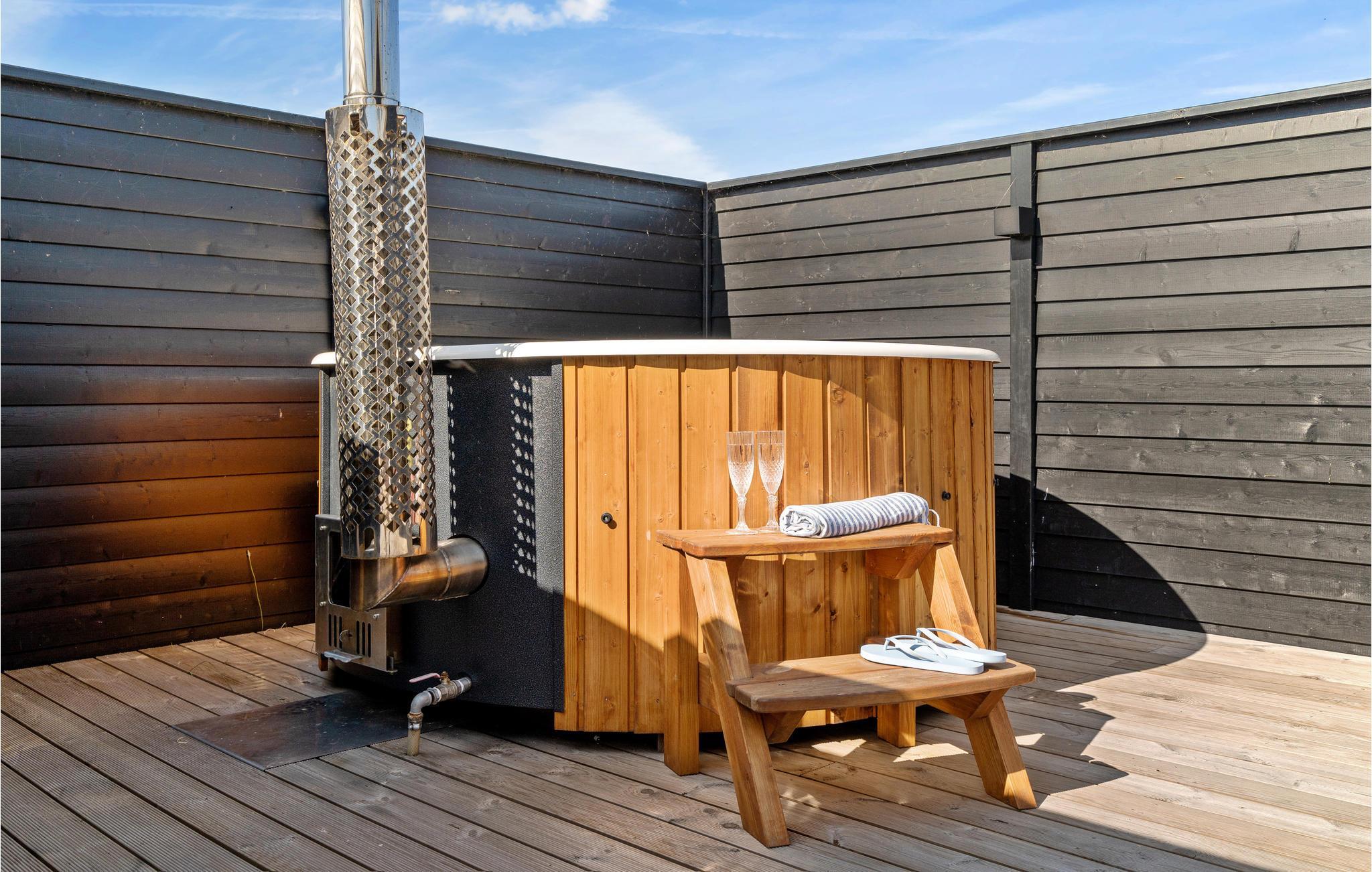 Huset er omgivet af en stor, lukket terrasse, der er delvis overdækket og udstyret med gode havemøbler og et vildmarksbad, hvor I rigtigt kan slappe af og komme helt ned i gear. Det er et moderne og velindrettet feriehus, som skaber mulighed for den allerbedste ferieoplevelse. Her findes bl.a. et dejligt stue/køkken med brændeovn, tre gode soverum samt et stort badeværelse med spabad og adgang til sauna. Tilbring en afslappende aften under åben himmel i vildmarksbadet. I annekset finder I endnu et soveværelse.