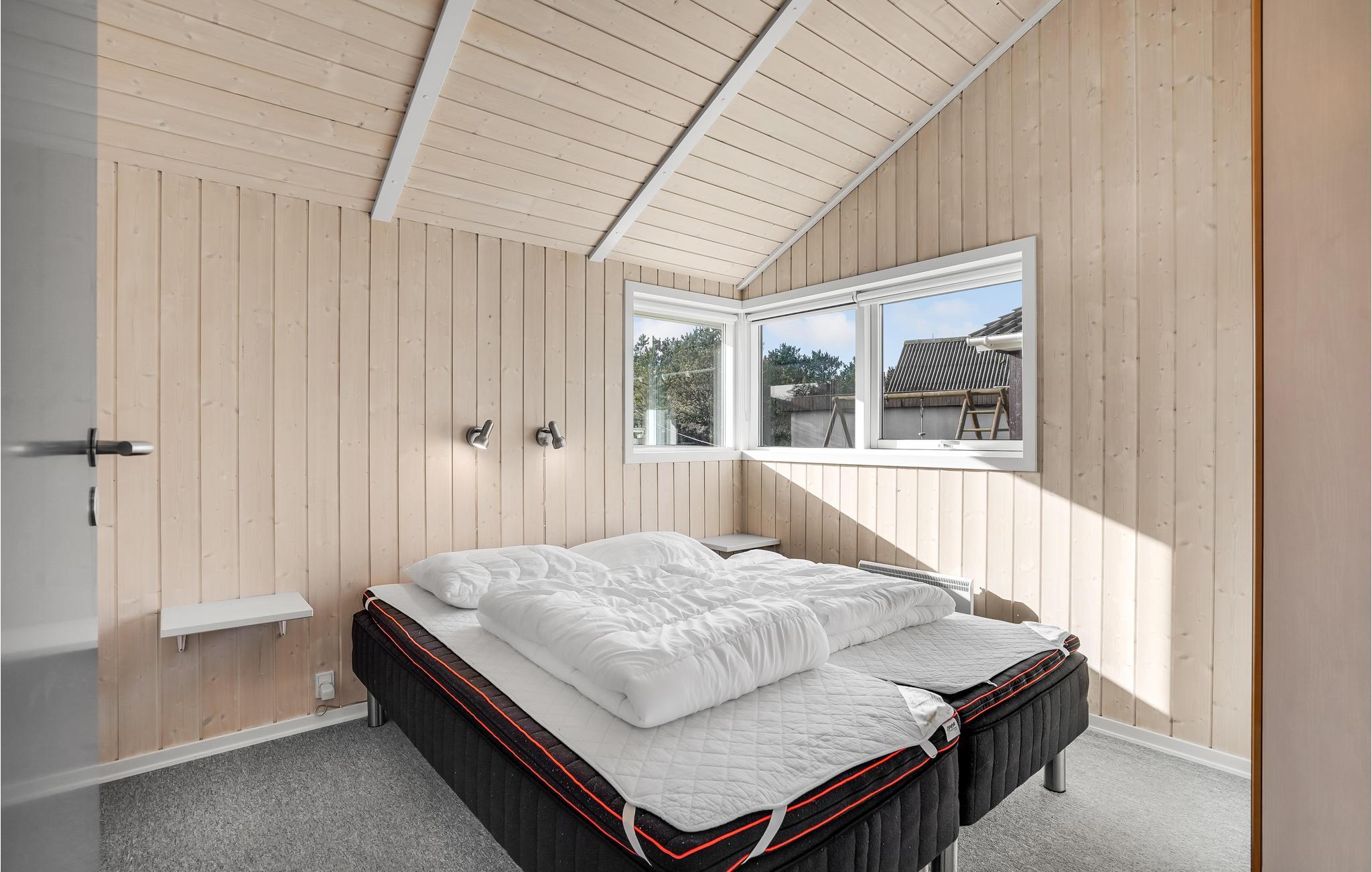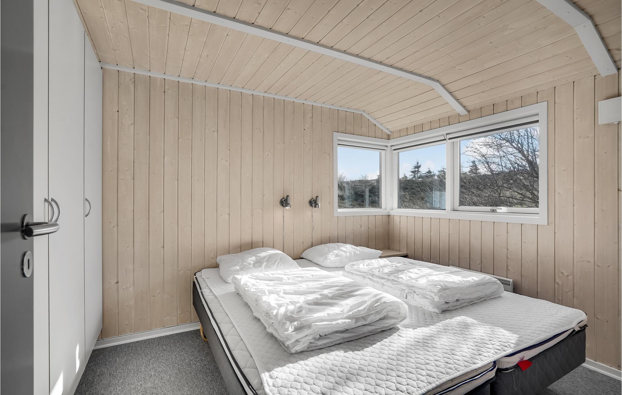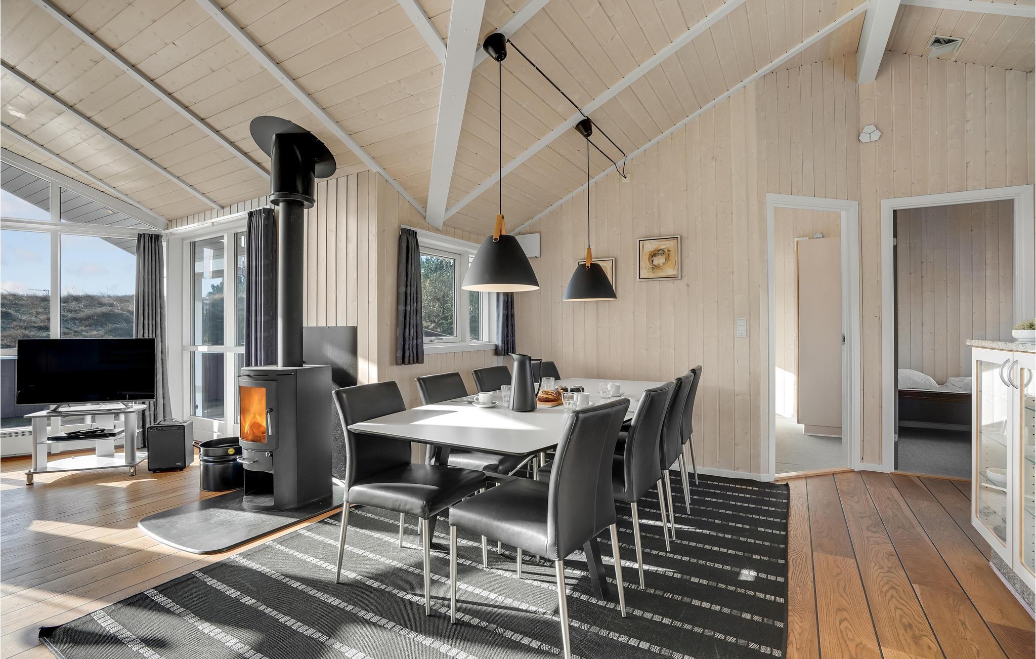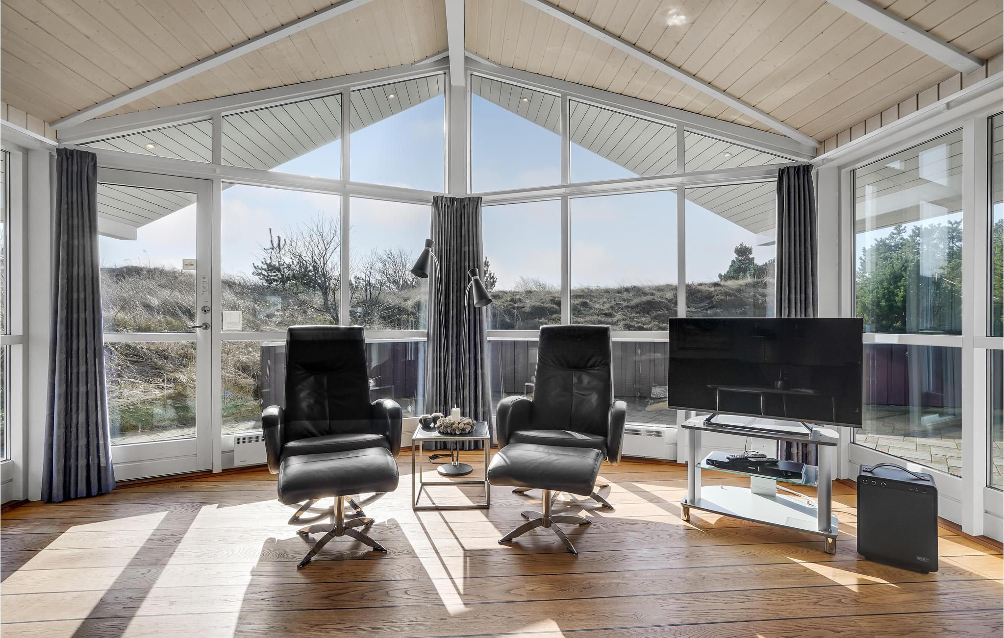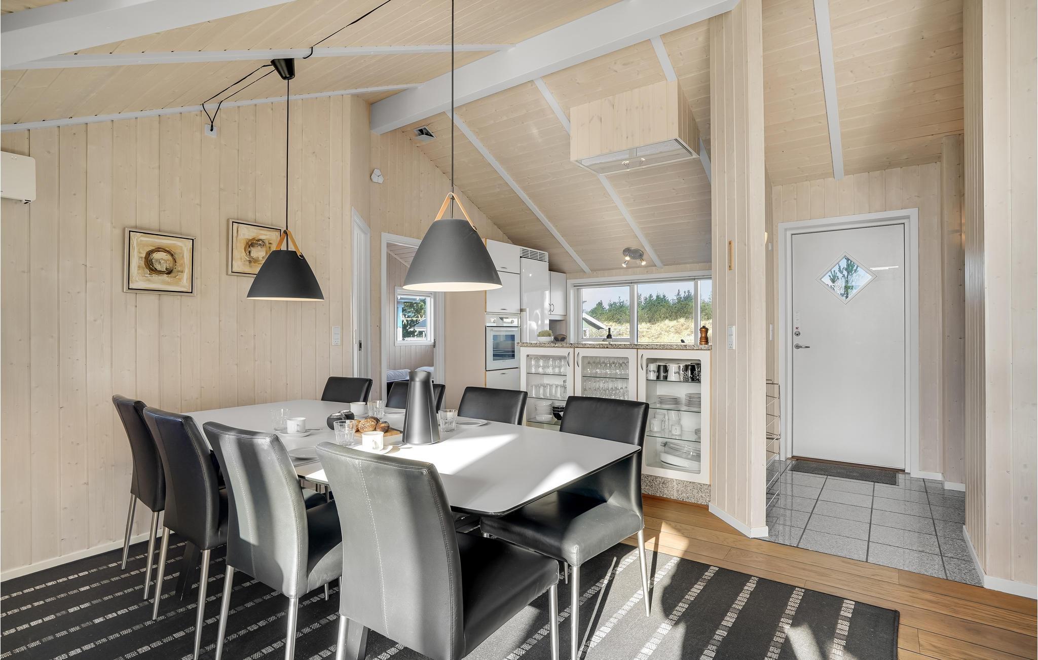 Dette flotte feriehus ligger på en let kuperet klitgrund i det skønne Bjerregård - midt i mellem hav og fjord. Det er spændende og charmerende indrettet med vægten lagt på god kvalitet. Der er et rummeligt og veludstyret køkken i åben forbindelse med spisestuen og stuen, som med et stort vinduesparti har et lækkert lysindfald, og nærmest trækker naturen ind i stuen, mens I nyder en stille stund foran tv’et eller brændeovnen. De otte sovepladser er fordelt i fire soveværelser, hvoraf to er med dobbeltseng og to er med hver to enkeltsenge. Ekstra tv med dvd-afspiller på hemsen.
